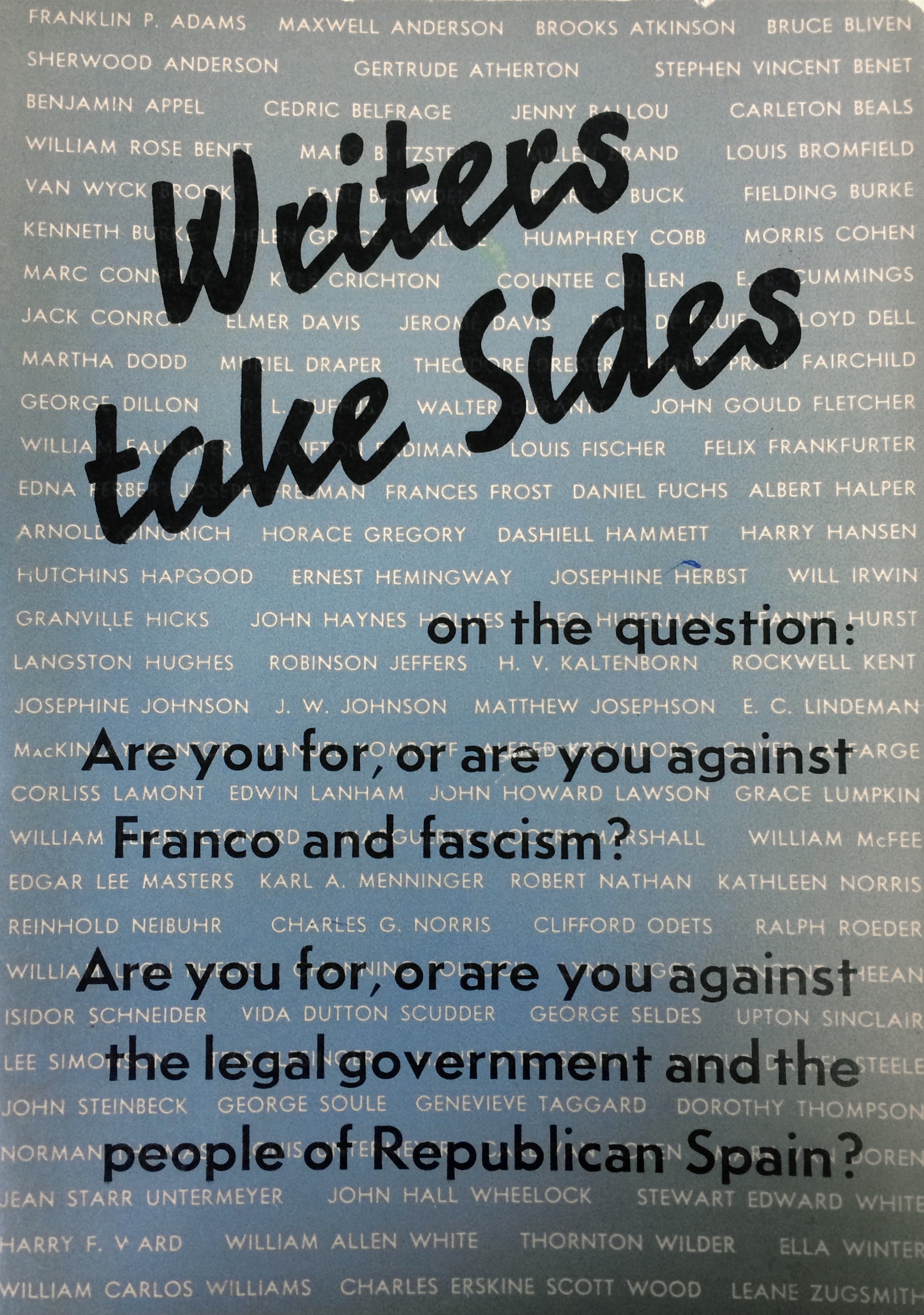 This book with 418 American authors weighing in on the Spanish Civil War was edited by Millen Brand, Dorothy Brewster, Harry Carlisle, and Groff Conklin, and published by the League Of American Writers in 1938. The featured voices include Gertrude Atherton, Brooks Atkinson, Carl Becker, Kenneth Burke, Countee Cullen, William Faulkner, Edna Ferber, Felix Frankfurter, Dashiell Hammett, Ernest Hemingway, Langston Hughes, James Weldon Johnson, Rockwell Kent, Stanley Kunitz, George Seldes, Upton Sinclair, John Steinbeck, Genevieve Taggard, Clara Weatherwax, and Richard Wright.