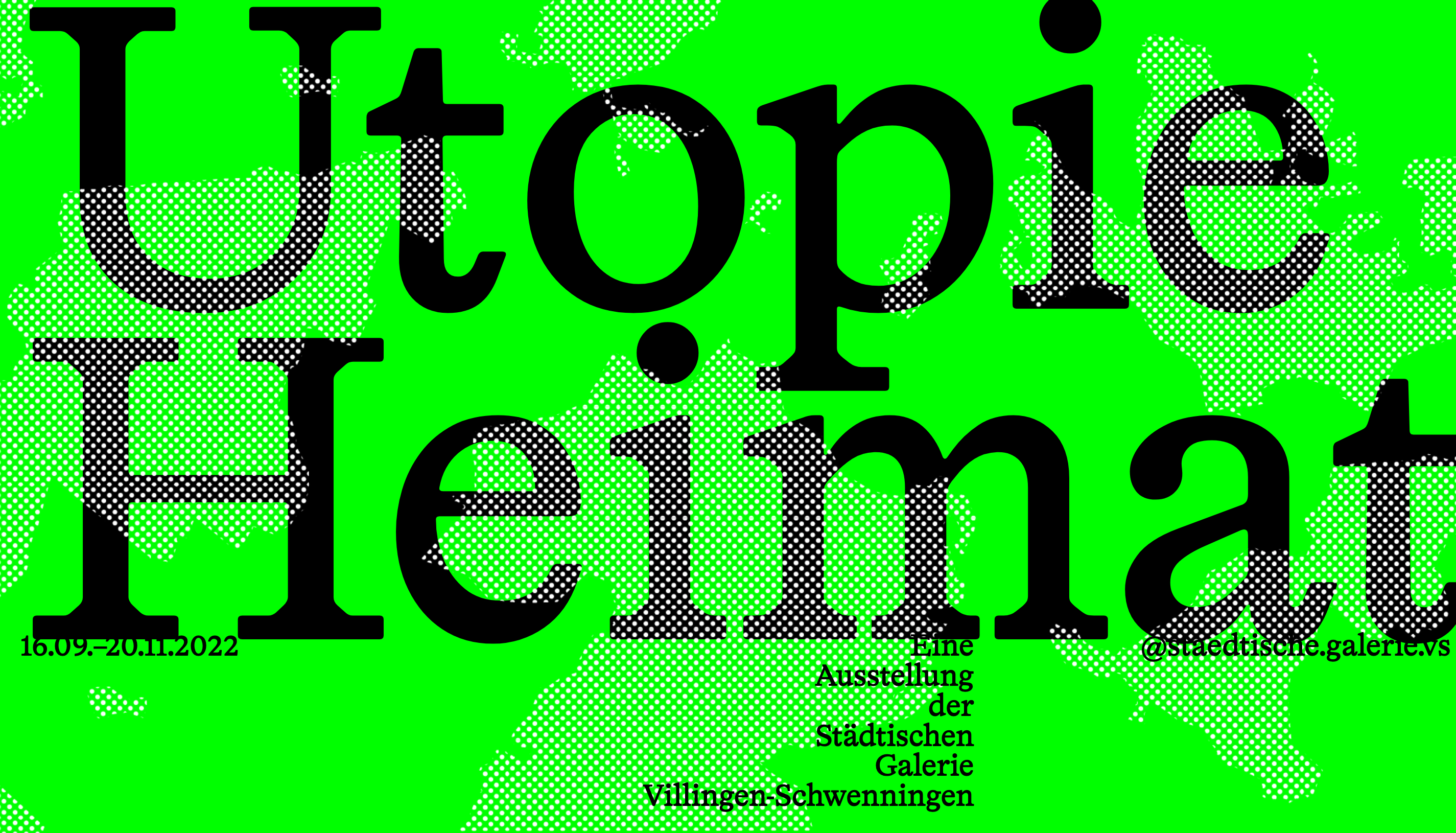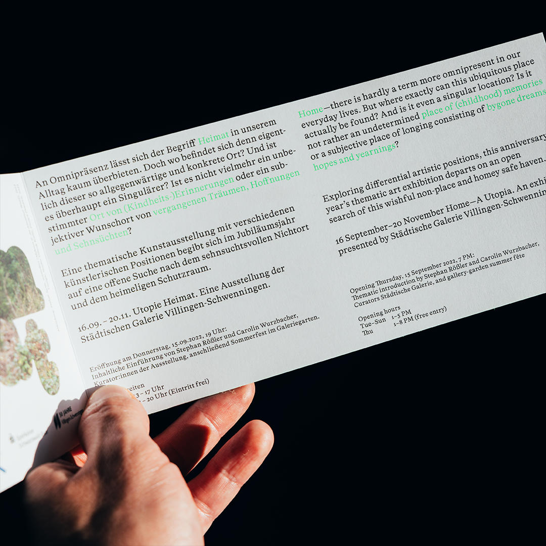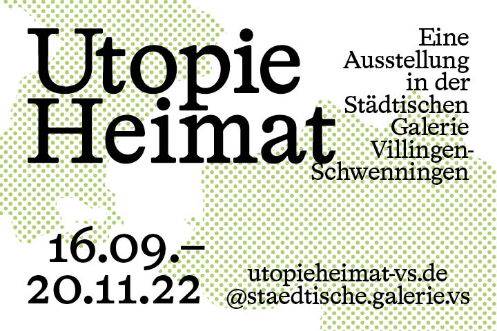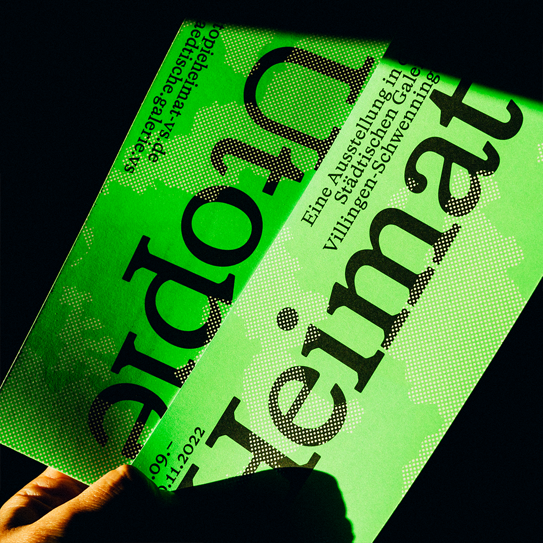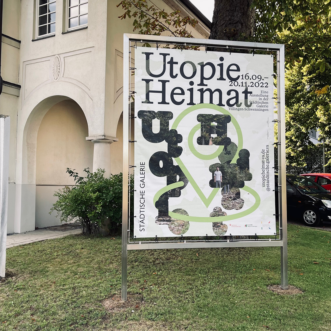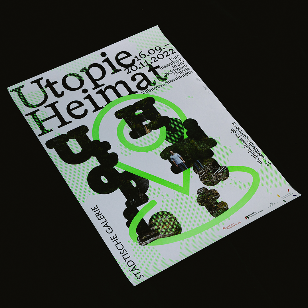 The Stuttgart-based design practice Studio Tillack Knöll was responsible for the communication design for the exhibition Utopie Heimat (Home—A Utopia), which included printed ephemera (flyer, poster, banner) as well as digital media (website, social media images, motion graphics). The exhibition took place from 16 September to 20 November 2022 at the Städtische Galerie der Stadt Villingen-Schwenningen and was curated by Stephan Rößler und Carolin Wurzbacher. The deliverables were set in HAL Timezone, published by HAL Typefaces.