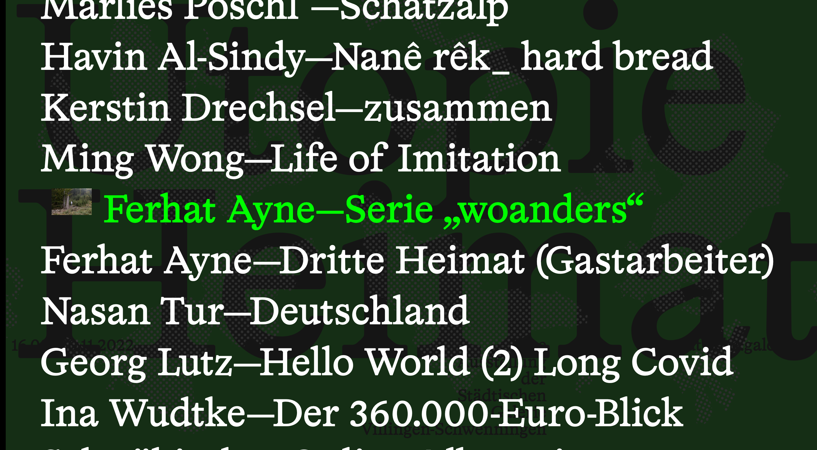 With artworks by Christian Jankowski, Ferhat Ayne, Georg Lutz, Havin Al Sindy, Ina Wudtke, Kerstin Drechsel, Marlies Pöschl, Ming Wong, Nasan Tur, Schwäbischer Online-Albverein, Silvio Motta