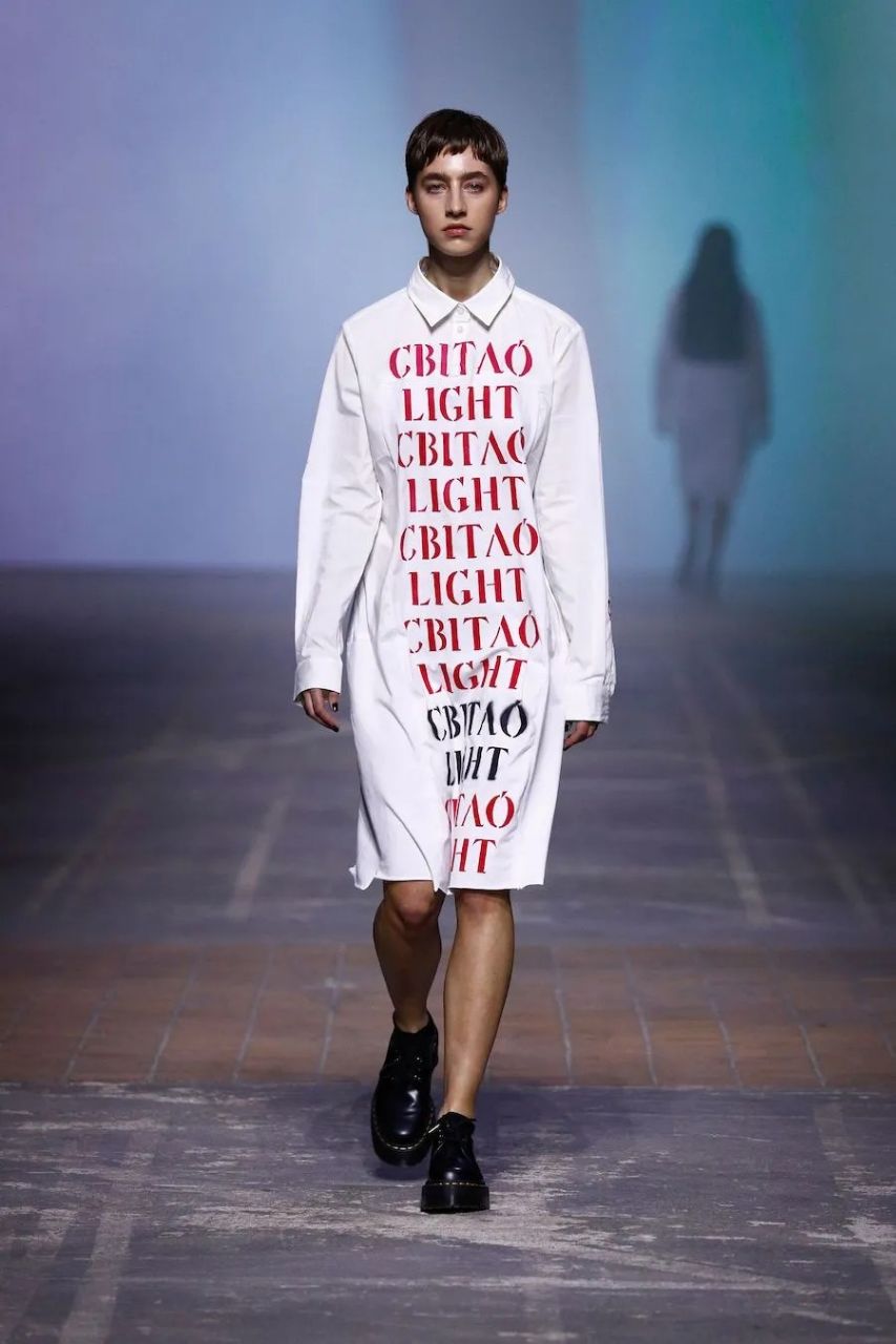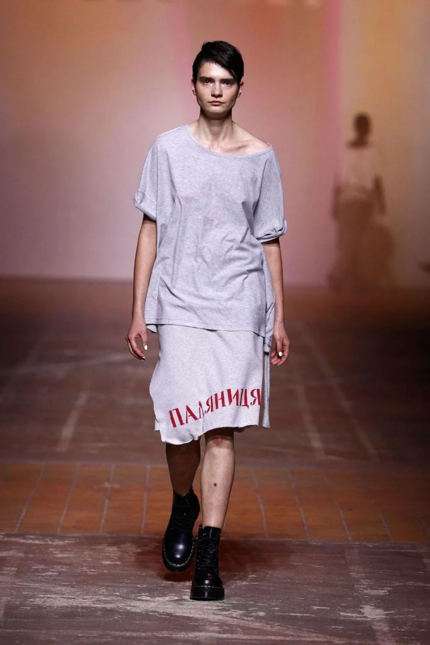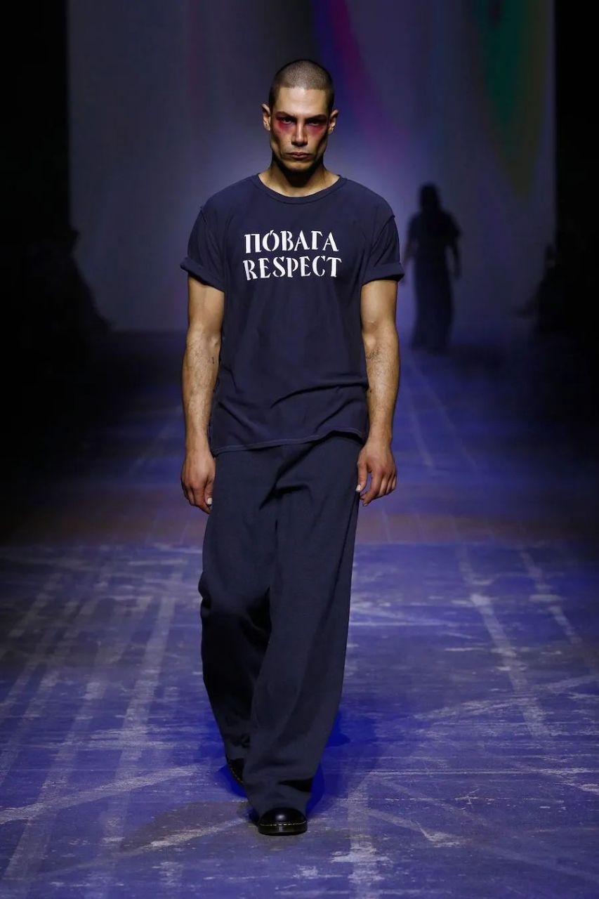 After Jean Gritsfeldt’s speech, sirens sounded, signaling an air raid alert. Models then presented the new collection in black, gray, beige, and white colors, featuring various inscriptions such as “language”, “light”, “Ukraine”, “respect”, “courage”, “happiness”, “freedom”, “unity”, “palyanycya”, and more. For the captions, the designer chose the Kalyna font from the Narbut alphabet revival, which, with its sharp and clear lines, emphasized the dramatic nature of the collection.
