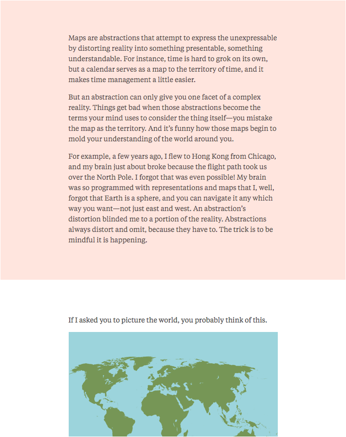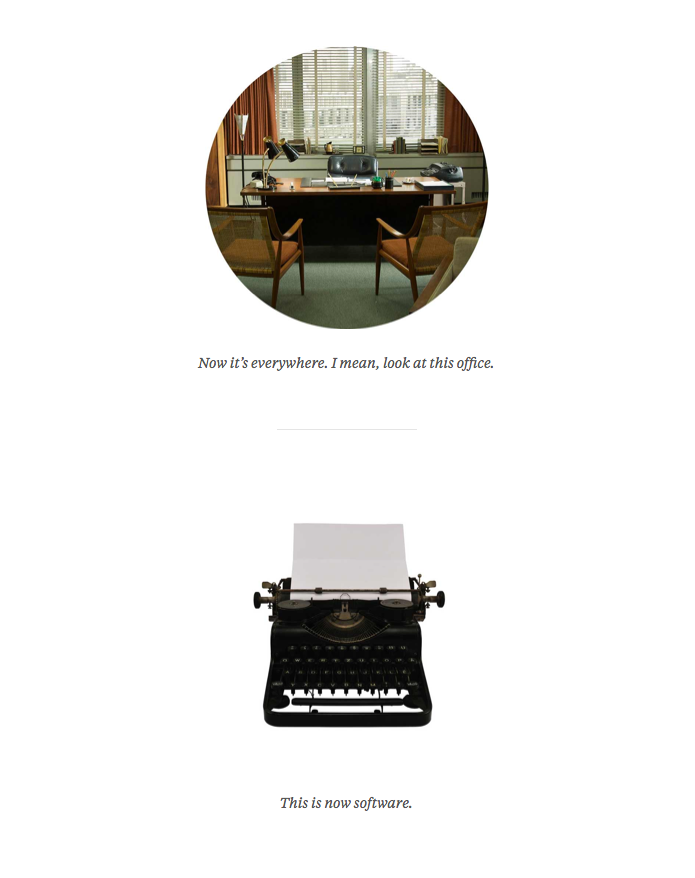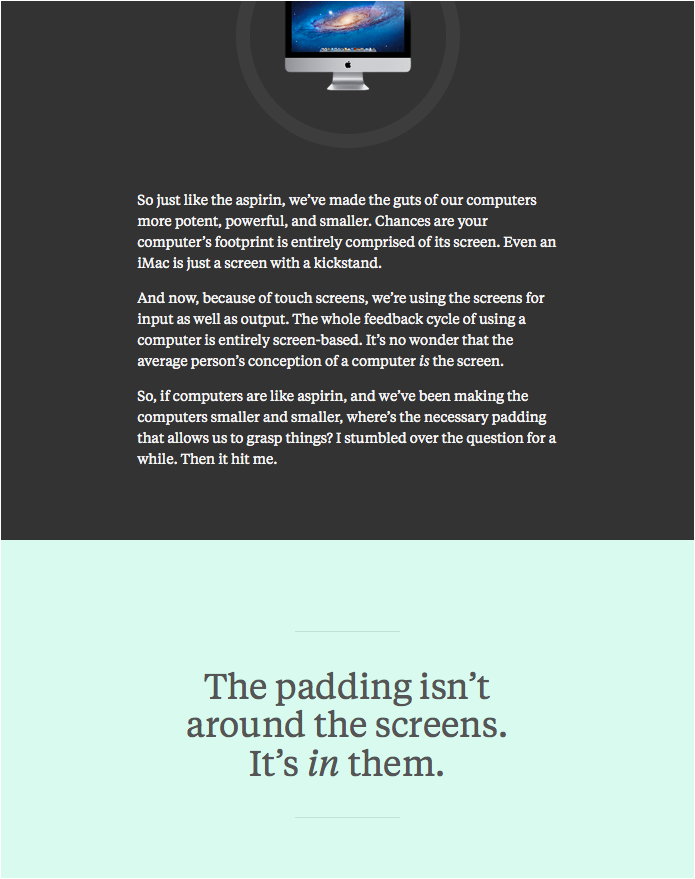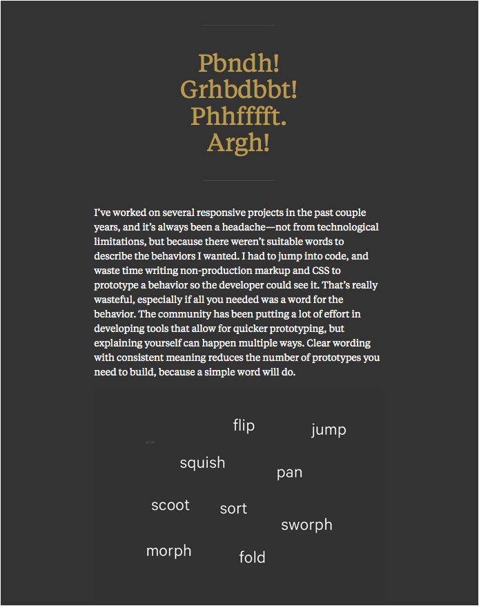 This site is an interpretation of my talk from Build, 2013. This website is typeset in Klim Foundry’s Tiempos Text. Thanks to its designer Kris Sowersby for the aire of intelligence. Large interstitial type is set in Lato. — frankchimero.com