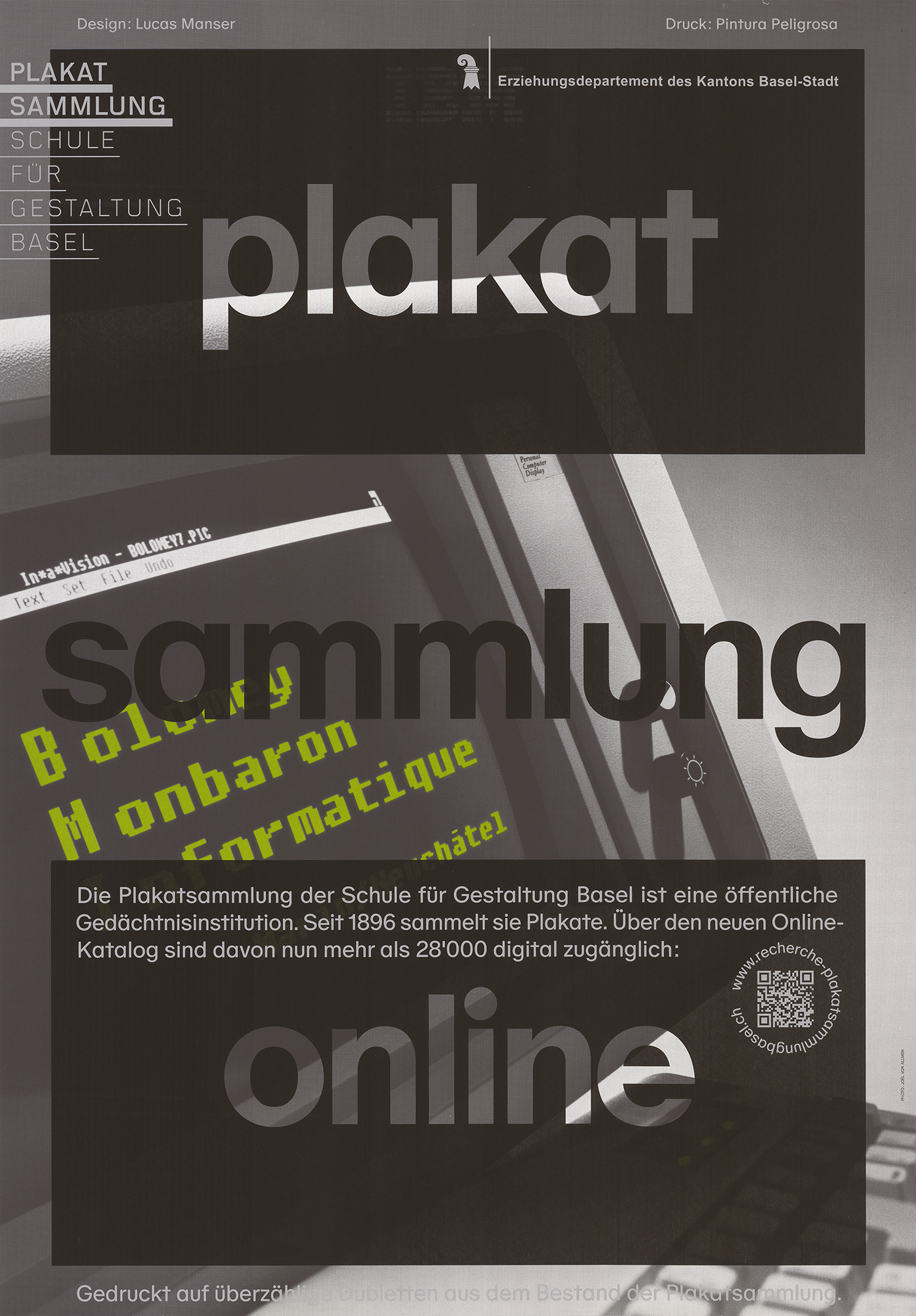 For the poster series for the launch of the online catalog of the Basel Poster Collection, surplus duplicates from the collection were overprinted using screen printing (black and silver). Dinamo’s Oracle (Bold and Regular with alternate glyphs) was used for this.