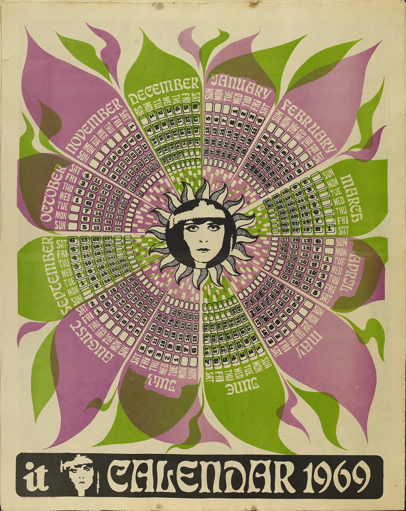 A psychedelic poster/calendar for the year 1969, published by the underground counter-culture publication International Times with their edition for December 13–31, 1968.
