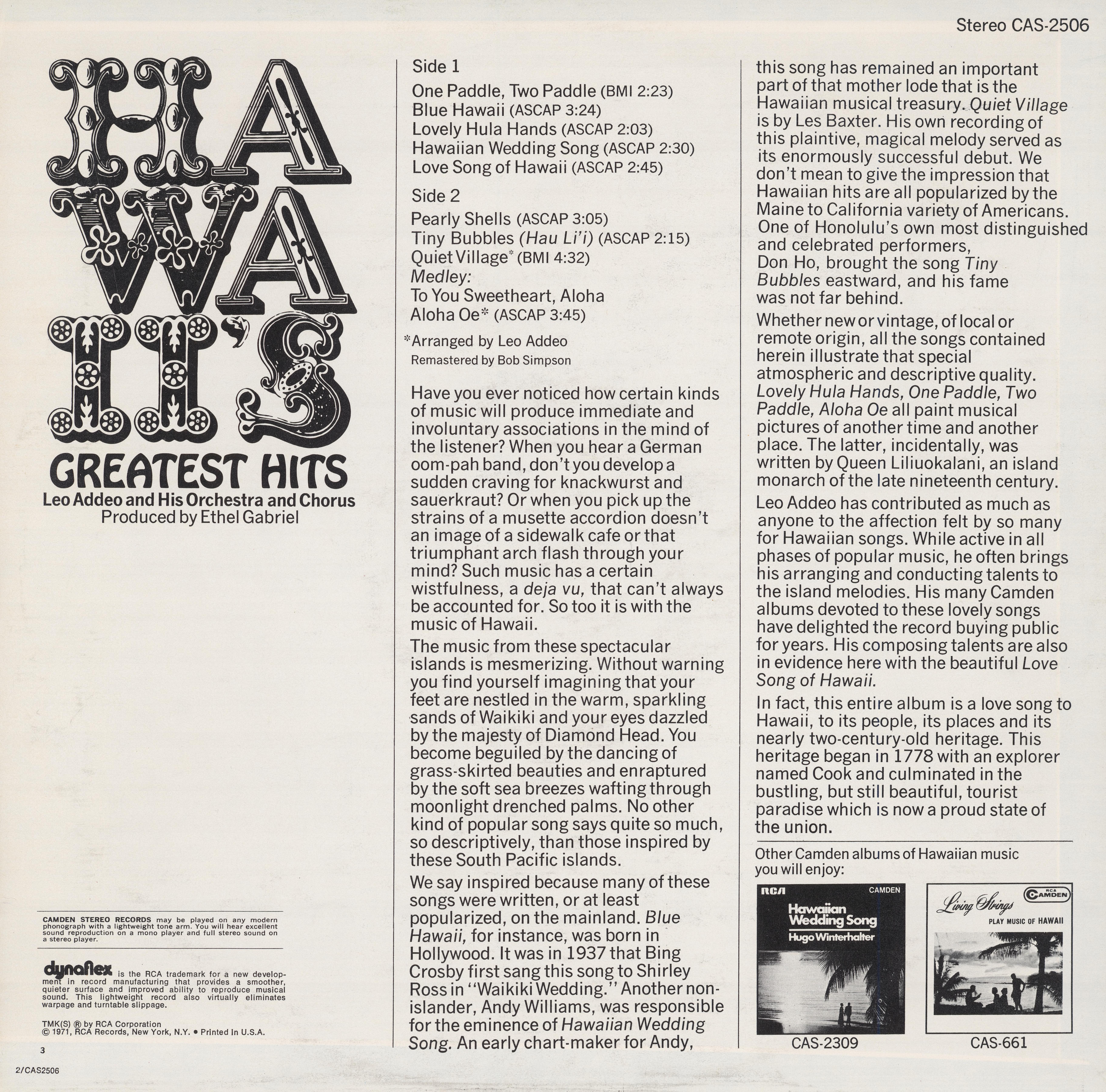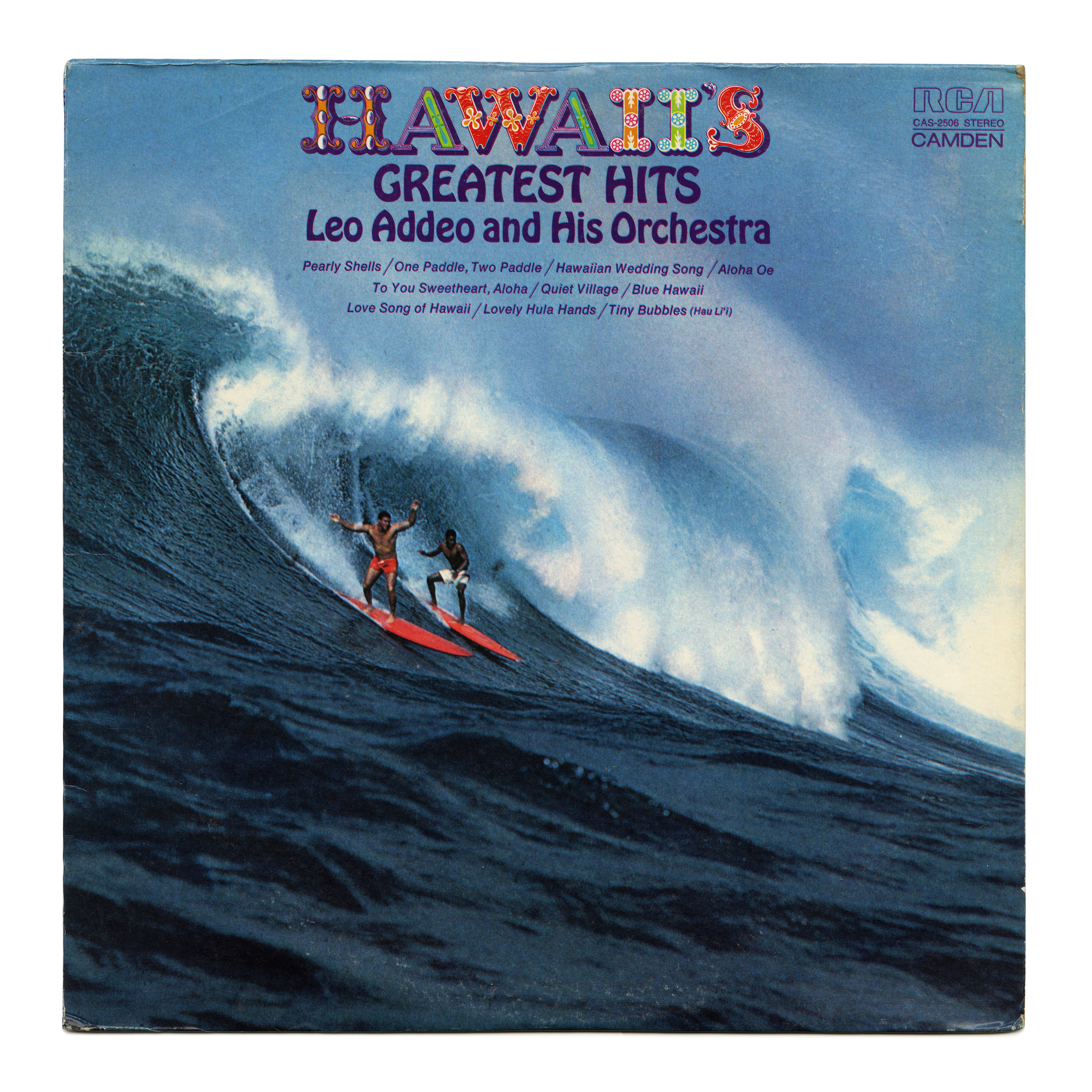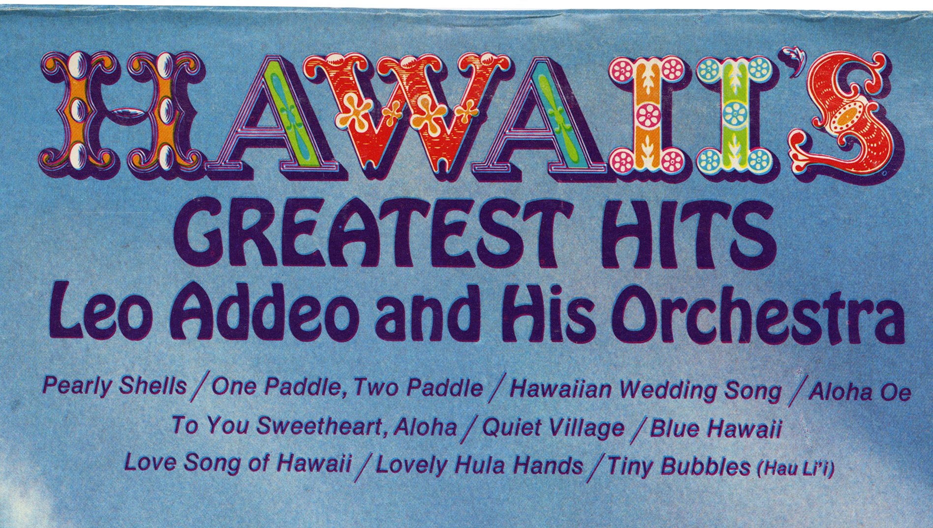 A multicolored use of Jester Ornamental, which was Photo-Lettering’s adaptation of Alphabet Fantasque, for an album of Hawaiian music by Leo Addeo (1914–1979) and His Orchestra, released in 1972 by RCA Camden. The letterforms of the decorative 19th-century alphabet were color separated: some structural parts and all shadows were printed in cyan and magenta, resulting in a dark purple. The fills alternate between orange with red and green with blue. These colors are likewise achieved by overprinting process colors, as the partly imperfect registration reveals.