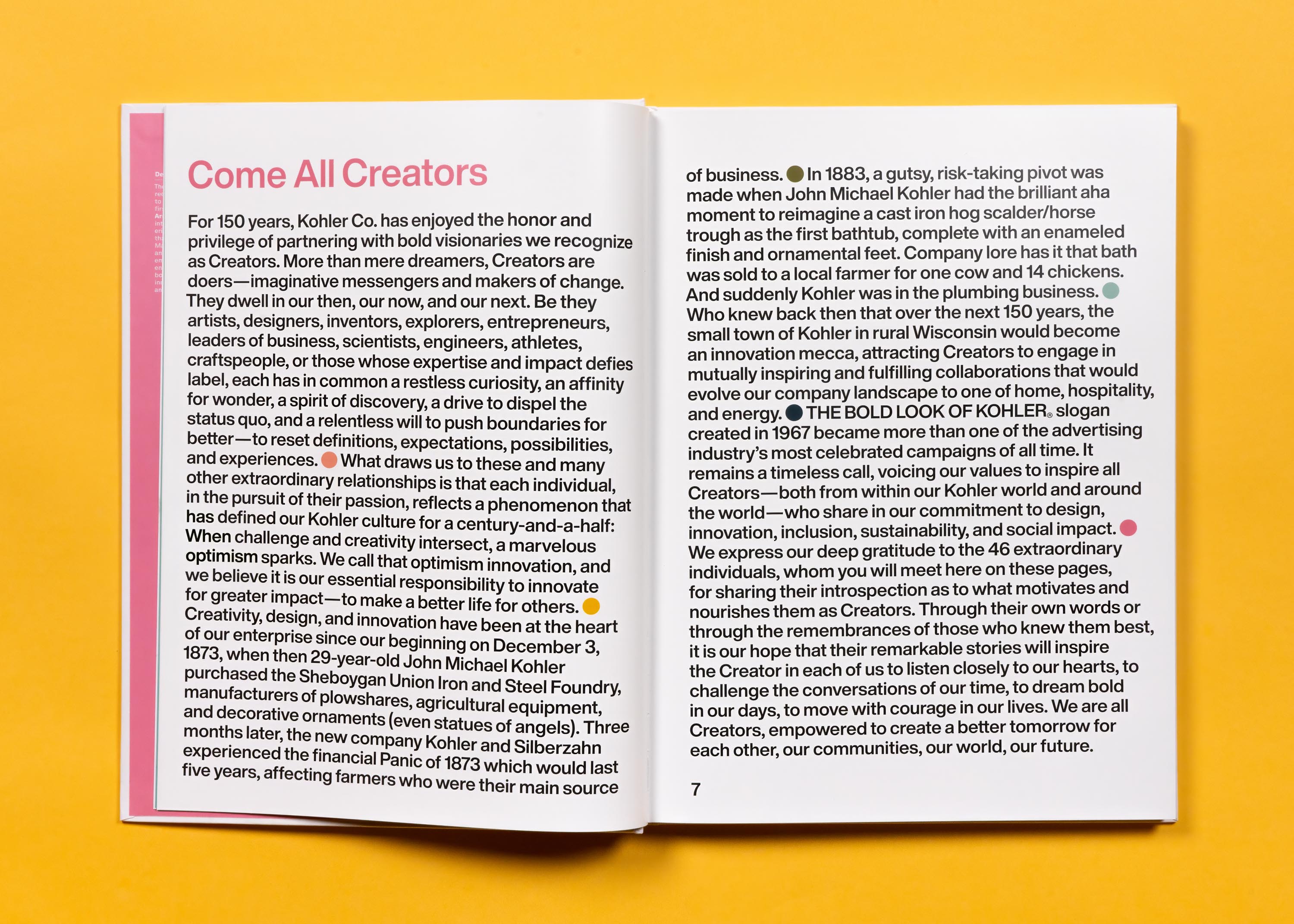 Kohler, the storied American company known for its iconic kitchen and bath products, luxury golf resorts and destinations, and energy generation, commissioned Bud Rodecker of Span to design a commemorative book for its 150th anniversary. The book celebrates all of the Creators who have propelled the company forward with their bold vision, be they artists, designers, inventors, explorers, entrepreneurs, leaders of business, scientists, engineers, athletes, craftspeople, or those whose expertise and impact defies label. Working collaboratively with the Kohler team, the Span team wrote, edited, curated, and designed Be Bold.