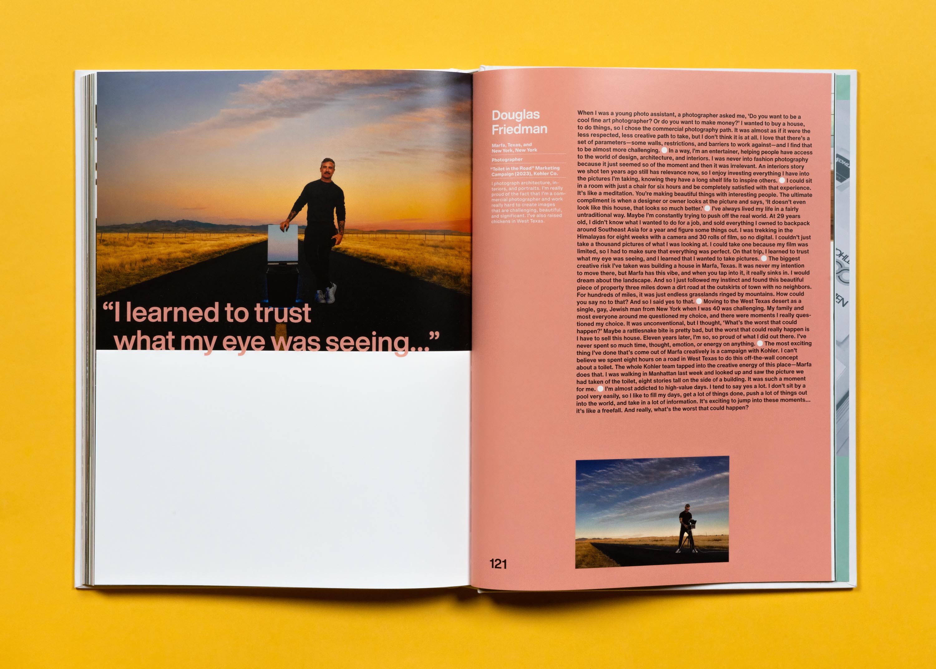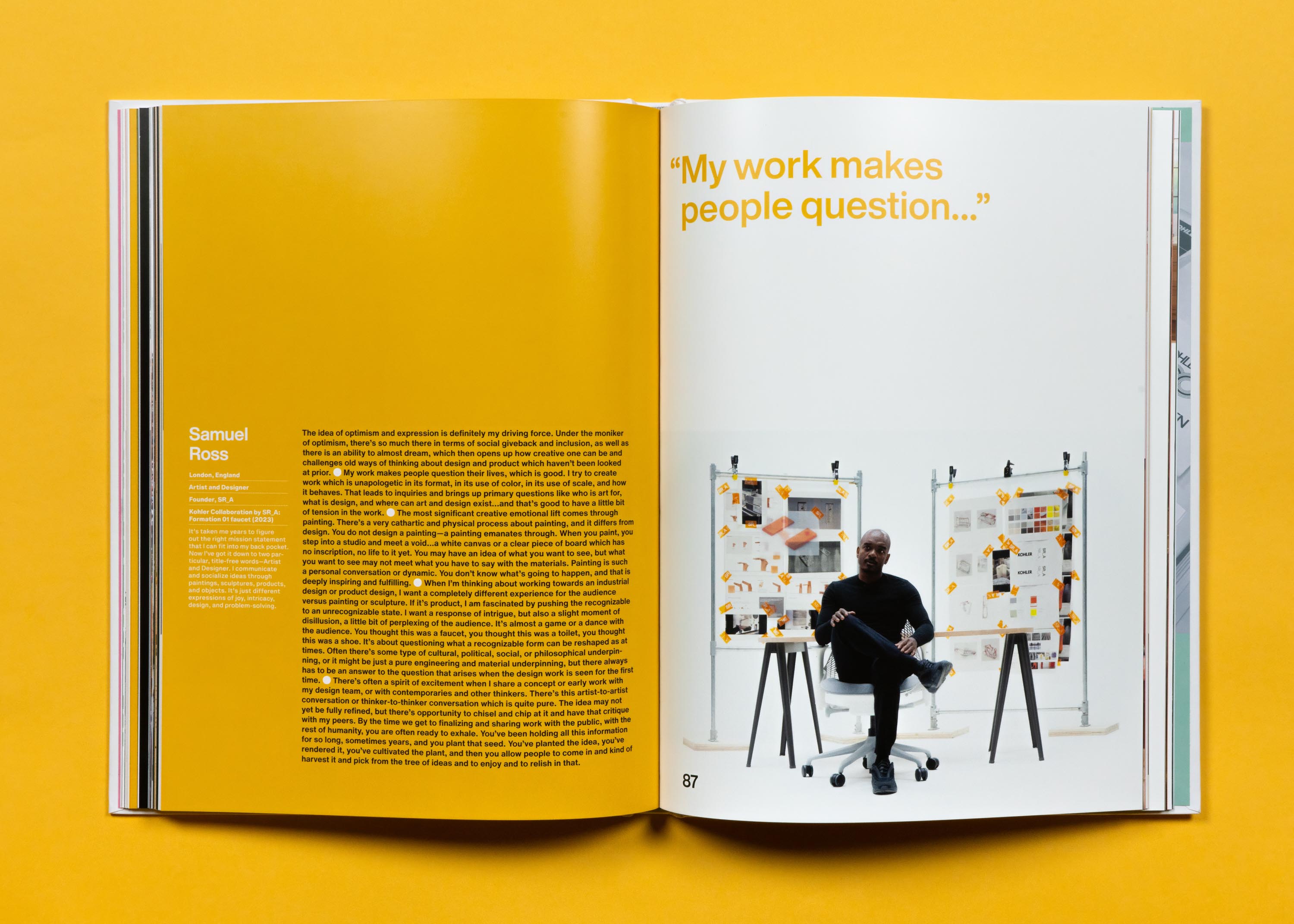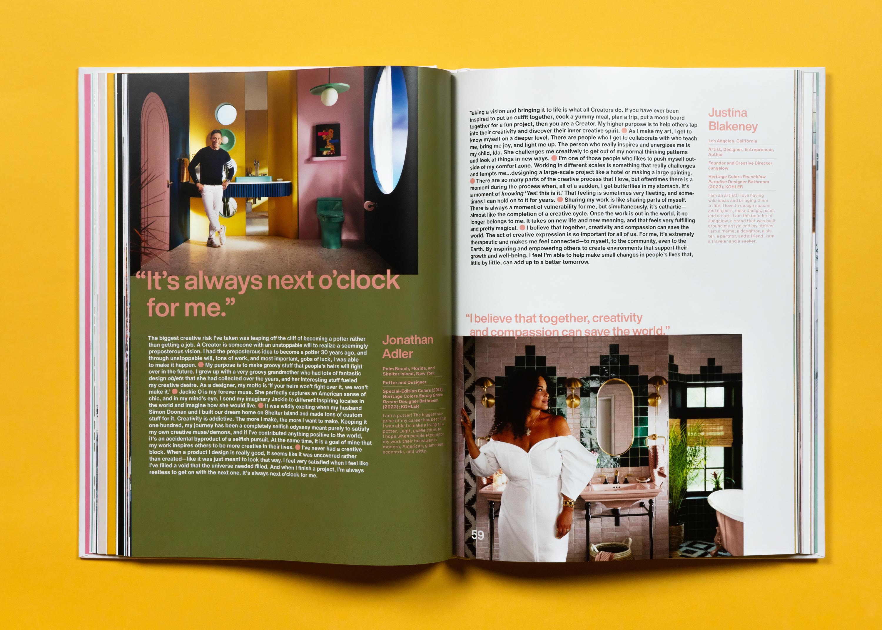 Span engaged Donna Speigel to establish the book’s editorial voice and to write and direct copy. Over the course of a year, Donna interviewed 34 contemporary Kohler Creators to capture their inspiring stories in first-person conversations. These conversations delve into what drives their creative process and output. Featured creators include contemporary artist Daniel Arsham, former NFL football player Donald Driver, Ann Sacks, and Jonathan Adler. Under Michael Mueller’s direction, the Kohler in-house copy team wrote historical narratives for “legacy” Creators, bringing to life the stories of innovative Kohler leaders and collaborators who have passed. Bud Rodecker and Alyssa Arnesen worked with Krystina Russell of Kohler and their archives team to curate the image selections and design the page layouts.