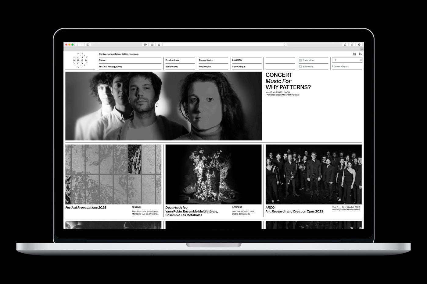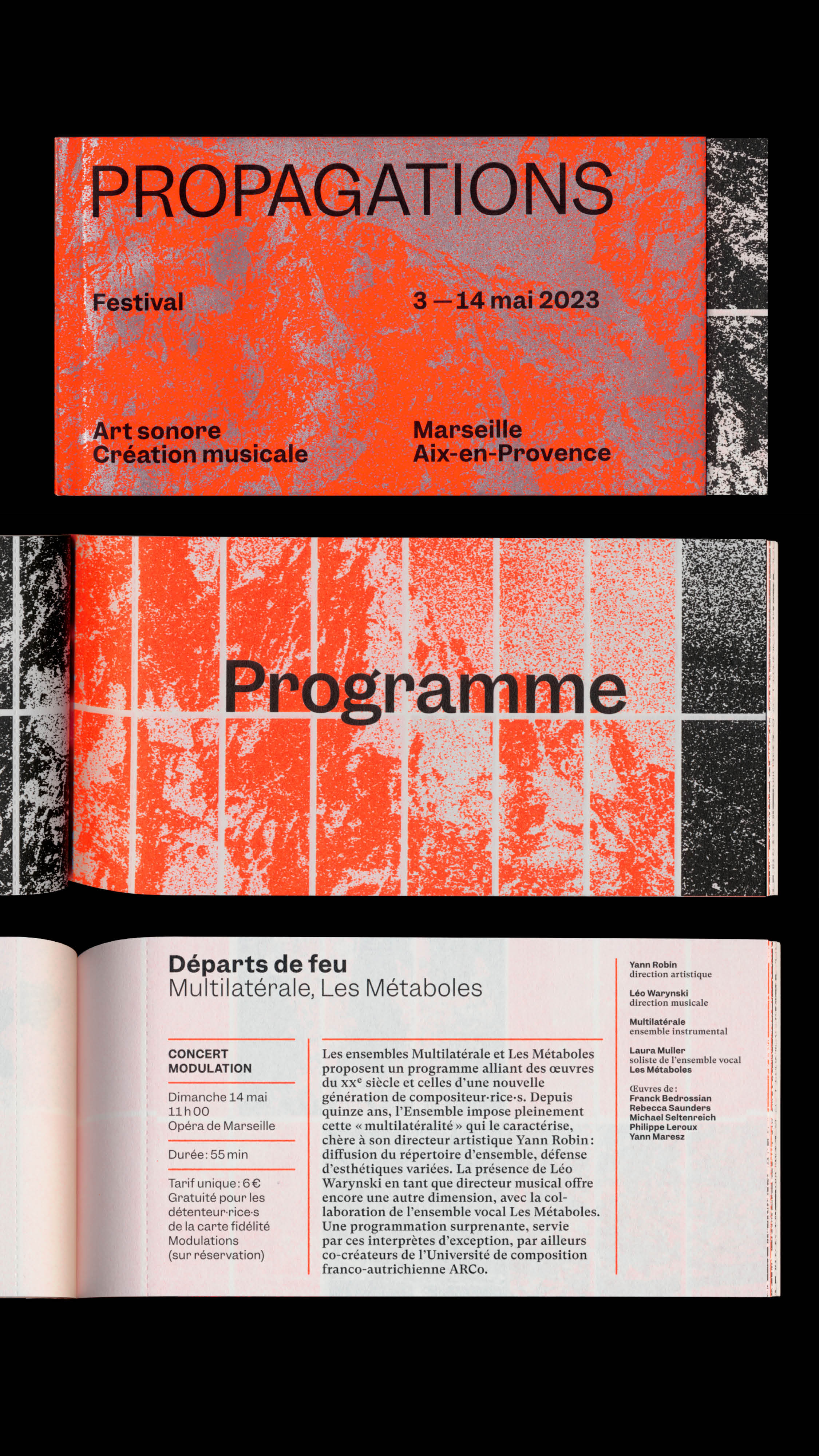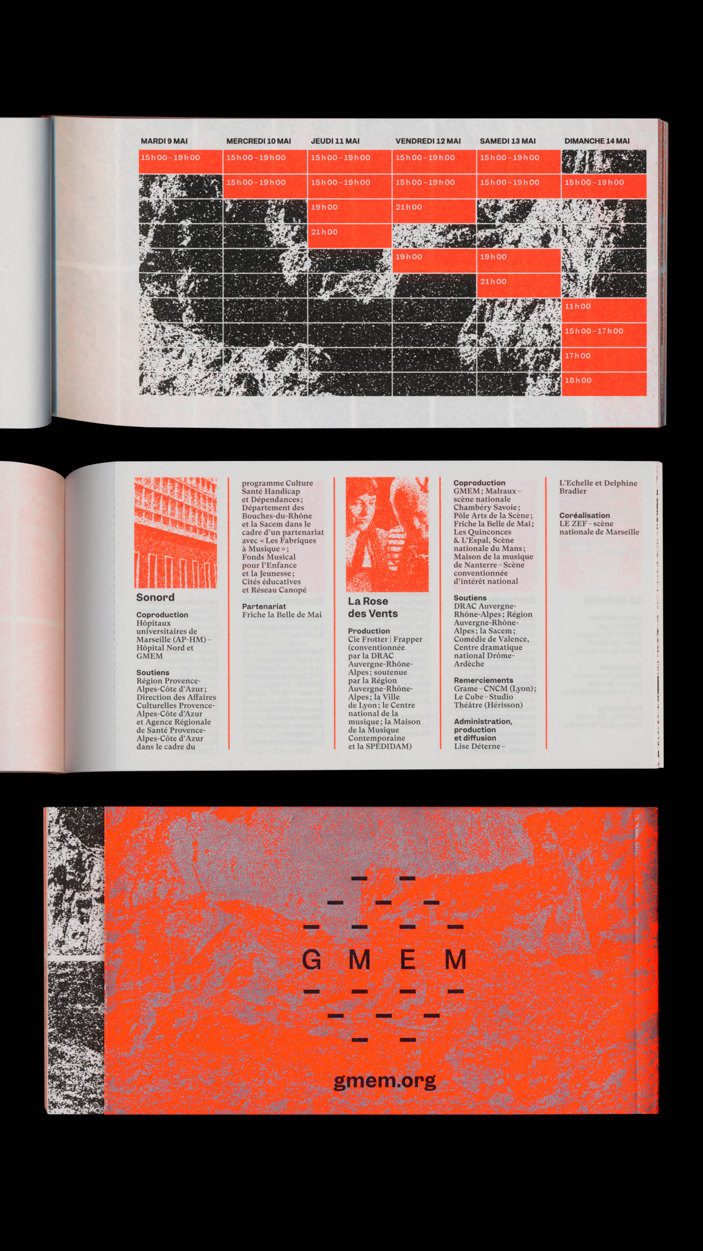 Between 2020 and 2023, Atelier Tout va bien, based in Dijon, worked with the GMEM National Center for Musical Creation in Marseille. They first designed the entire graphic identity of the GMEM, with a visual system made up with an animated logo. Then, they developed the various communication materials such as the leaflets for the GMEM season, and finally, they managed the design of the website. At the same time, they carried out the communication for the Propagation 1st and 2nd edition events, as well as Modulations Part 1 and 2. For these events, they designed the screen-printed posters, the imagery for social media, programs material, swag, etc.