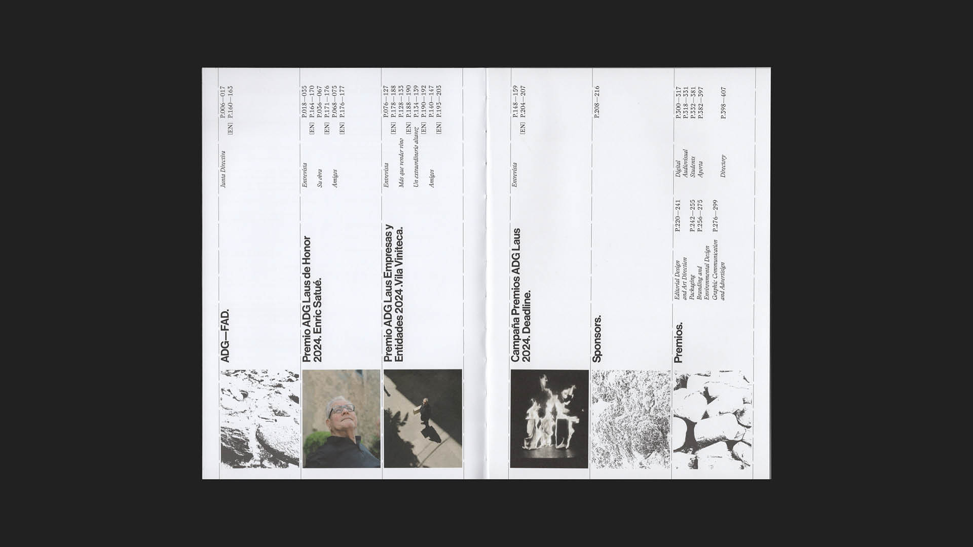 The typefaces used are Neue Haas Grotesk (the corporate typeface of ADG-FAD) combined with Stanley. We wanted to retain the association’s corporate typeface and combine it with another to create contrast between the two, while also giving personality to the publication.