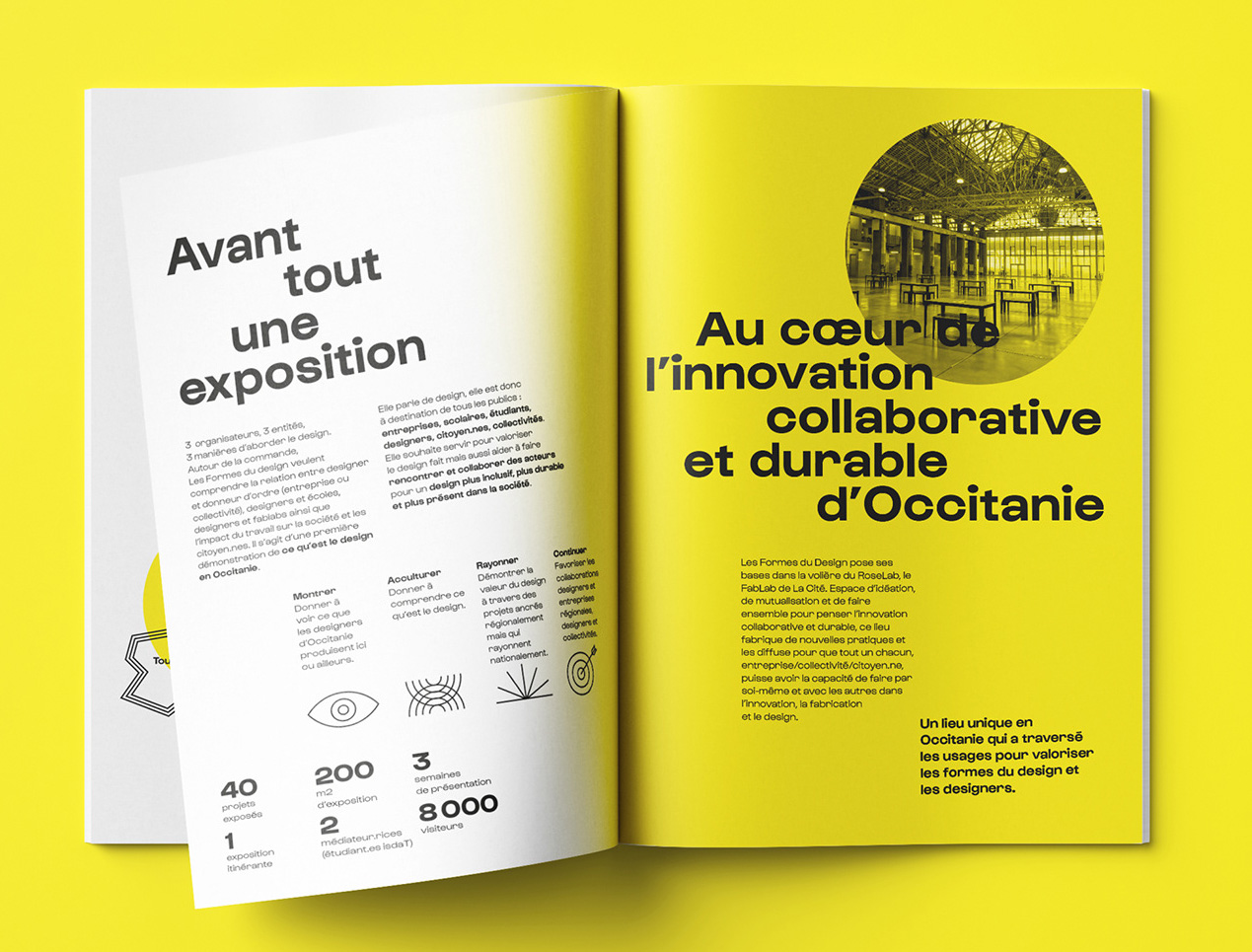 Visual identity created by Studio Asenso for the exhibition Les formes du design. The typeface used is Gustavo (from Lift Type) because it was created in Montpellier in the Occitanie region.