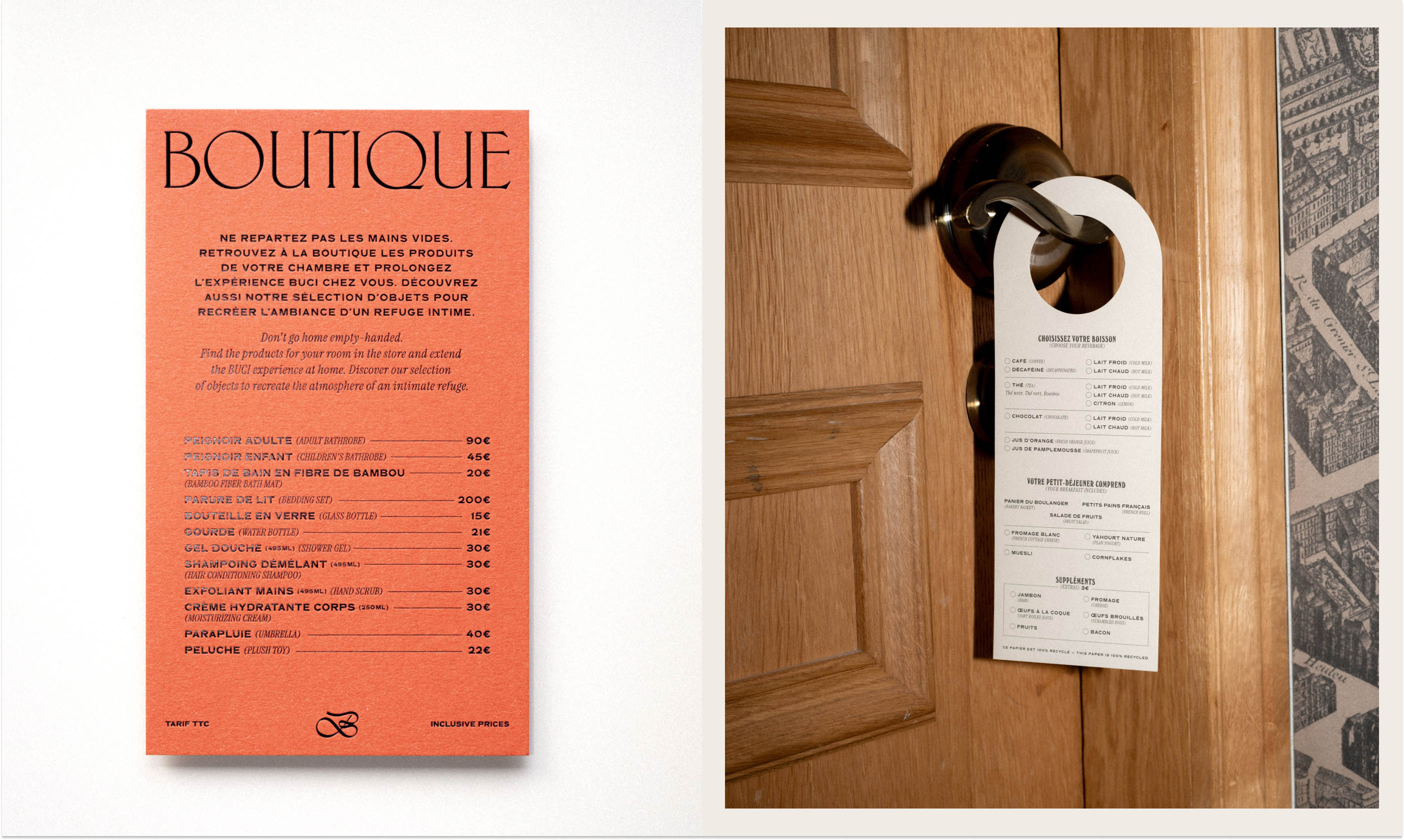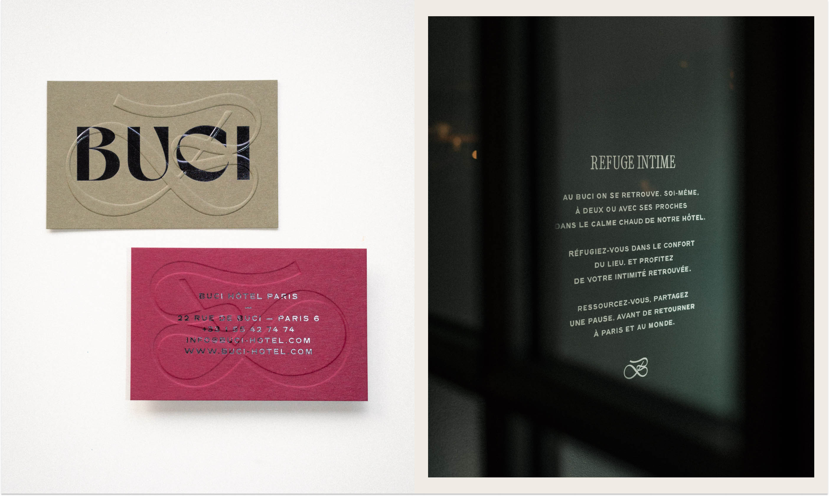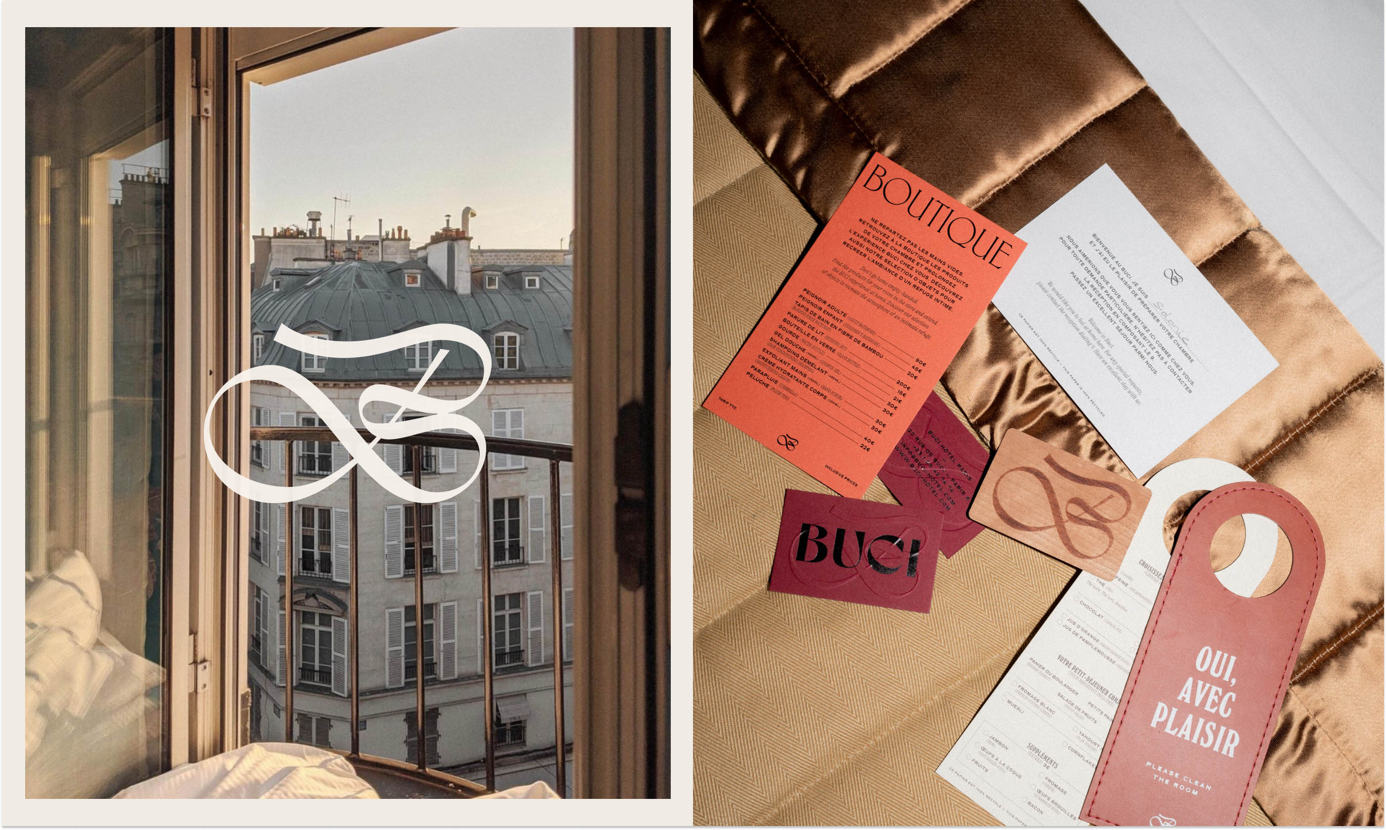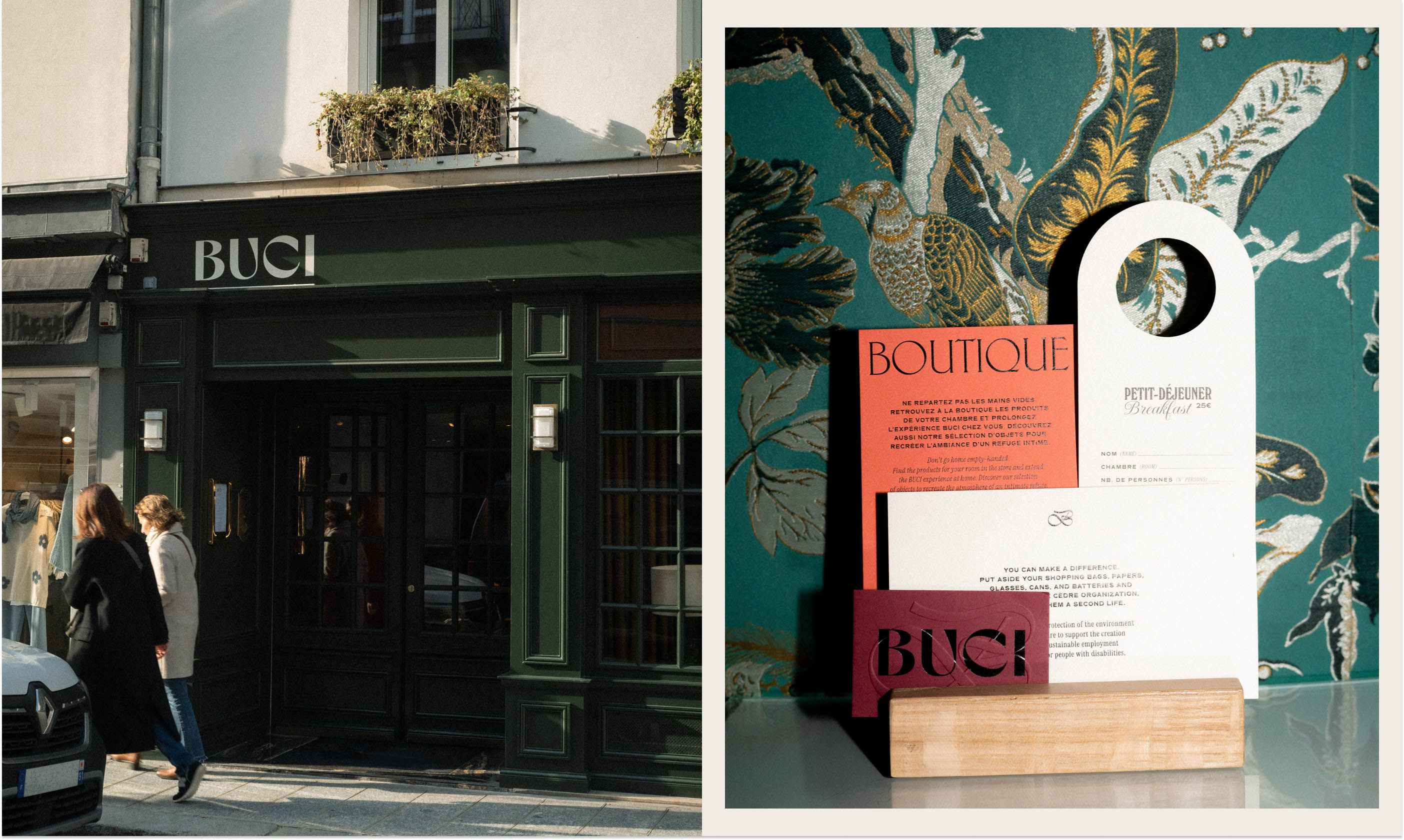 Nestled in the heart of the vibrant Saint Germain neighborhood of Paris, Au Buci offers a unique blend of homey intimacy and eclectic design. We deliberately mixed various typefaces, papers, colors, and textures to evoke the feeling of entering a beloved personal space, stepping away from traditional, predictable branding to mirror the distinct comfort of a home rich with stories.
