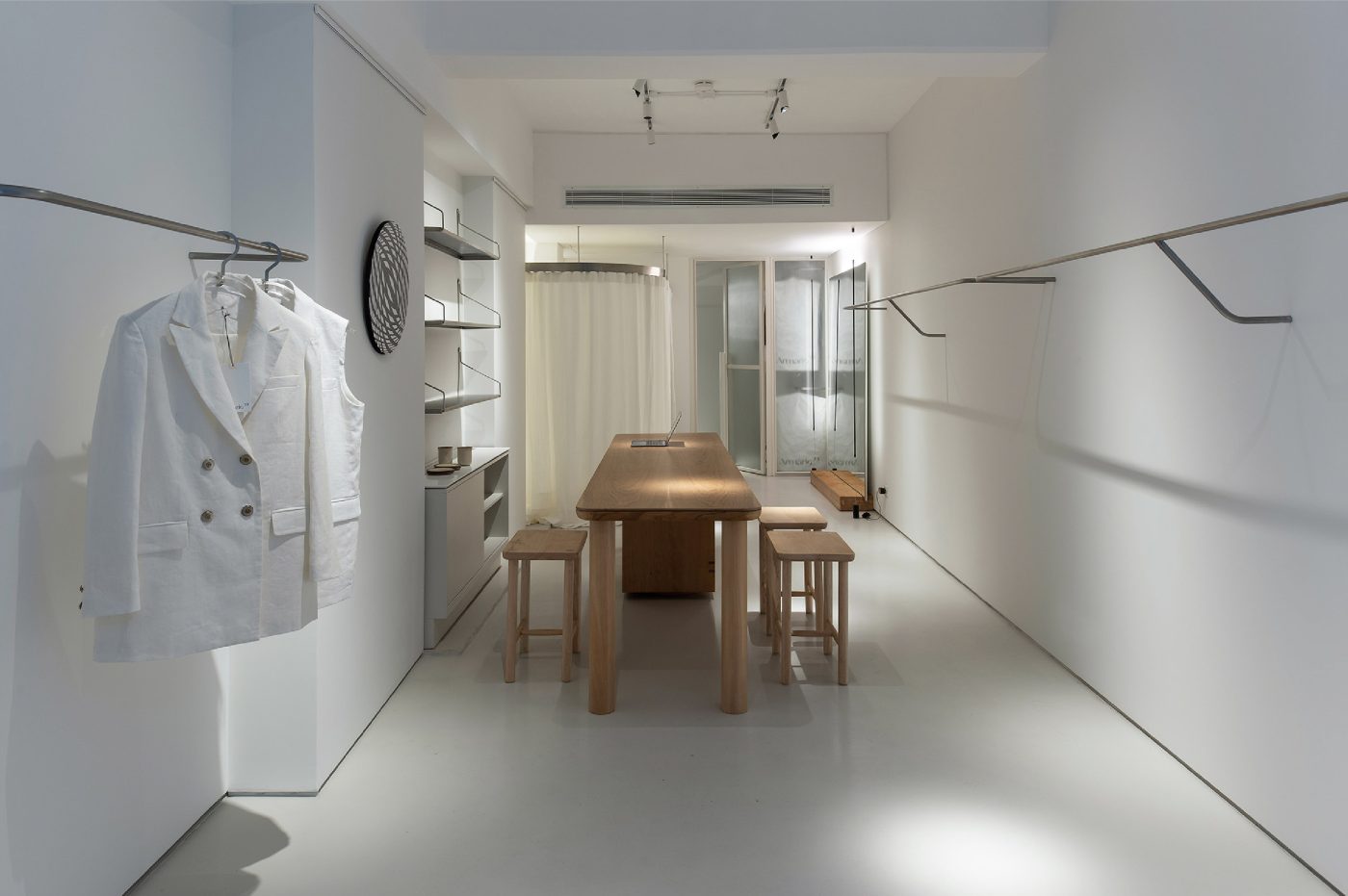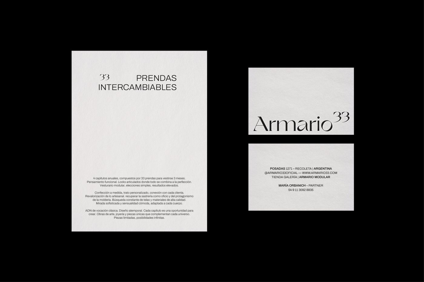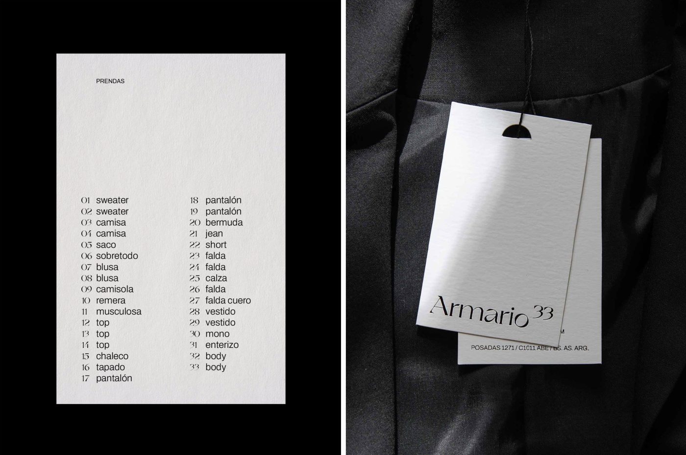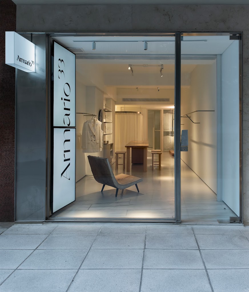 Armario 33 is an apparel store and art gallery located in Buenos Aires, Argentina. The project is based on a recent study that demonstrates that 33 garments are sufficient to dress for three months. Following this statement, the brand aims to develop modular closets, composed of four annual chapters, each of them formed by 33 interchangeable garments, perfect to dress for three months. Its leitmotif is functional thinking (articulated looks and simplicity). The label seeks to recover tailoring as craftsmanship, offering the possibility to adjust the garment after purchase. Also, the brand only works with high quality fabrics and materials.