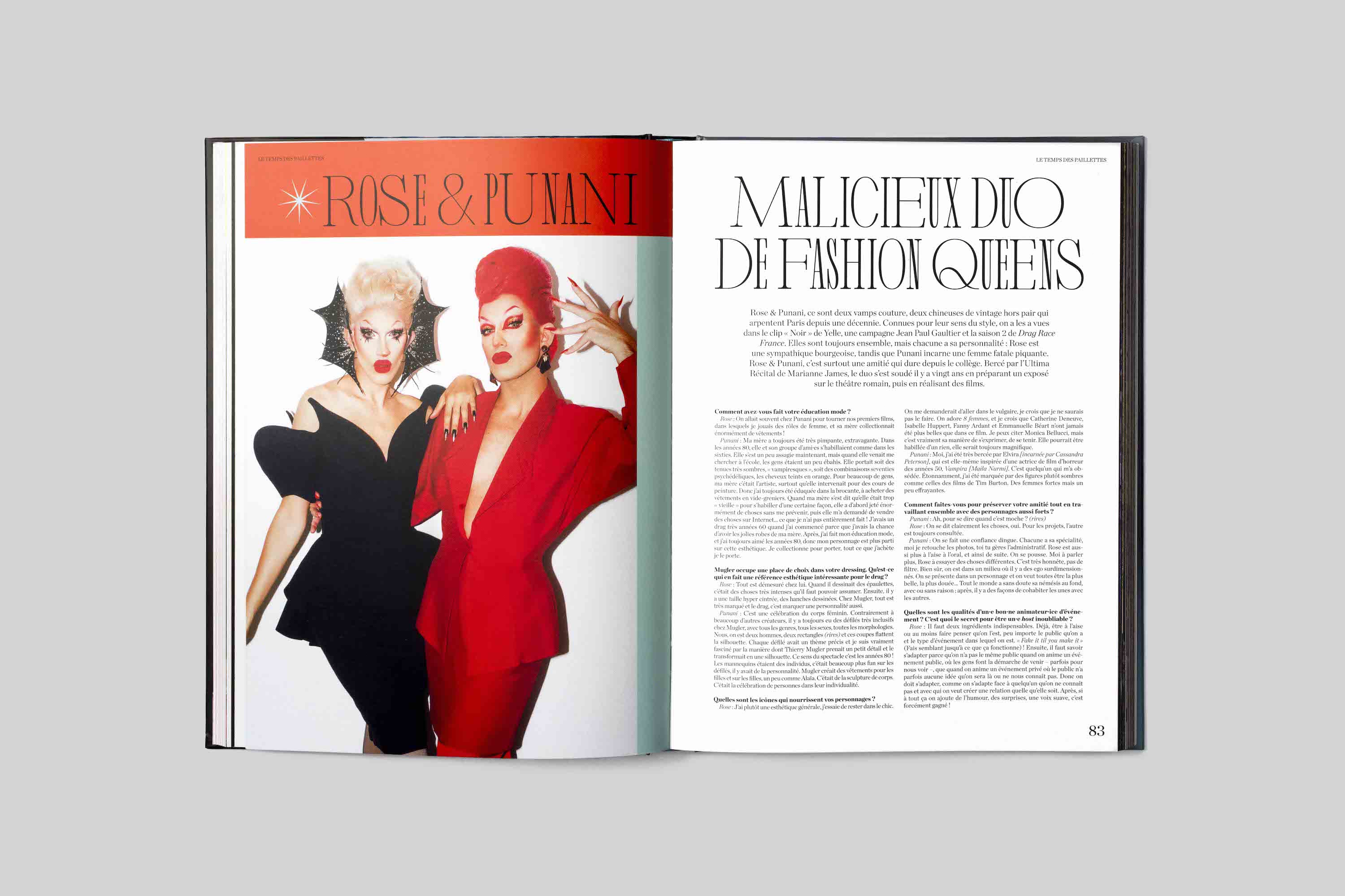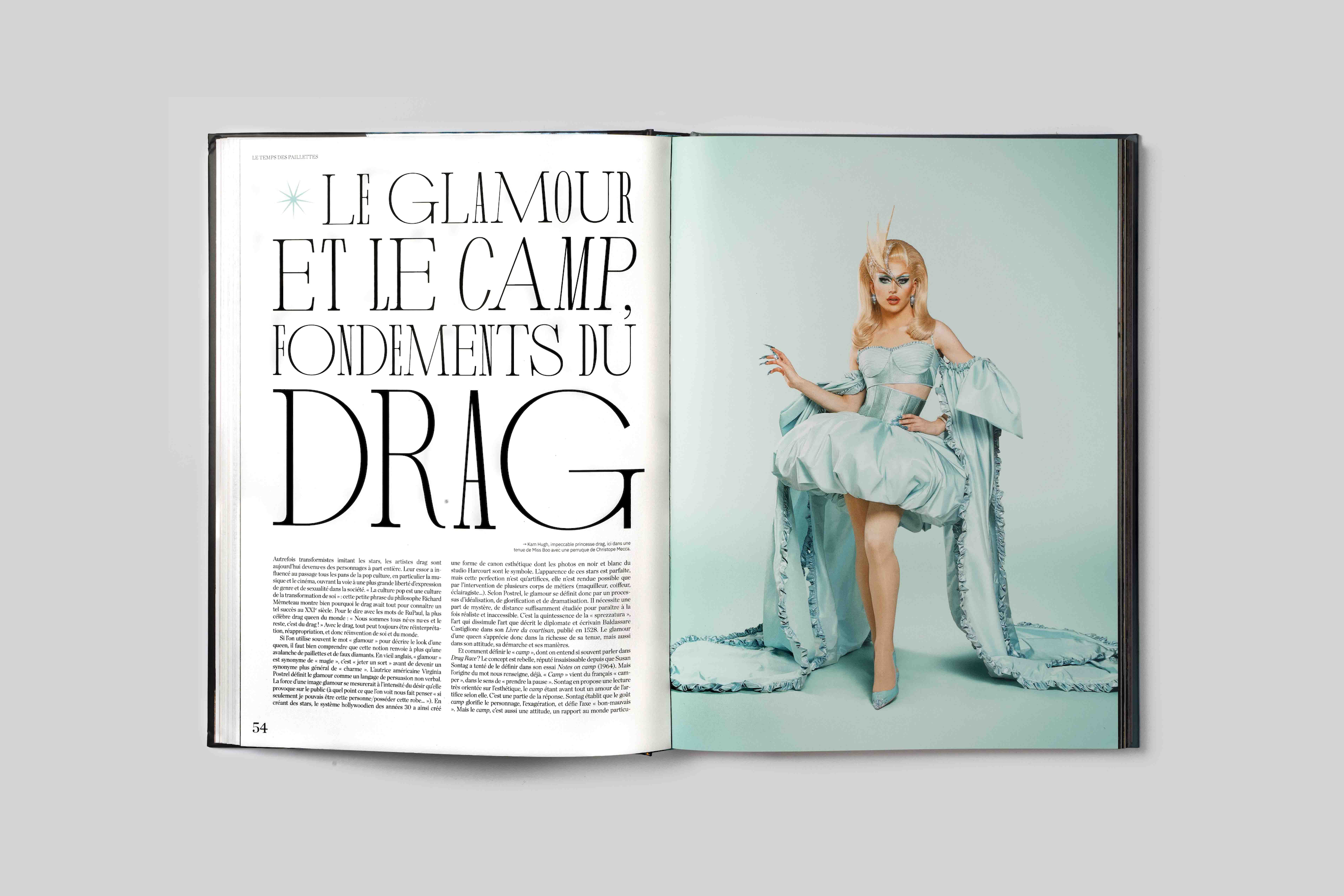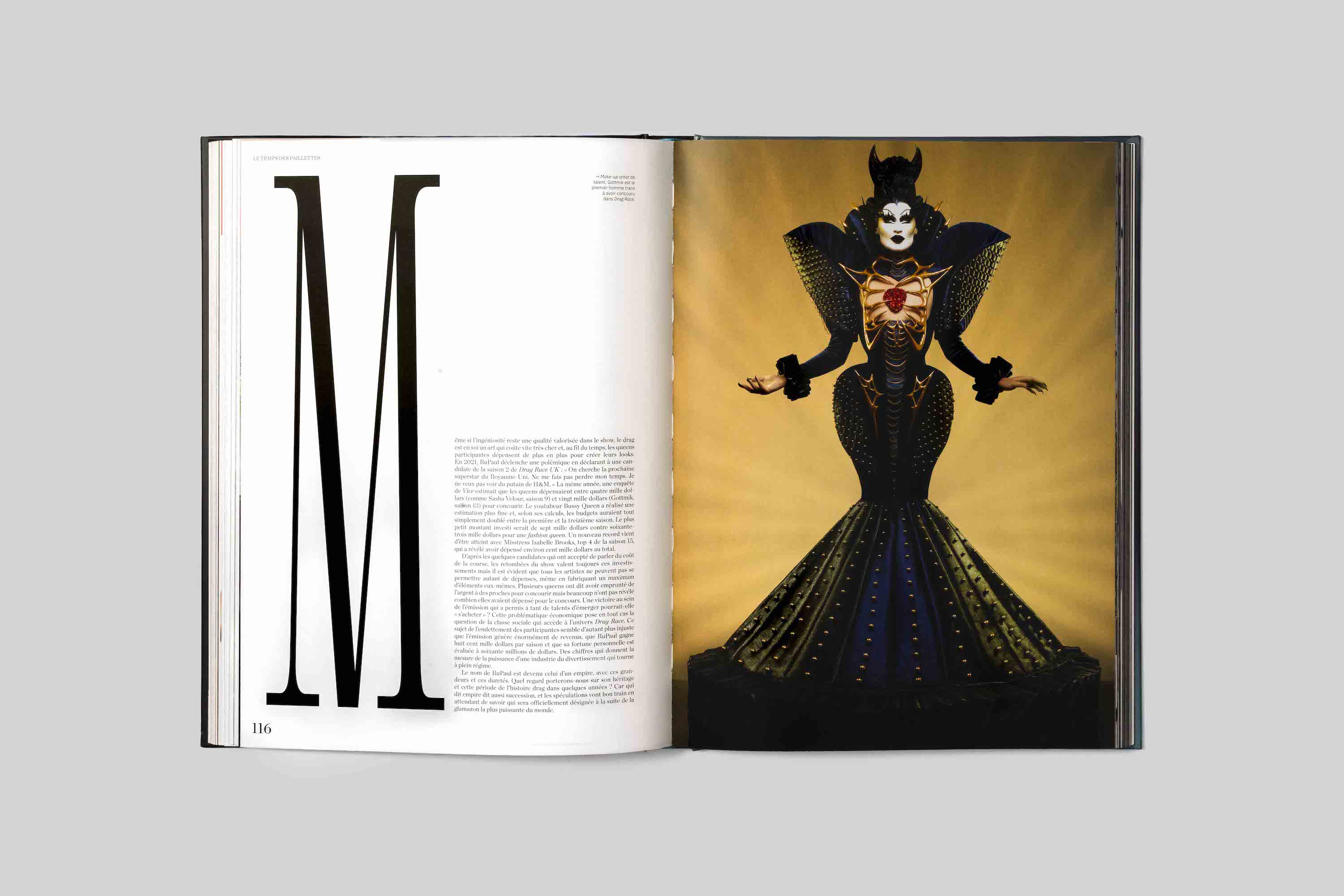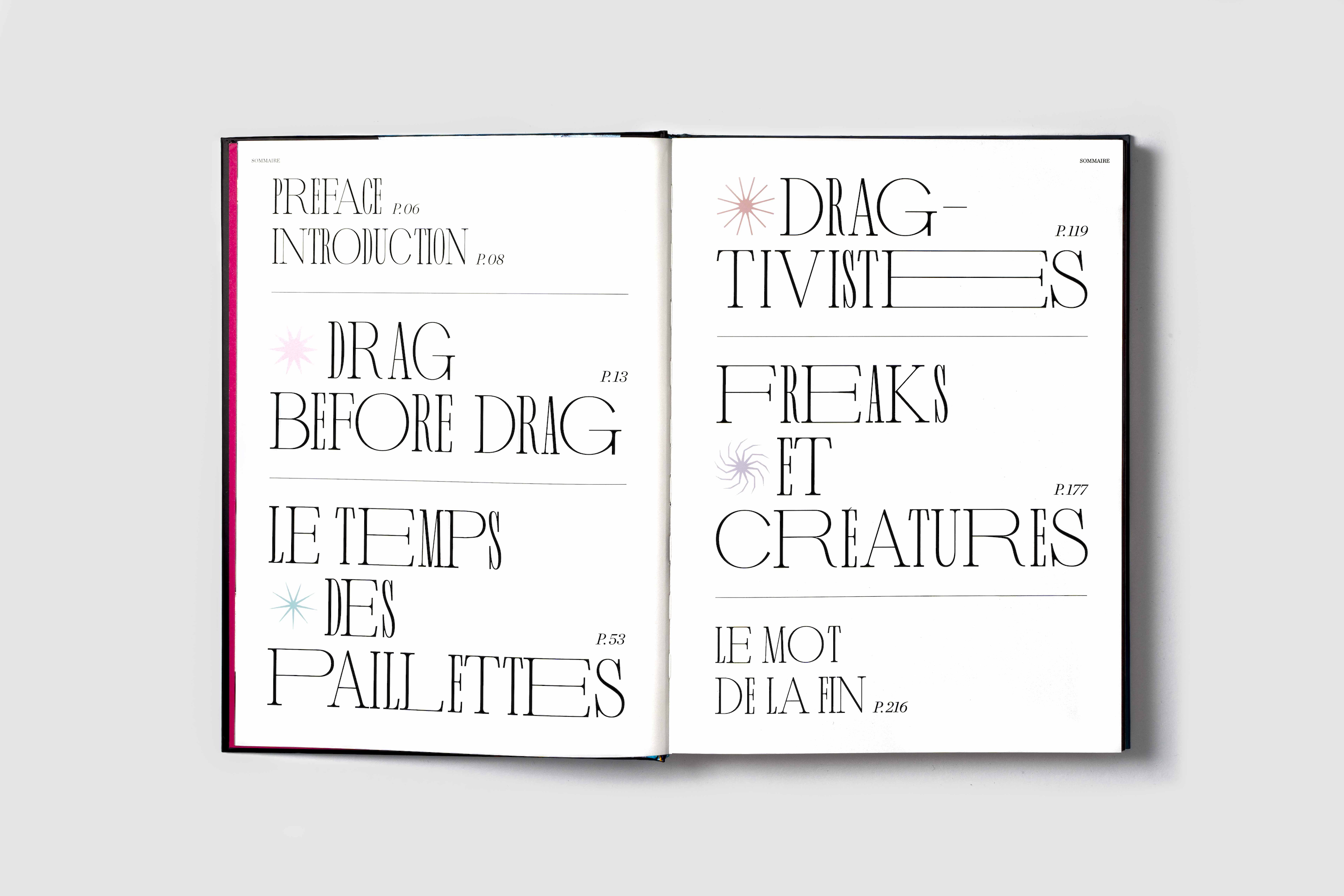 Drag, un art queer qui agite le monde (“Drag, a queer art shaking up the world”) is a book about the history of drag culture, written by Apolline Bazin. The titles are set in Sehnsucht (Marco Juan Lavandier, the designers of the book), the body text in Chronicle (Jonathan Hoefler), and the captions in a yet unidentified sans serif.