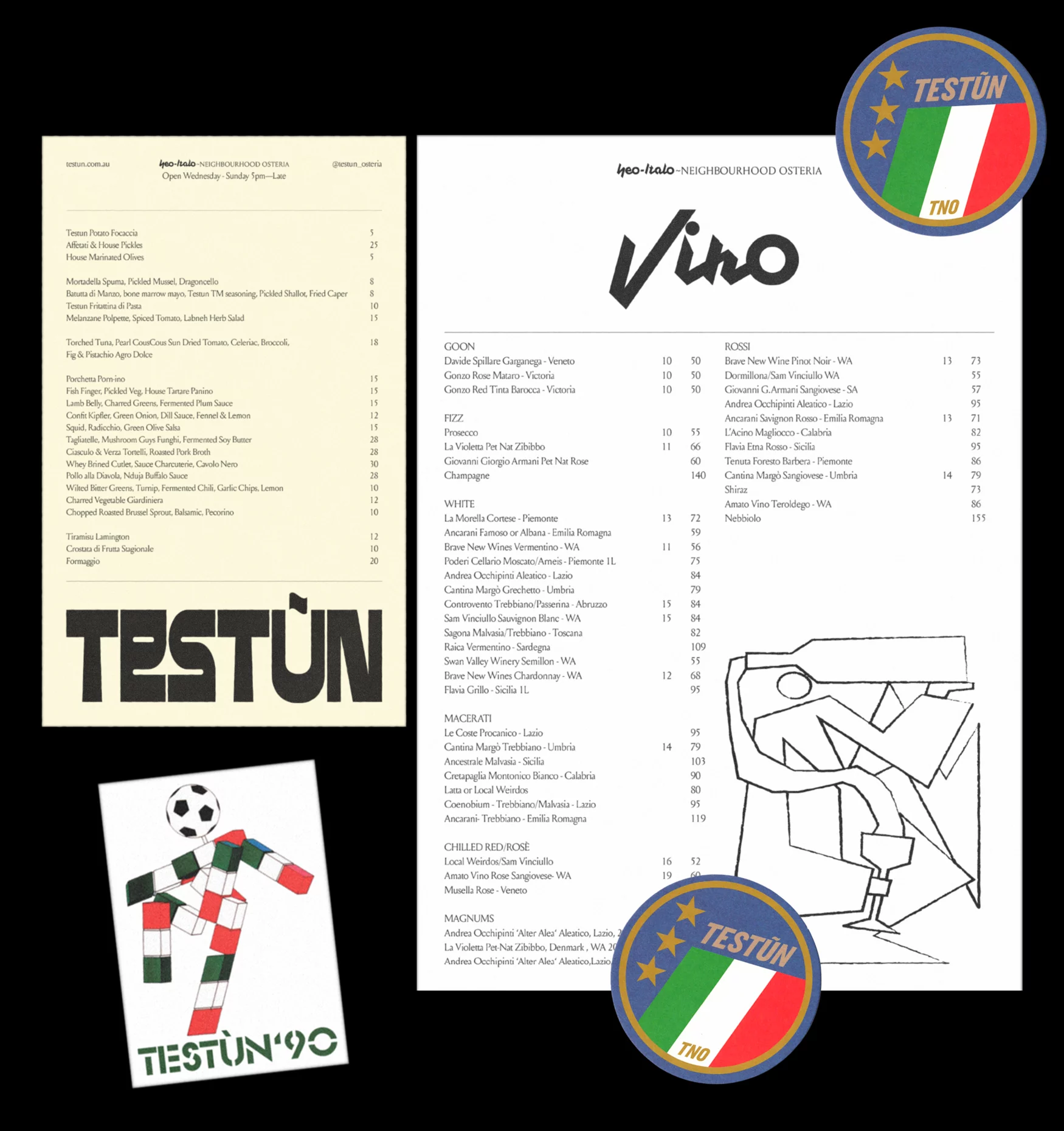 For the brand identity of Testùn, the design studio Gesture Systems referenced 1990s Italia football and the irreverence of ’90s Italy to deliver an eclectic identity to match to energy of the staff and venue experience.