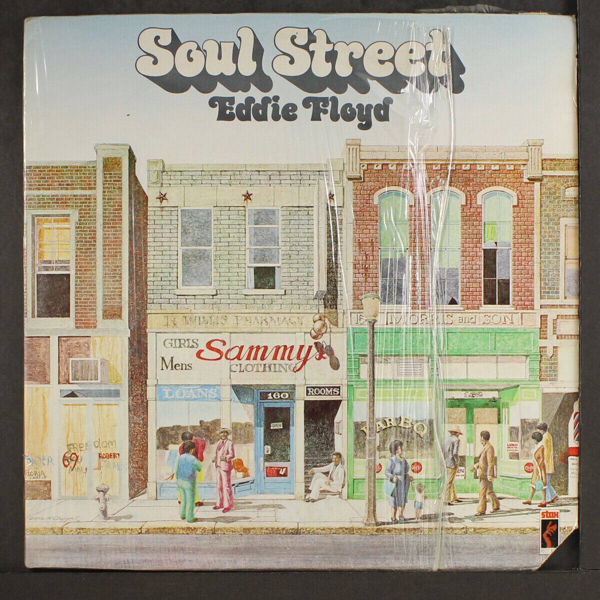 Soul Street is an album by R&B and soul singer and songwriter Eddie Floyd (b. 1937), released in 1974 on Stax Records. The sleeve design is by the record company’s internal design studio, The Stax Organization. Ellis H. Chappell provided the marvelous street scene illustration, complete with shop signs of current and previous businesses in various lettering styles as well as details such as protest graffiti.
