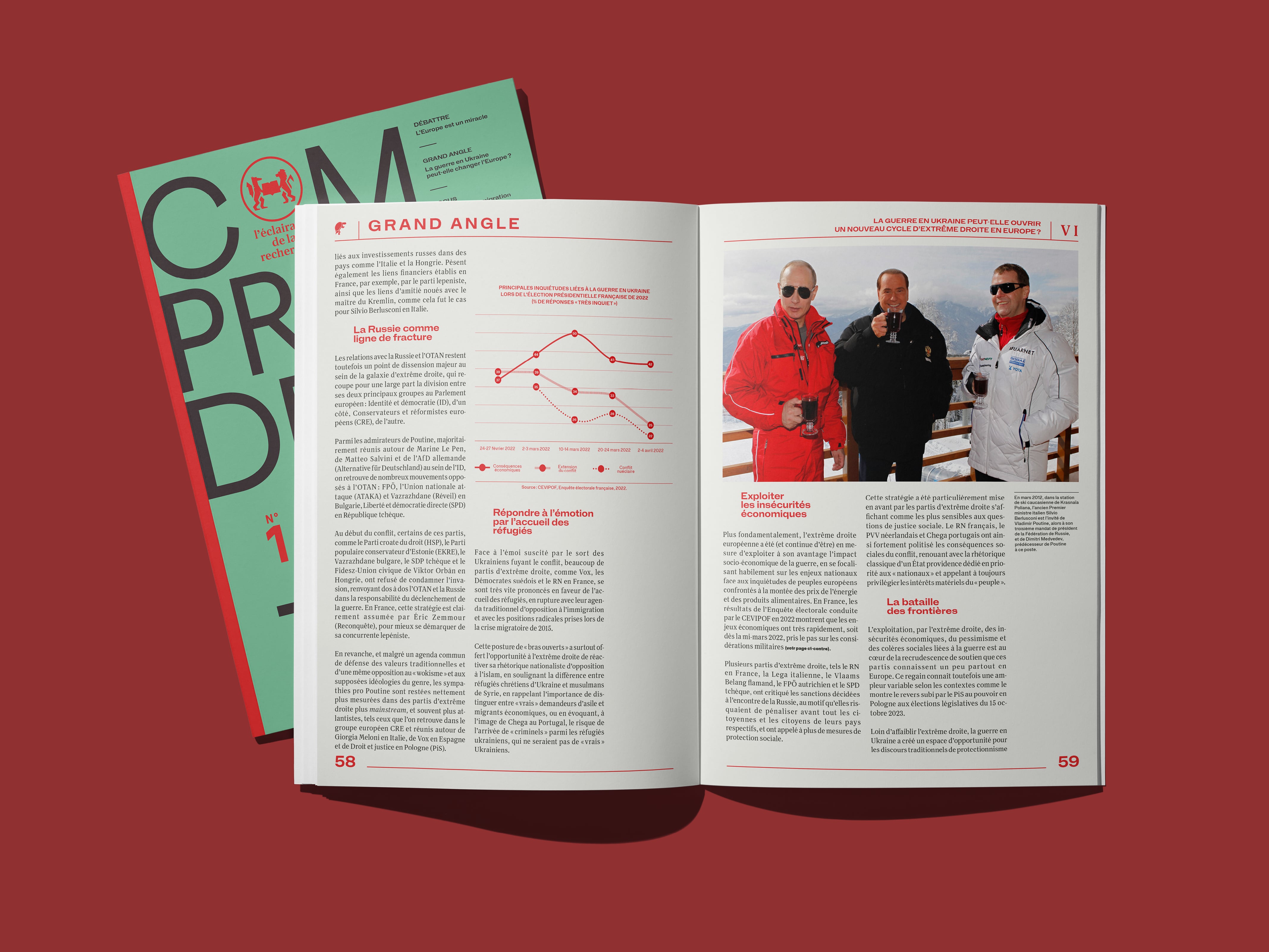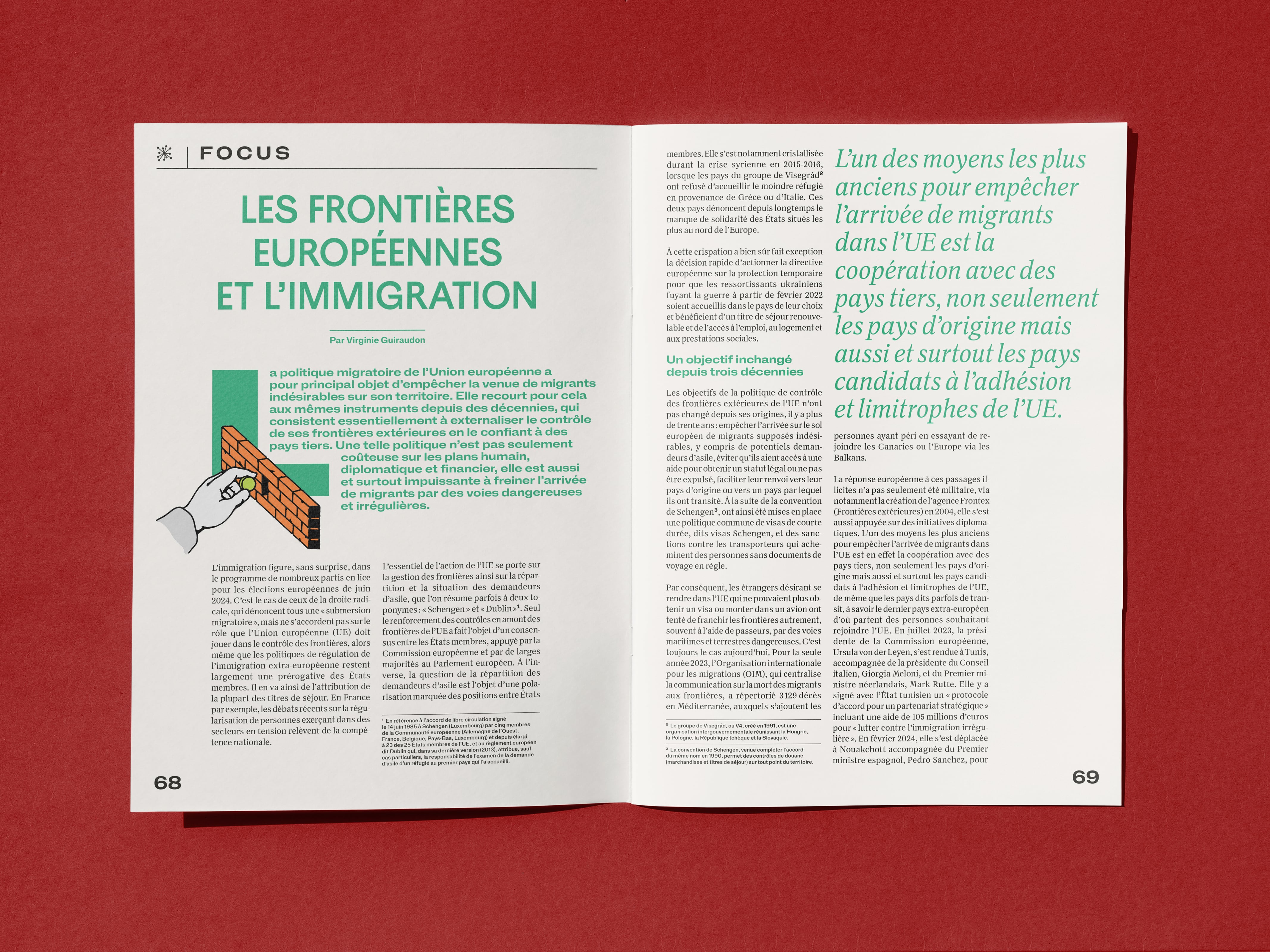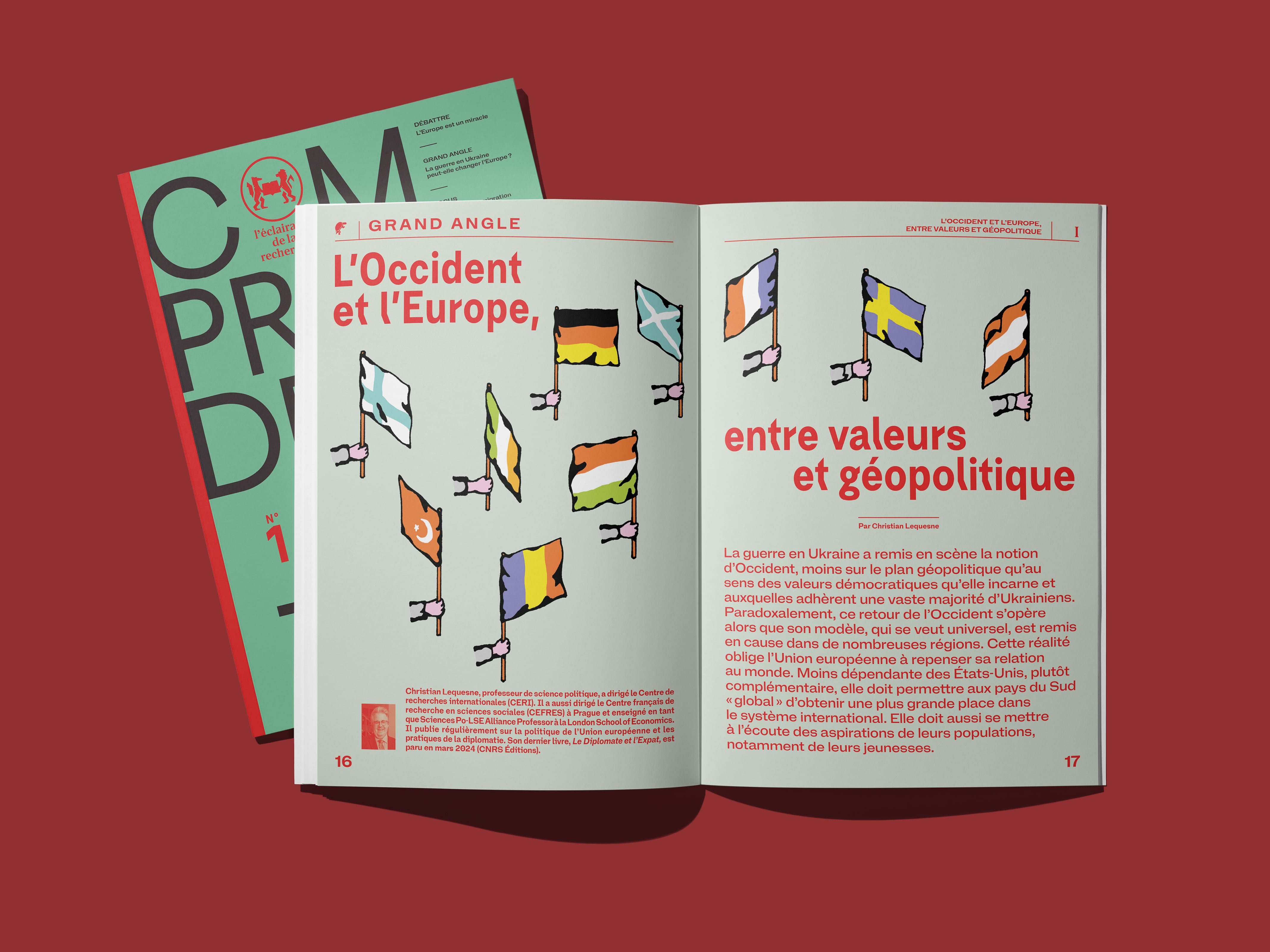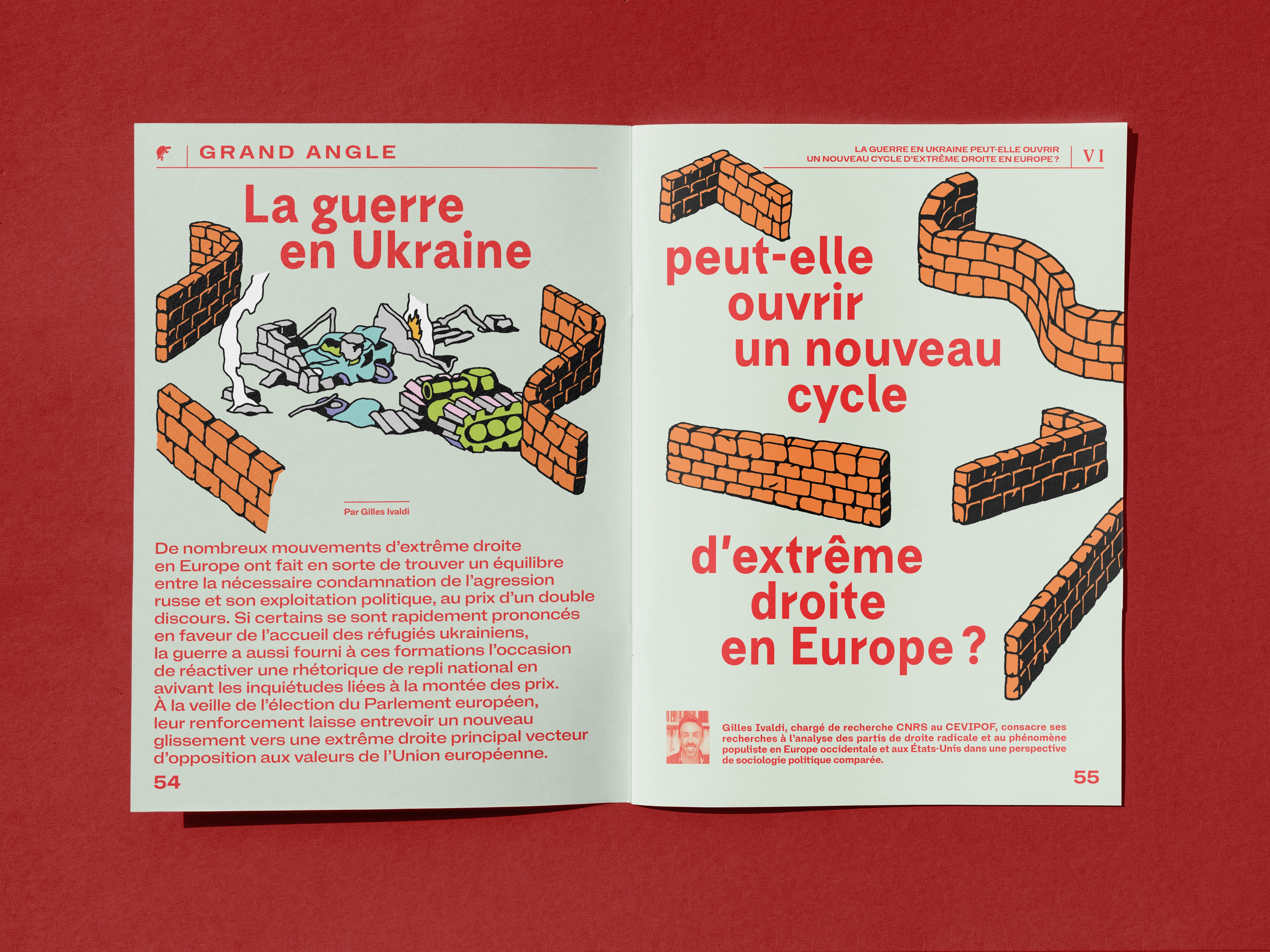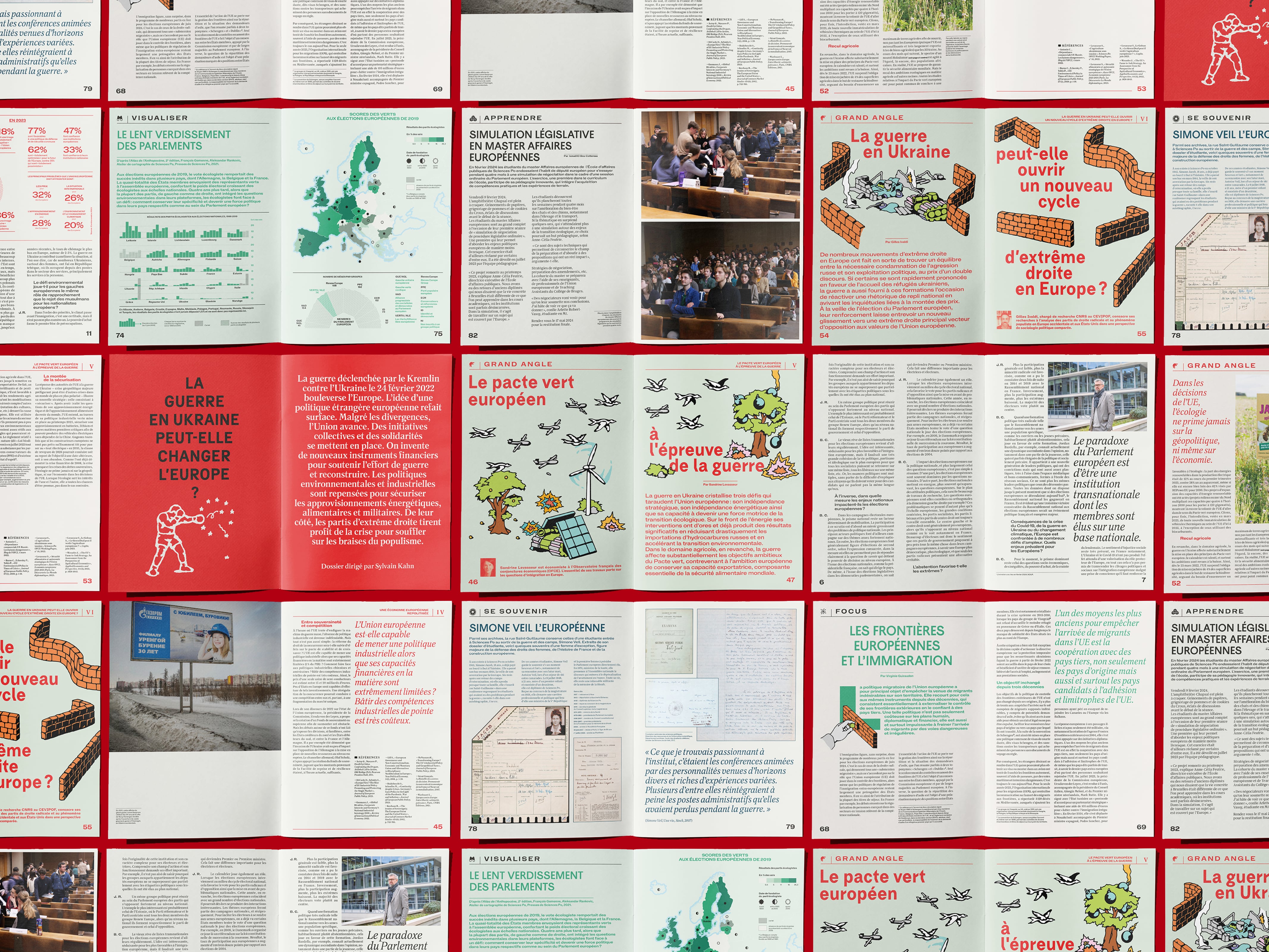 Sciences Po, also known as the Paris Institute of Political Studies is a research university located in Paris, France. They have their own publishing house, mostly publishing essays from researchers. They are now launching a bi-annual magazine focusing on the actuality of research, with a political angle. The first issue, released in April 2024, is titled “Une Europe fragmentée ?” which translates to “A Fragmented Europe?”. The many illustrations opening most articles are by Félix de Combat.