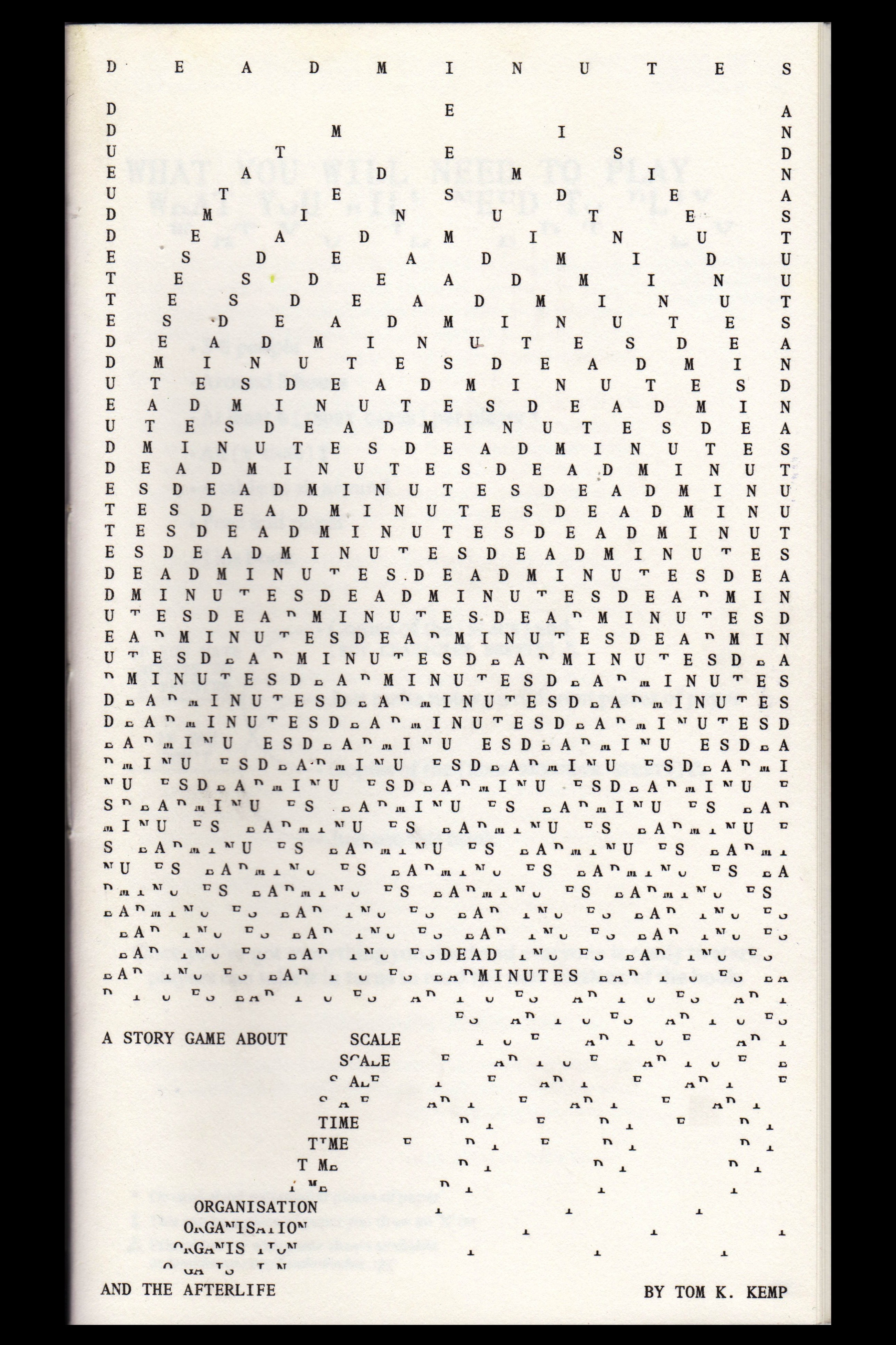 Dead Minutes is a storytelling game by Tom K. Kemp about systemic change in an undesirable afterlife. You, the players, will decide what this hell, underworld or land of the dead is like, what its problems are, how change happens there, and what the complications might be when altering something so big, involving so many dead people, over so much time. It’s a game about impossible seeming actions at impossible seeming scales, making difficult choices, and dealing with unexpected outcomes.