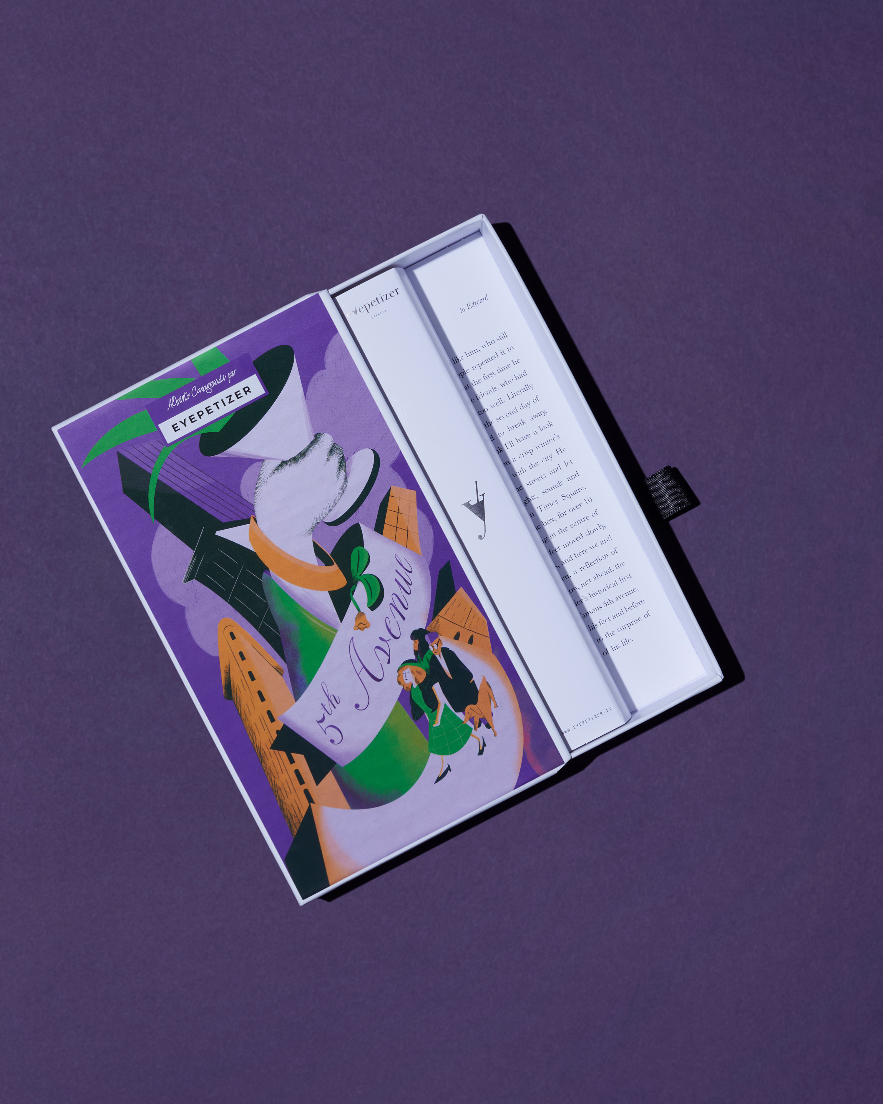 Box collection for boutique eyewear brand Eyepetizer for the Winter Collection 2023. Each box visually explores a narration linked to the shape and style of the glasses. Pritzious was used in the 5th Avenue pack, conveying the fashion allure of New York City.