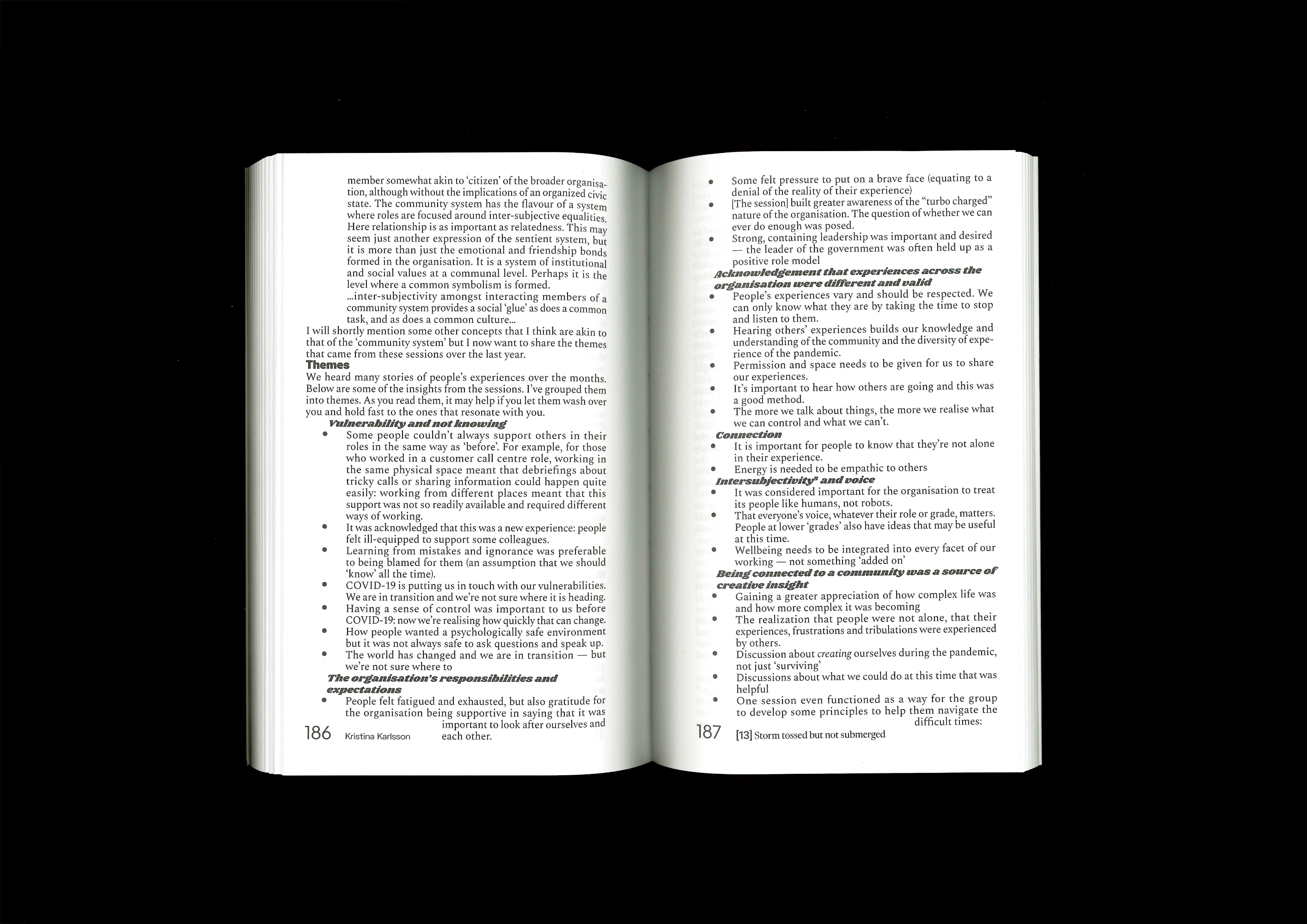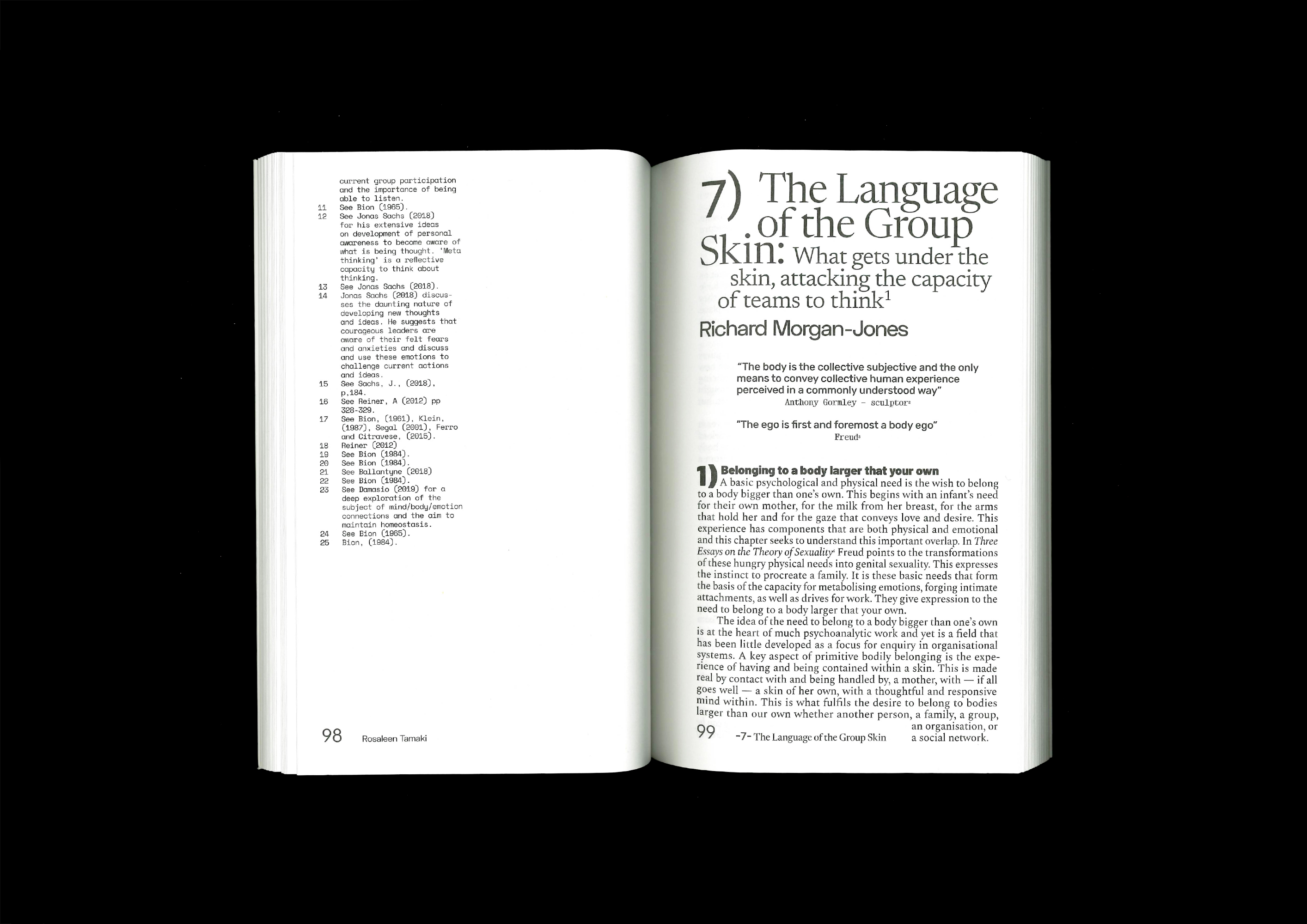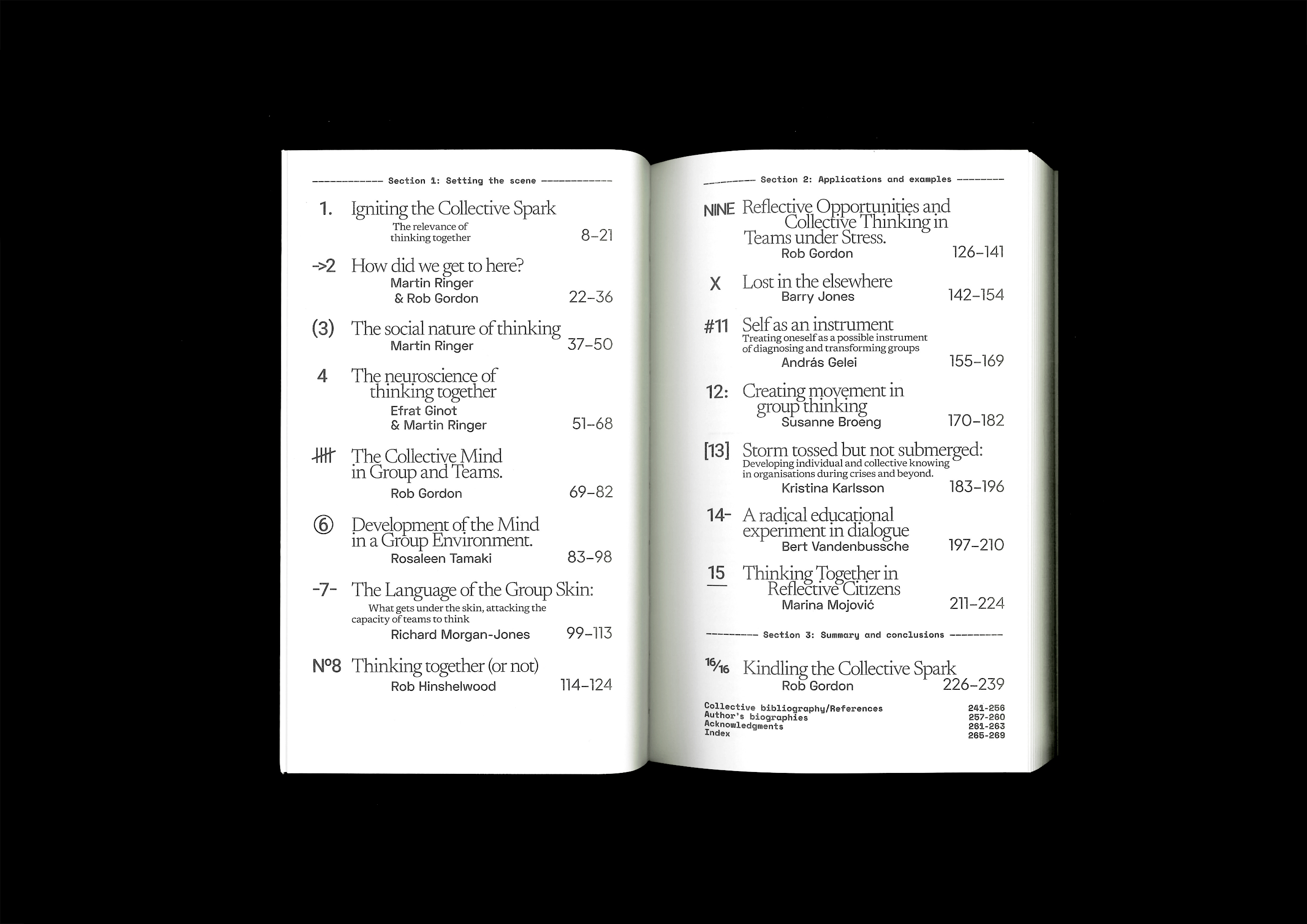 The design of the book was inspired by the layout of the original text documents of the writers. Everyone has their own way of numbering and listing elements in their text. Every chapter of The Collective Spark starts with its own unique numbering system. This also helps the reader understand that it is the start of a new insight and perspective on the topic. Additionally, many different typefaces are used to reflect the idea of input from various sources.