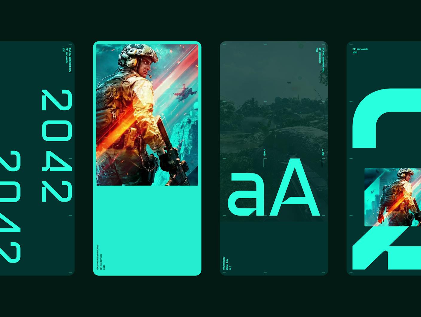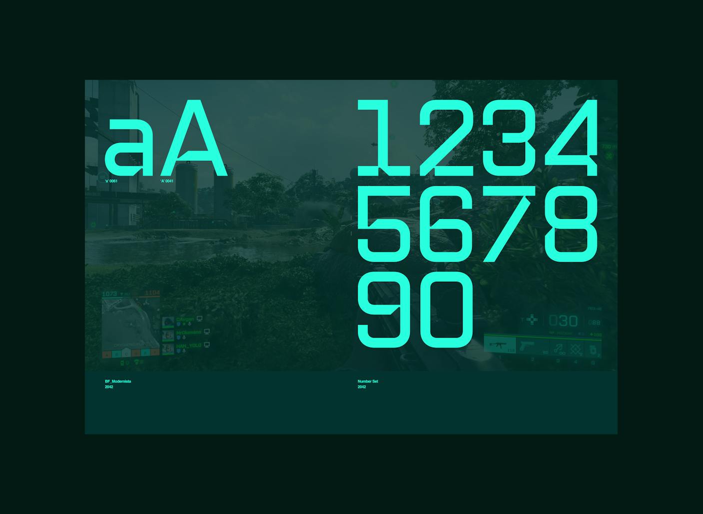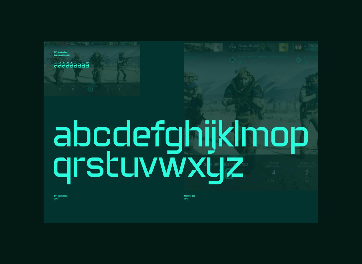 The fonts used in the game are Purista by Suitcase Type Foundry and BF Modernista, a custom typeface designed by Lundqvist & Dallyn for the game. The latter is also used for the numerals in the logo of the game. The condensed grot caps used for “Battlefield” are from an unidentified typeface – Grand comes close.