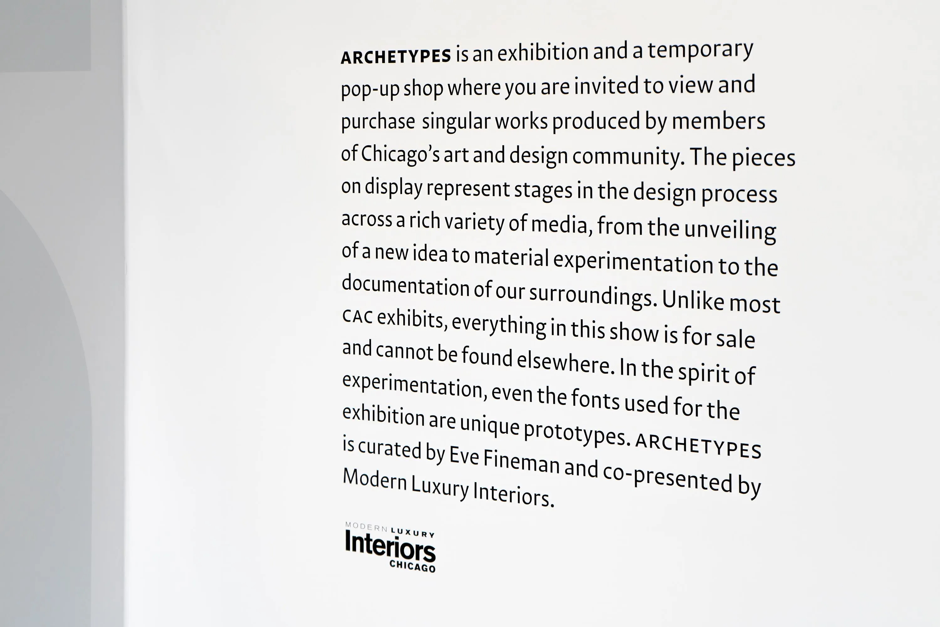 Archetypes is a designed object pop-up shop featuring prototypes, passion projects, and other one-of-a-kind items produced by the Chicago architecture and design community. Pieces range from chairs and tables to glassware, ceramics, and artwork, with a focus on singular pieces that are iterations of a larger creative and design process.