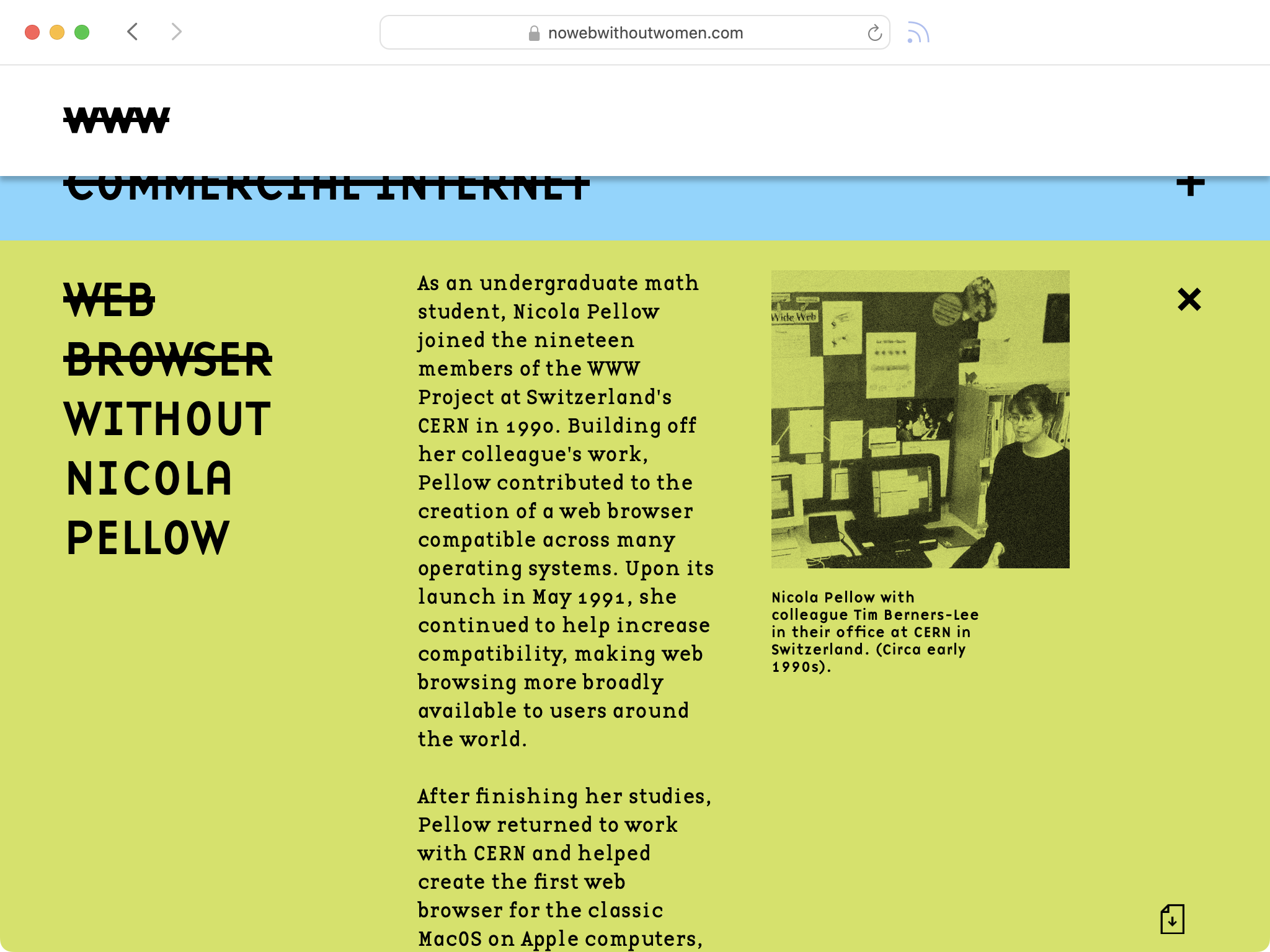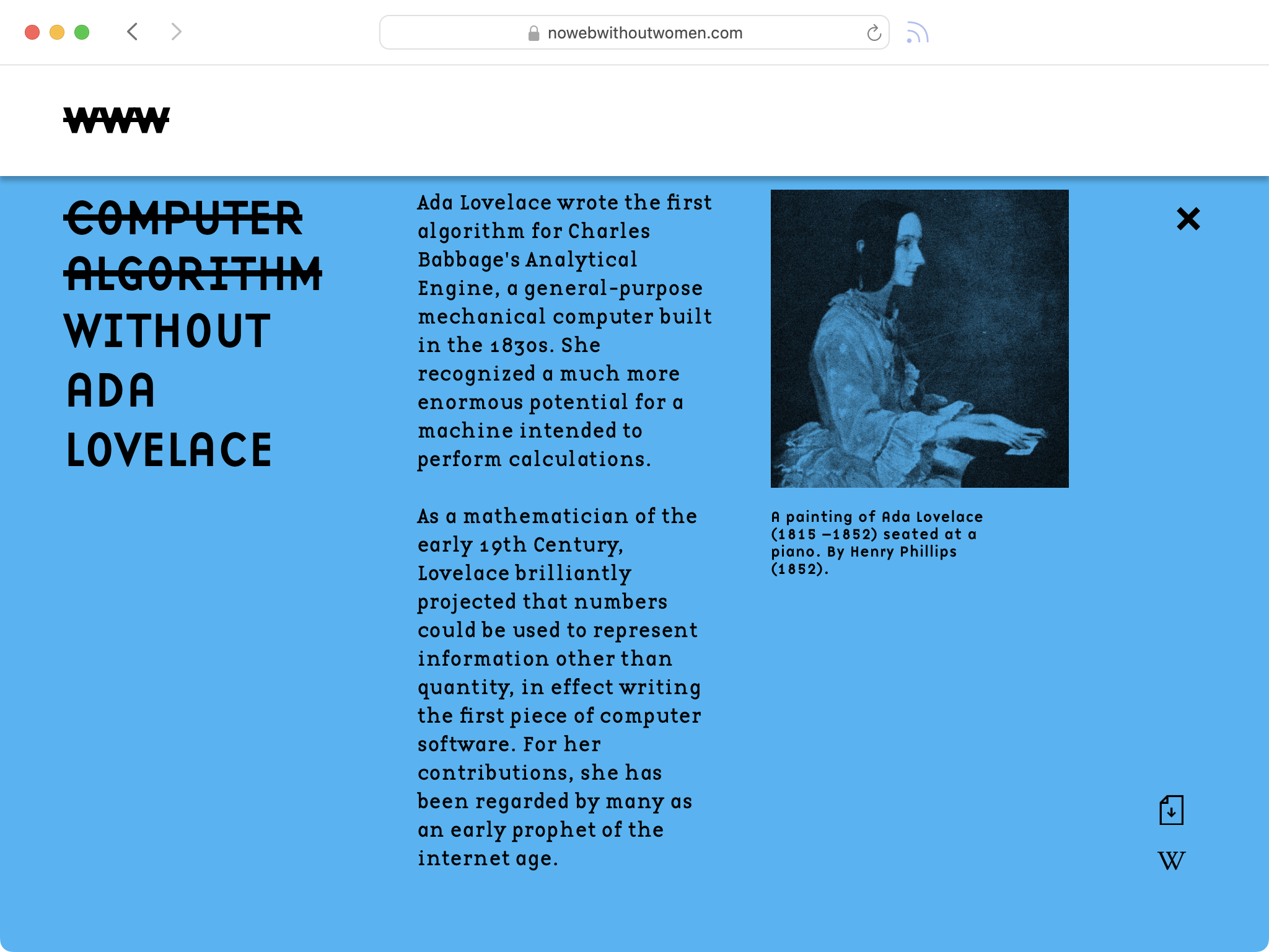 No Web Without Women is “a collection of innovations by women in the fields of computer science and technology”. The project features short bios of women who were instrumental in the development of everything from wireless transmission technology (Hedy Lamarr) to the web browser (Nicola Pellow ), computer iconography (Susan Kare), and more. There are also downloadable PDF posters for each of the featured innovators.