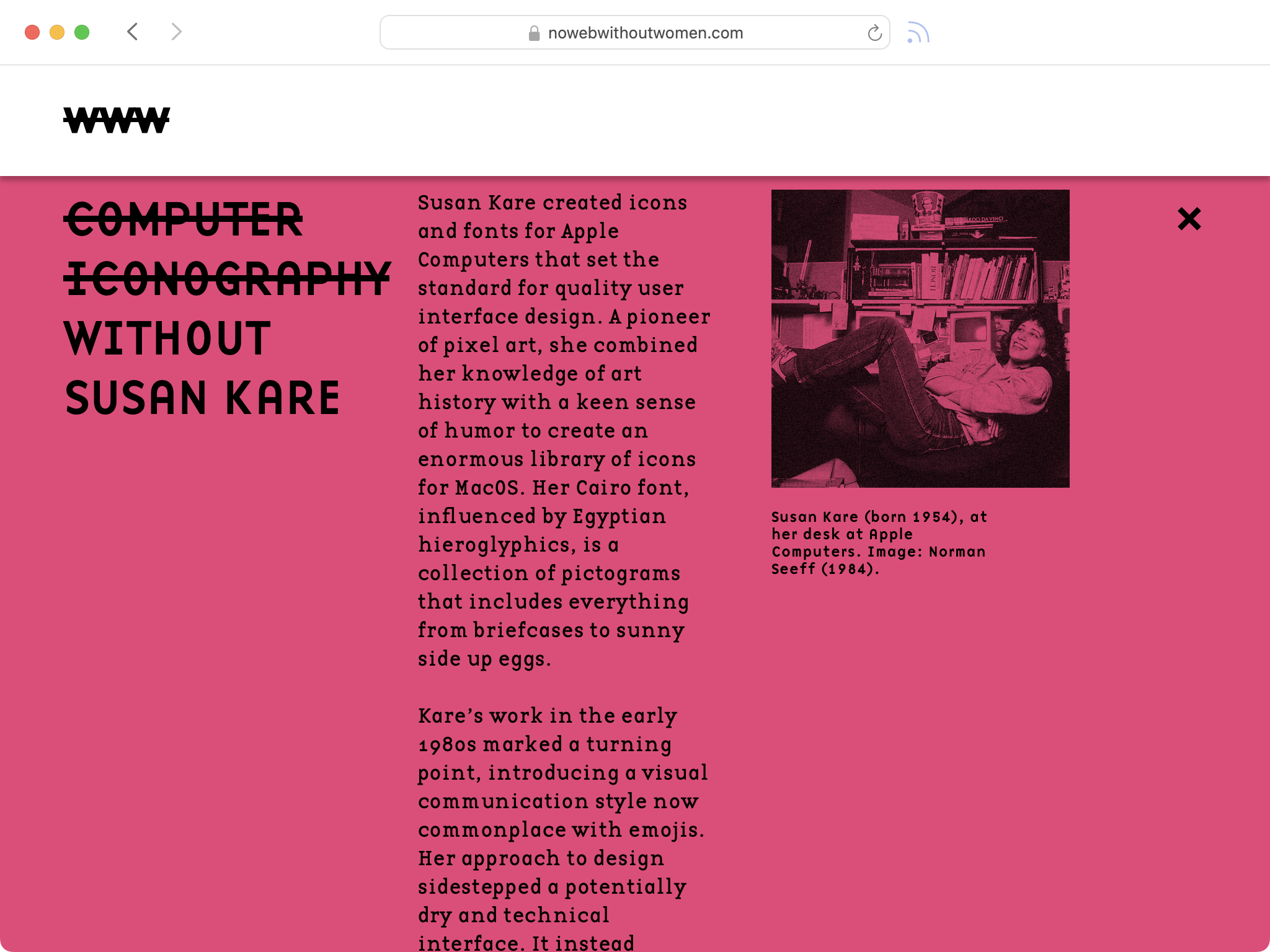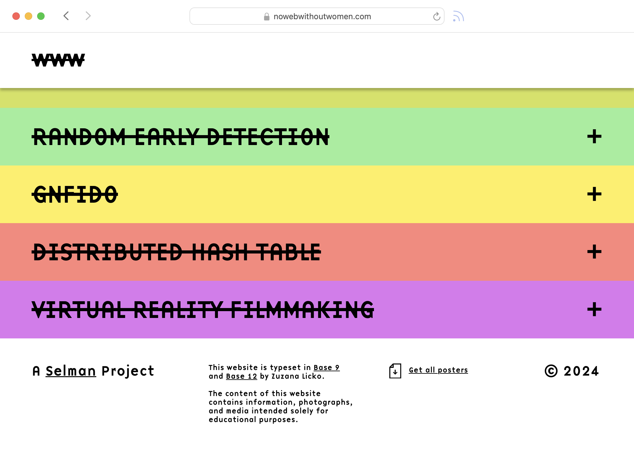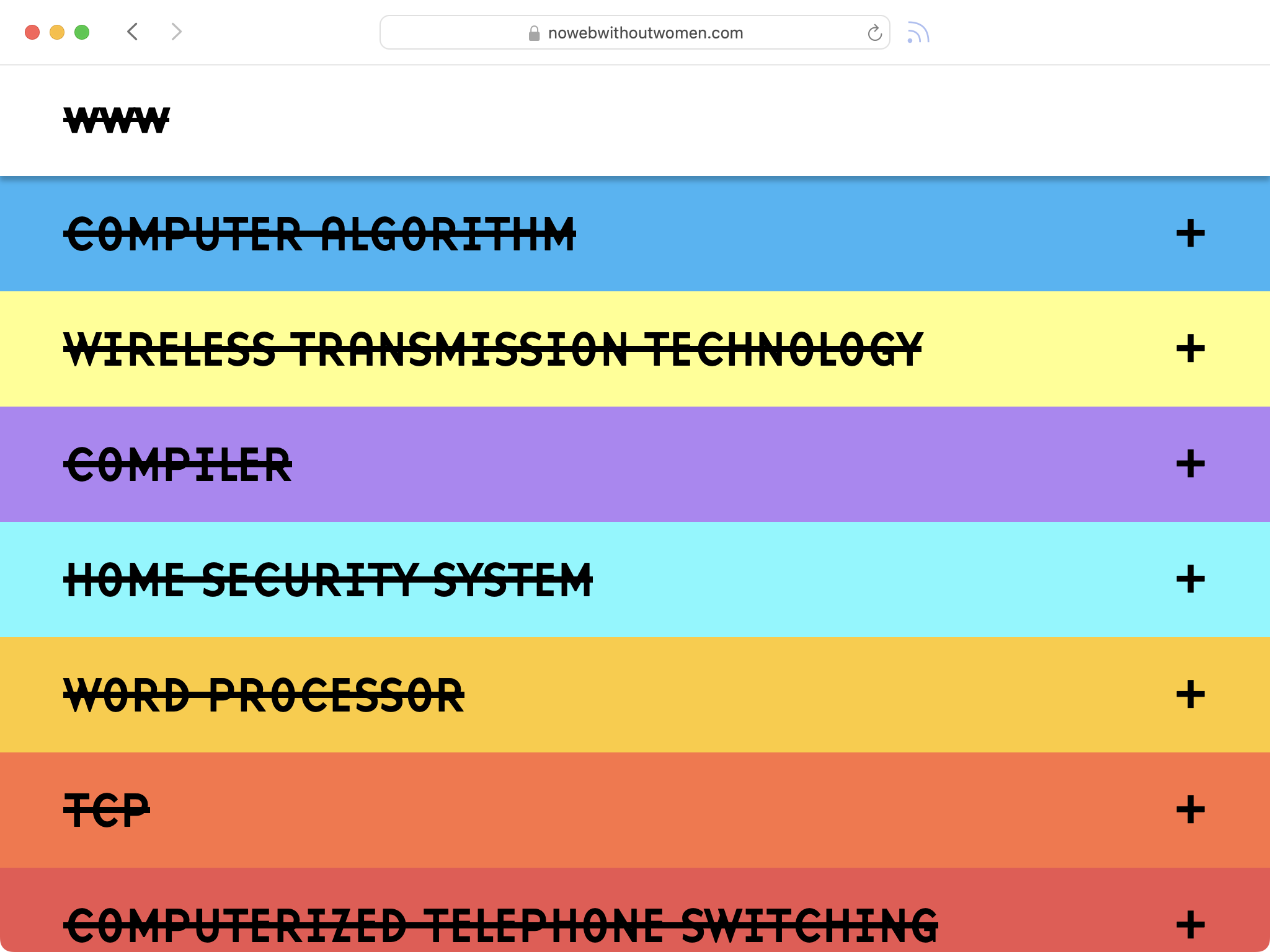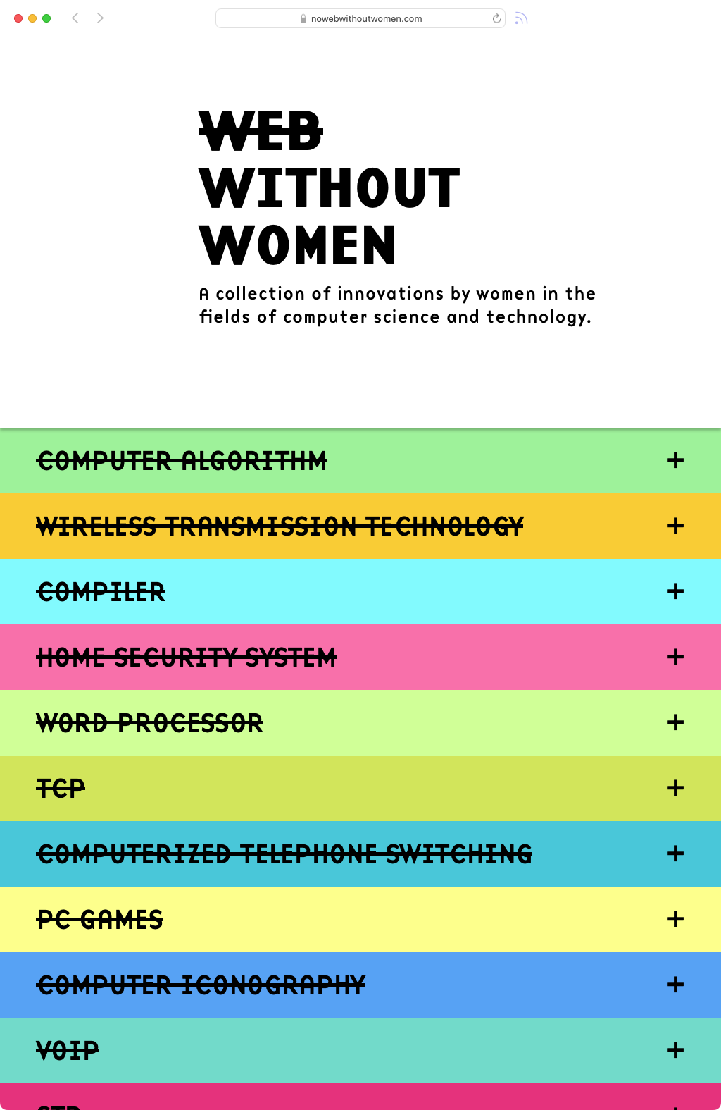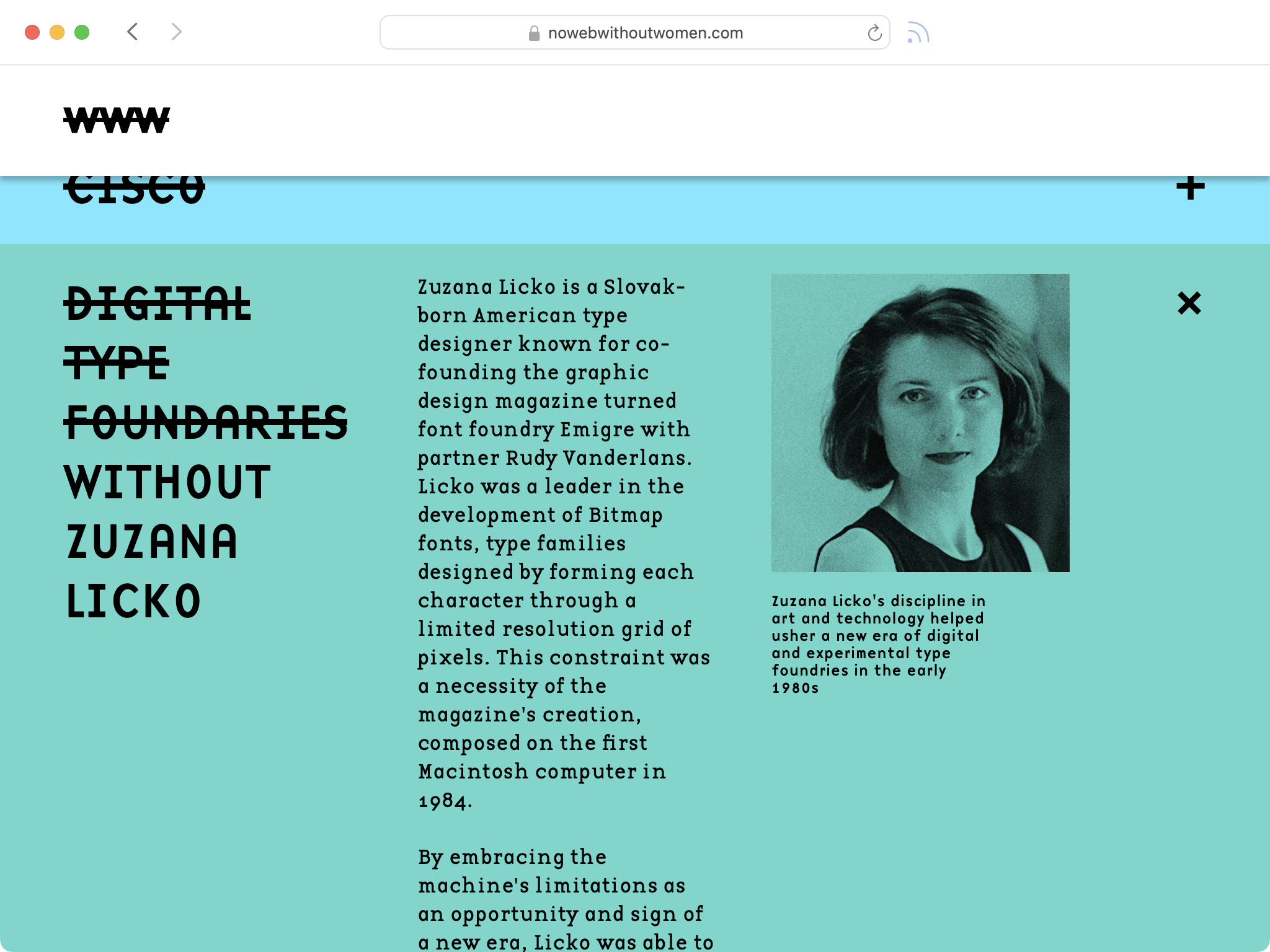 The single-page website is a Selman project, released for Women’s History Month in March of 2020. The entire page is typeset in Zuzana Licko’s Base series of typefaces, with Base 9 Sans used for headings and captions, and Base 12 Serif used for paragraph text. (Licko is also one of the women featured in the project, due to her role ushering in the era of digital type foundries.) The colorful design makes heavy use of the strike-through as a design element to emphasize how each of the listed innovations wouldn’t exist as they do today without the contributions of these women.
