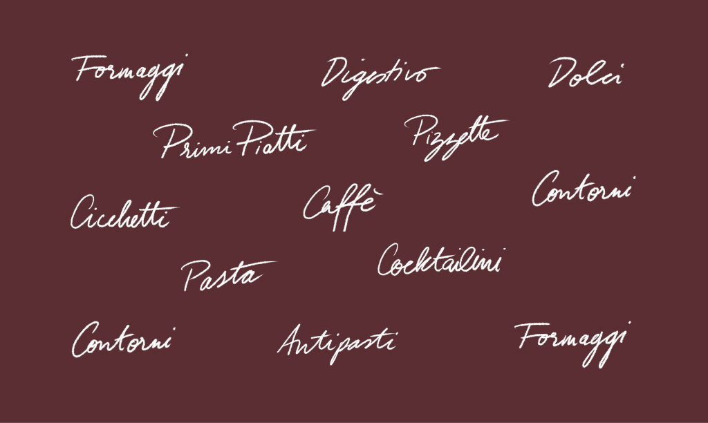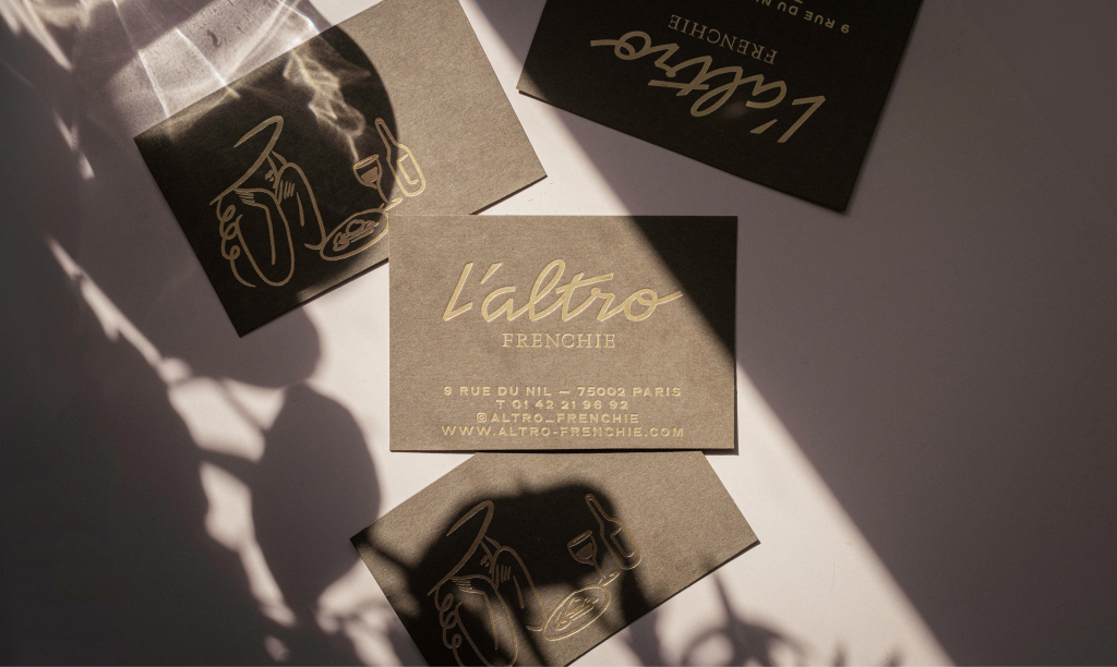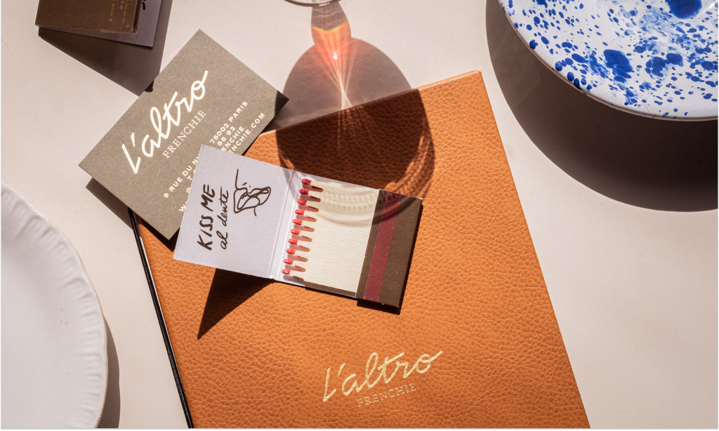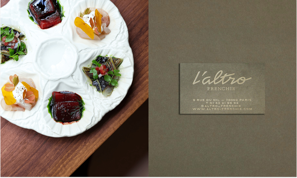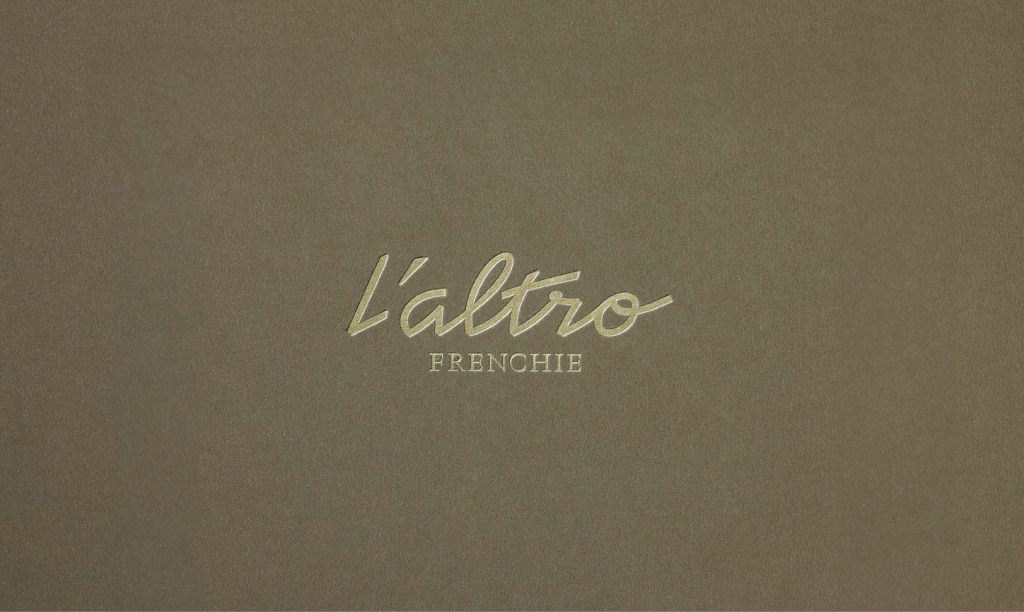 L’altro Frenchie, by Michelin Star chef Grégory Marchand, is a bistronomic restaurant nestled in the heart of Paris. Its cuisine is deeply rooted in italian gastronomic culture with influences from London and New York and executed with local ingredients only. The graphic design reflects that vibes using classic style fonts like Neuf by Eliott Grunewald twisted with Traulha by Yoann Minet and handwritten words by Dez Gusta, dubbed “Dazed Signature”. The “L’altro” wordmark was custom drawn by Keussel.