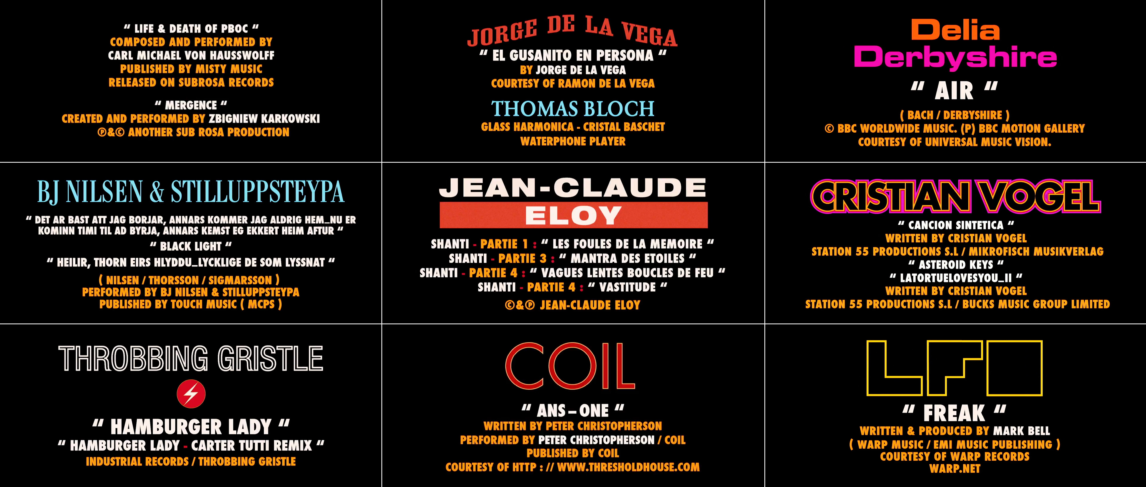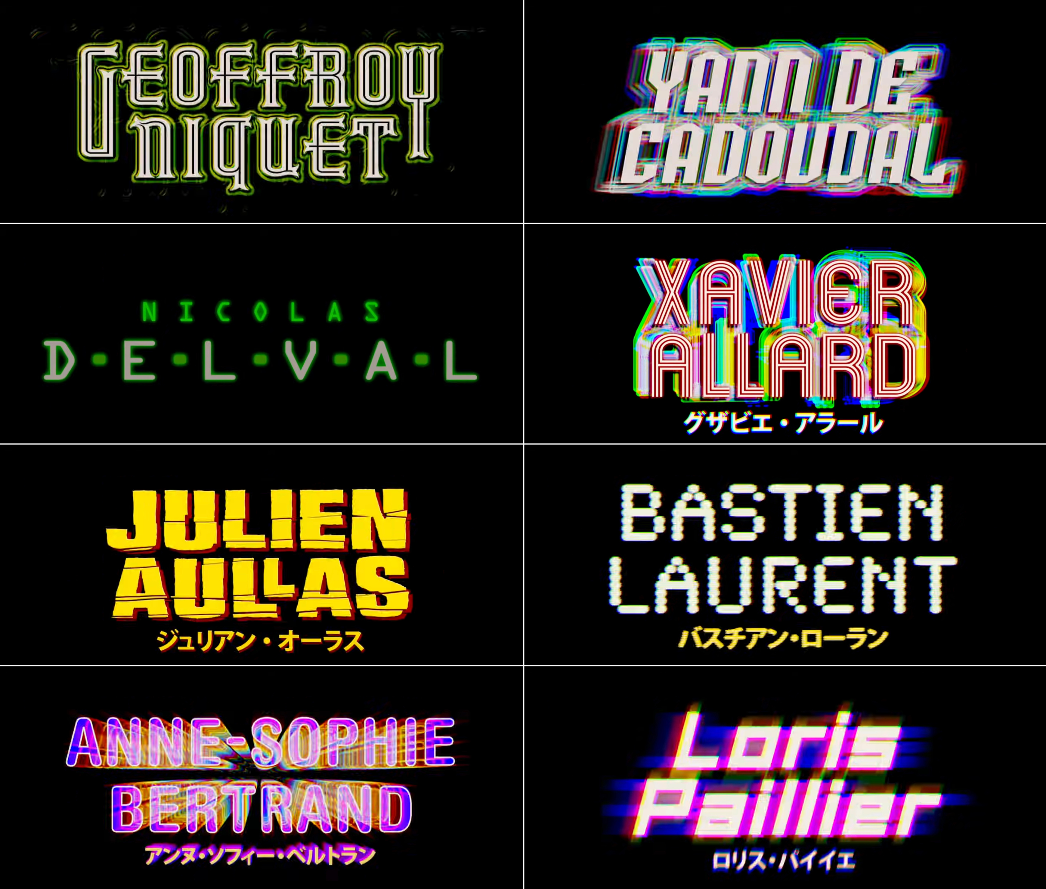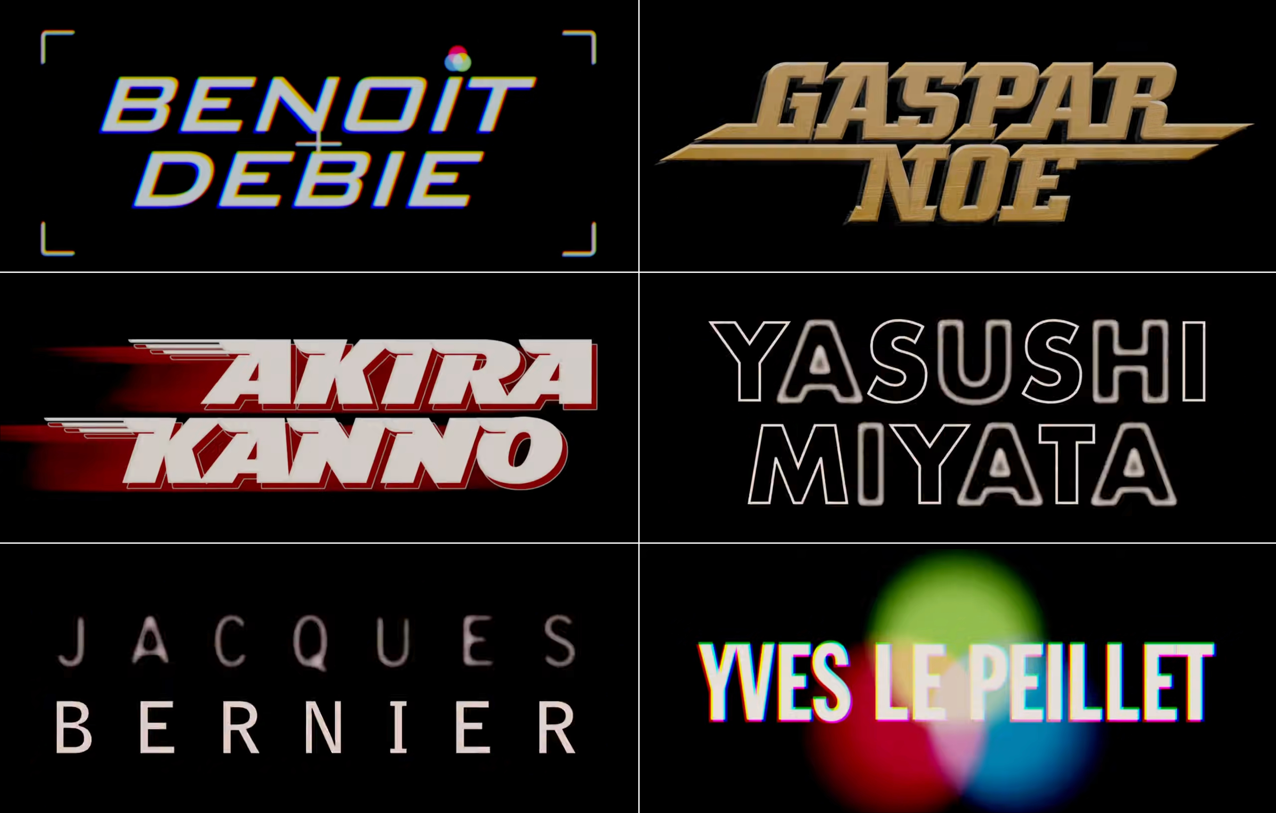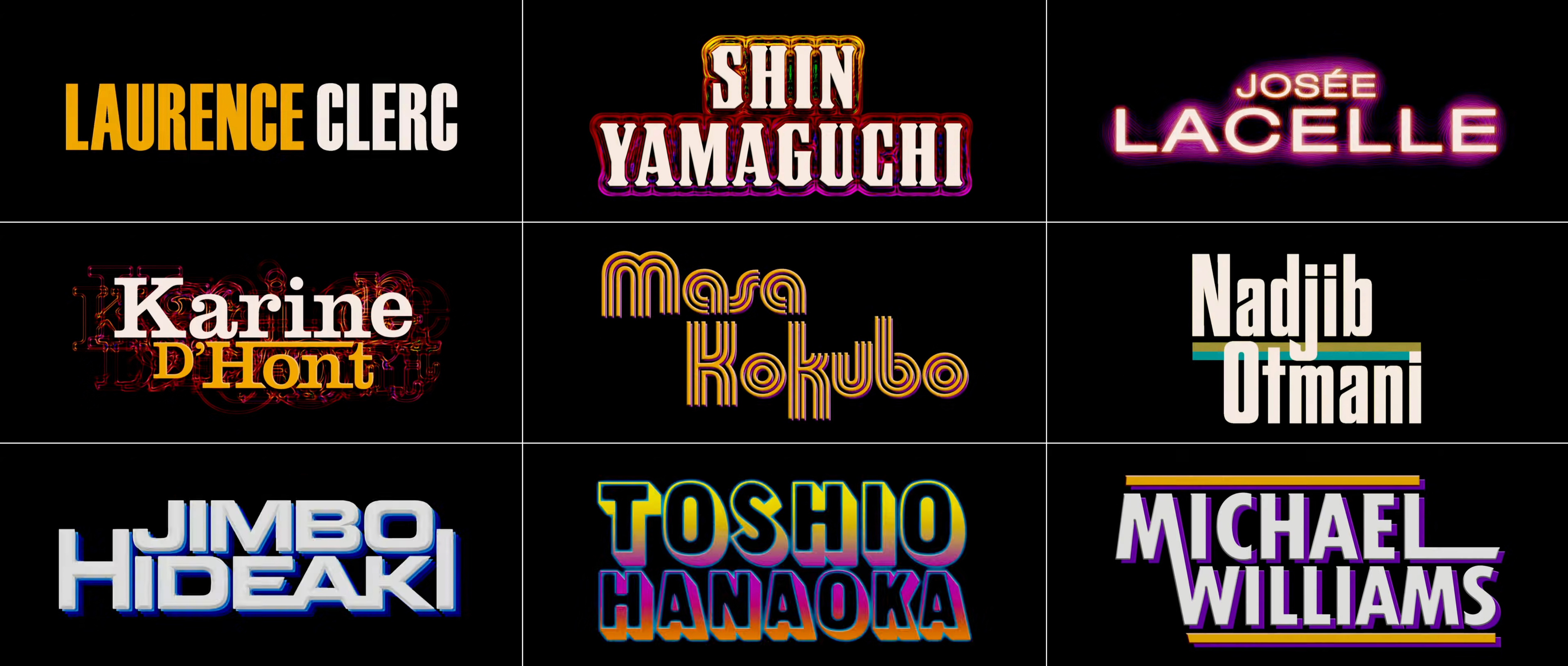 Sound and editor credits with Eurostile (Ken Yasumoto), stretched Ironwood (Ryotaro Harada), contoured Nasalization (Claude Lahaye), an upright LCD typeface, probably Digital (Thomas Bangalter), a heavily modified Sonic or another font inspired by the Star Trek TNG logo (Lars Ginzel), Galledis with hyperextended lines (Gaspar Noé), modified SF Archery Black (Marc Boucrot), Zaius, a typeface family emulating the Planet of the Apes movie series logo (Jerome Pesnel), and ITC Machine (Pierre Buffin).