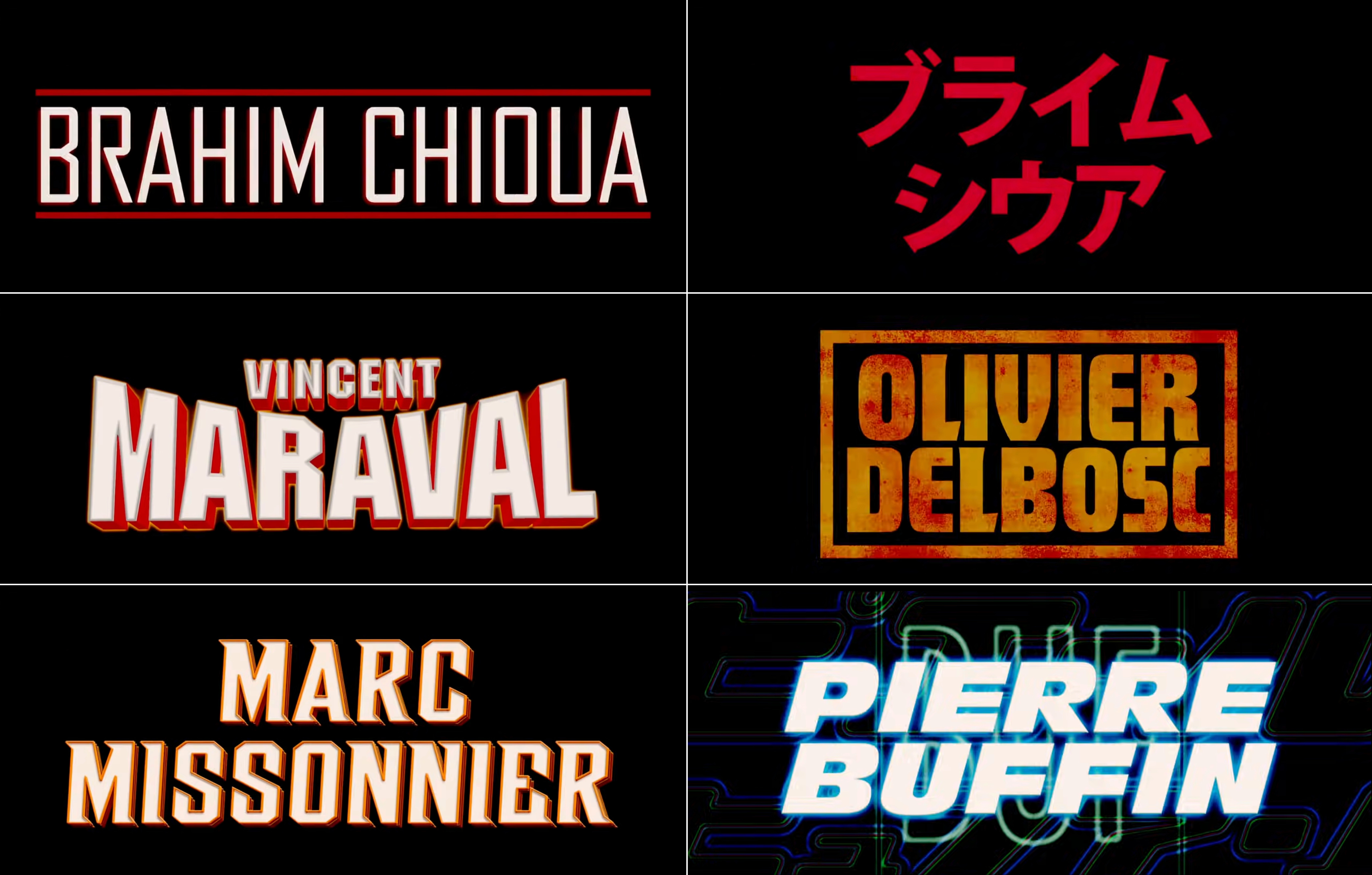 The choice of typefaces came rather naturally. After coming up with a large selection in line with the film’s mood, we simply chose the ones that best suited the characters and the personalities of those in the team. Gaspar wanted each title to reflect the person it concerned. It was a beautiful homage and proof of his respect for the members of the team — a way to thank them.