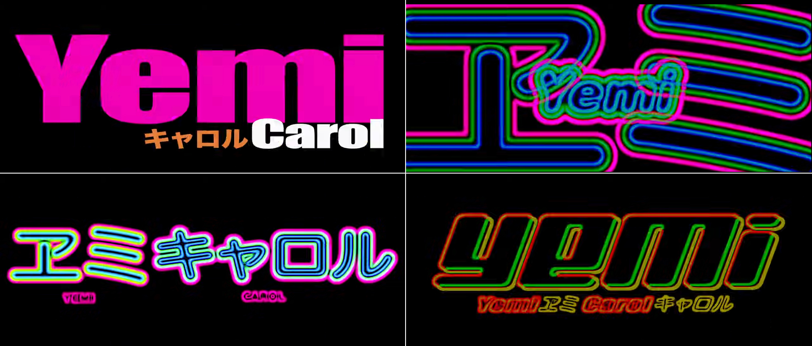 Yemi Carol is presented in Impact Wide, Helvetica Rounded, and a Japanese Maru Gothic. The font shown at the bottom right is unidentified.
