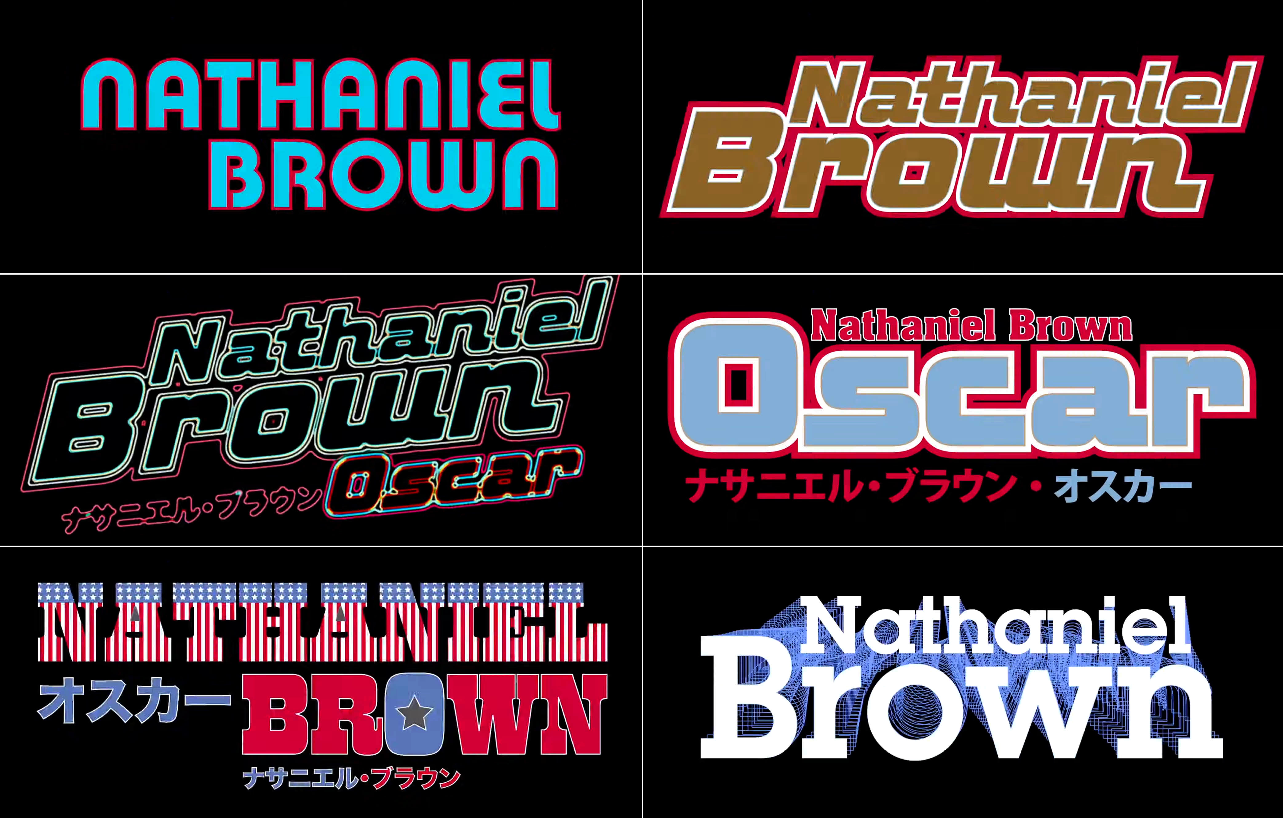 Nathaniel Brown’s name is shown in Pump, ITC Bolt, Aachen, West Barnum Block filled with stars and stripes, and ITC Lubalin Graph Demi.