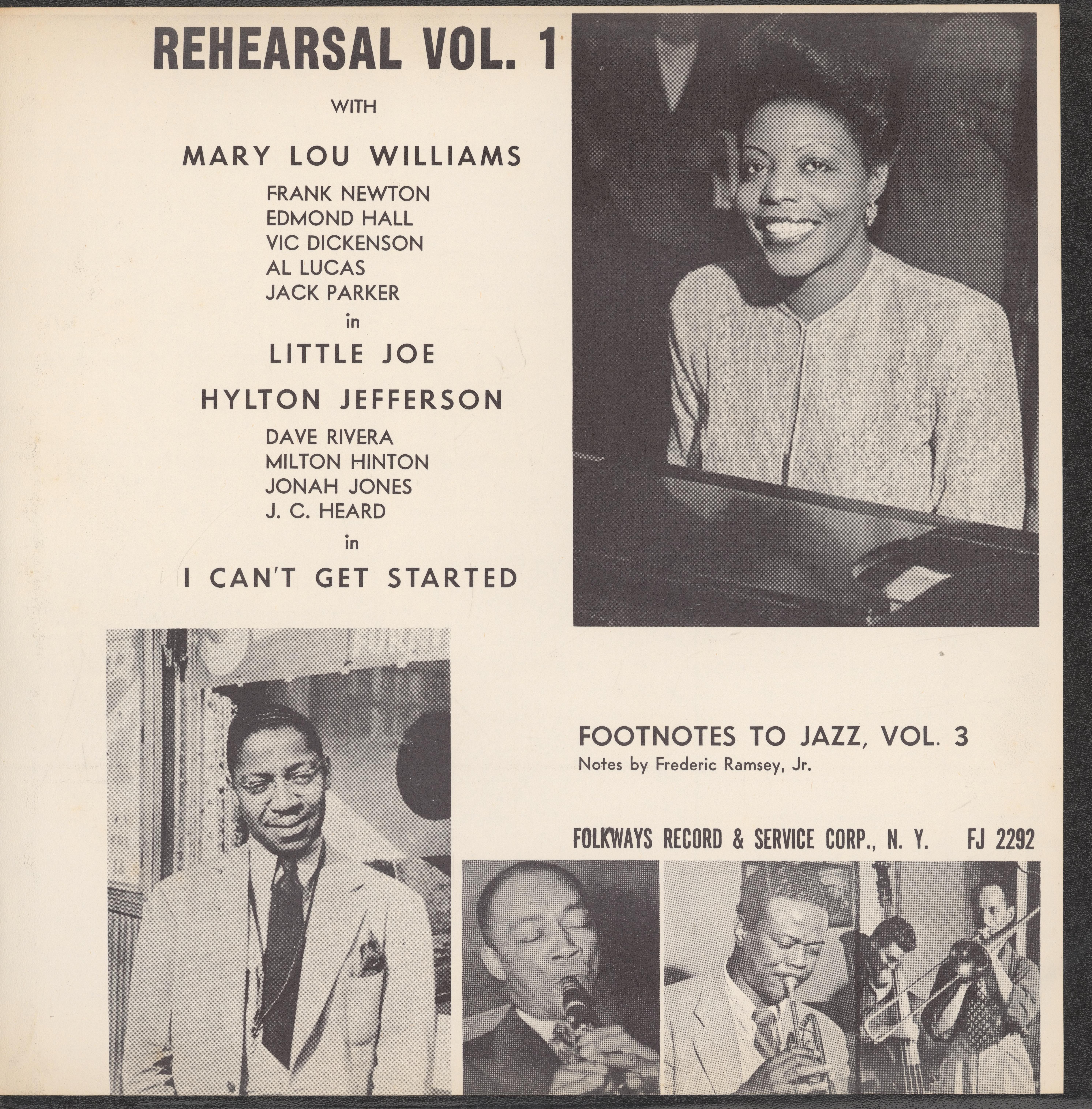 Rehearsal Vol. 1 was released by Folkways Records in 1951. It’s a 10″ LP that contains two jazz songs rehearsed by Mary Lou Williams and Hylton Jefferson, and is the third in the Footnotes to Jazz series.