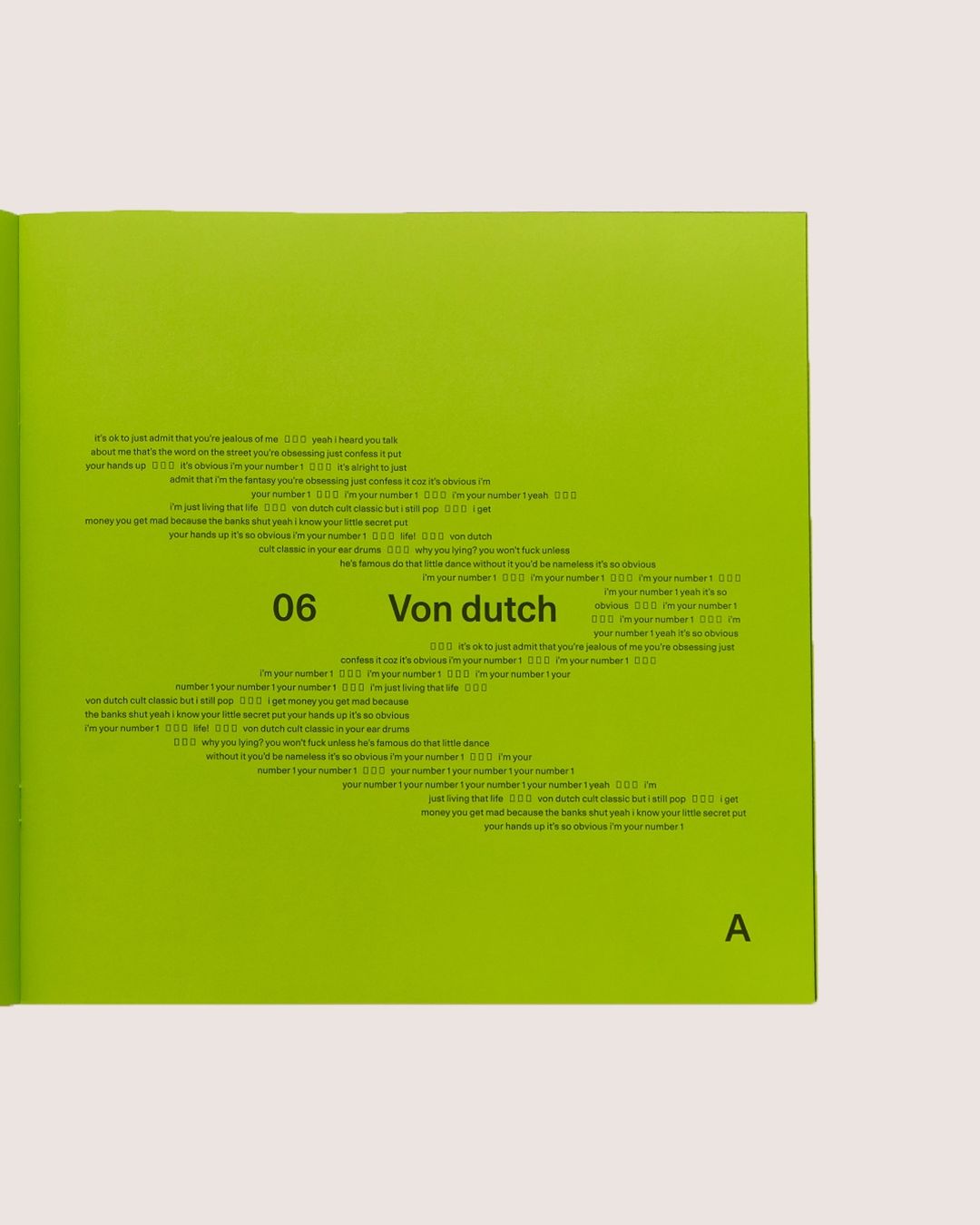 Brat is the sixth studio album of pop star Charli XCX. The cover font – Arial – is stretched and of low resolution. ABC Rom Mono is found on the vertical labels. Text on the inner sleeves is in LL Unica77, and “charli xcx” on the back cover is in a yet unidentified sans [edit: probably ITC Avant Garde Gothic, see comments].