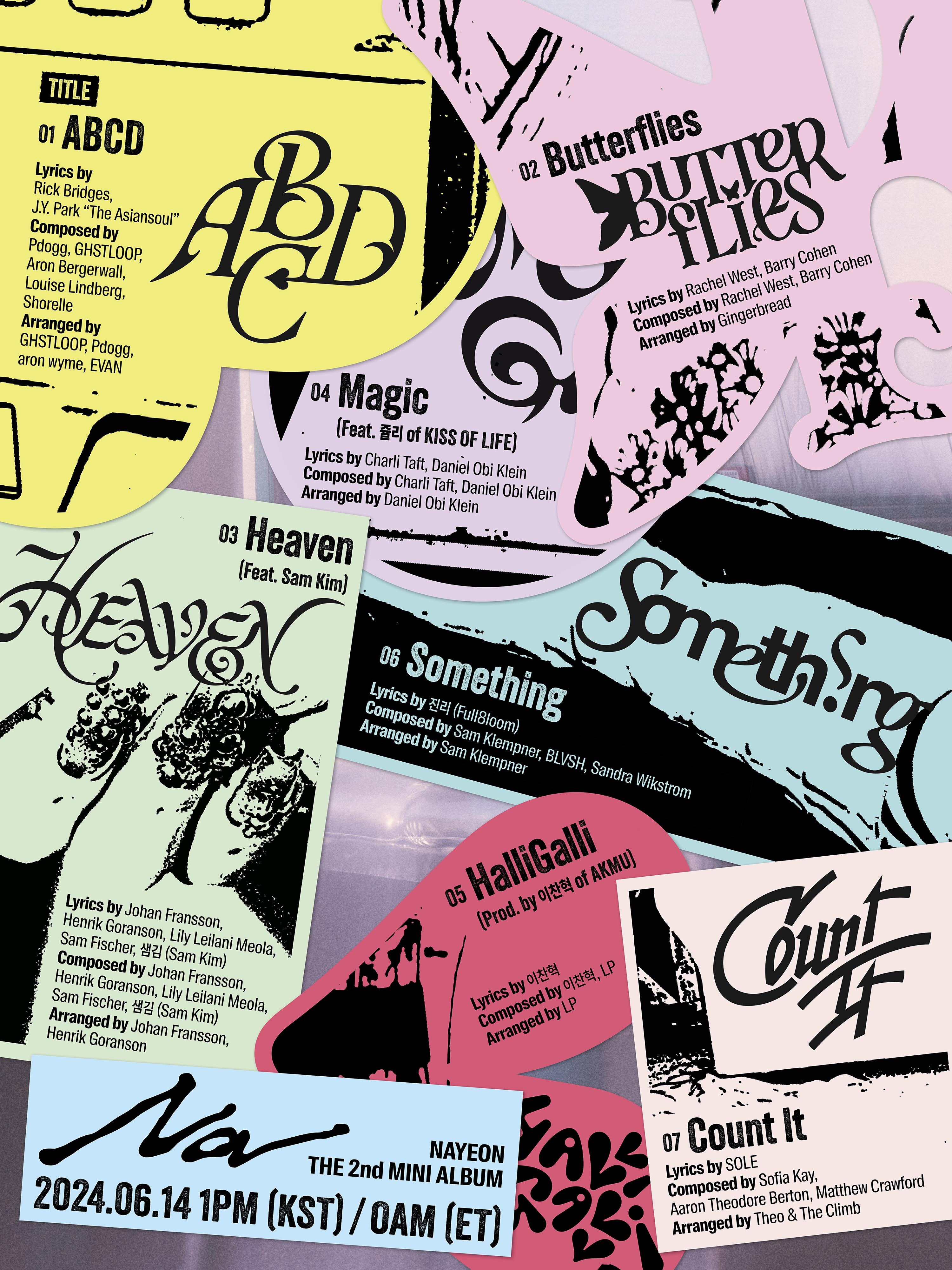 In its variegated promotional artworks can be found a sleek visual aesthetic that takes full advantage of the clean, modern look of Suisse Int’l Condensed. This choice enhances the album’s minimalist yet young design, embodying the energy of Nayeon’s music while maintaining a contemporary feel. For the promotion of the track list then, the font has been accompanied by the grunged Veneer Regular and Pretendard SemiBold (프리텐다드) for the Korean script.