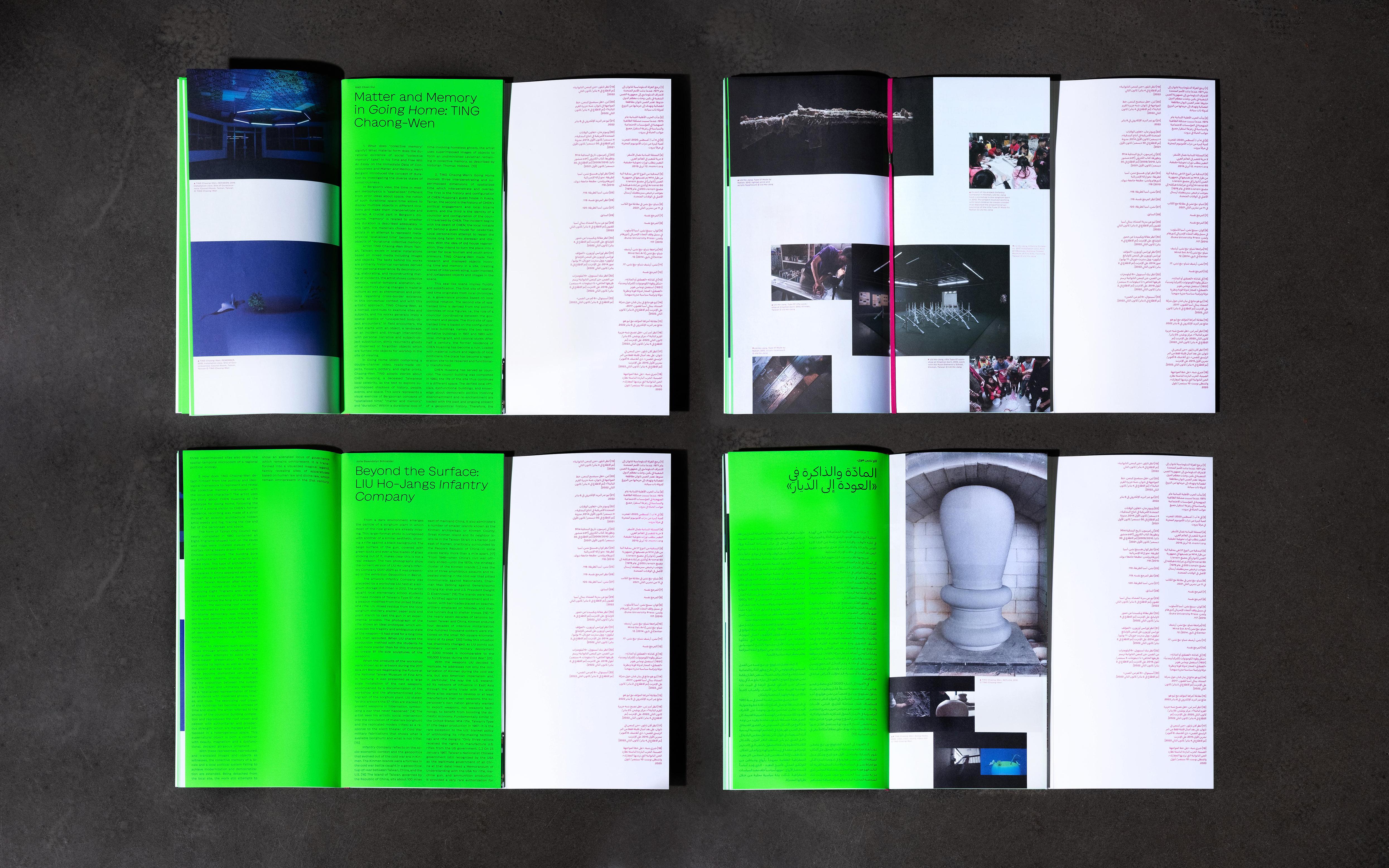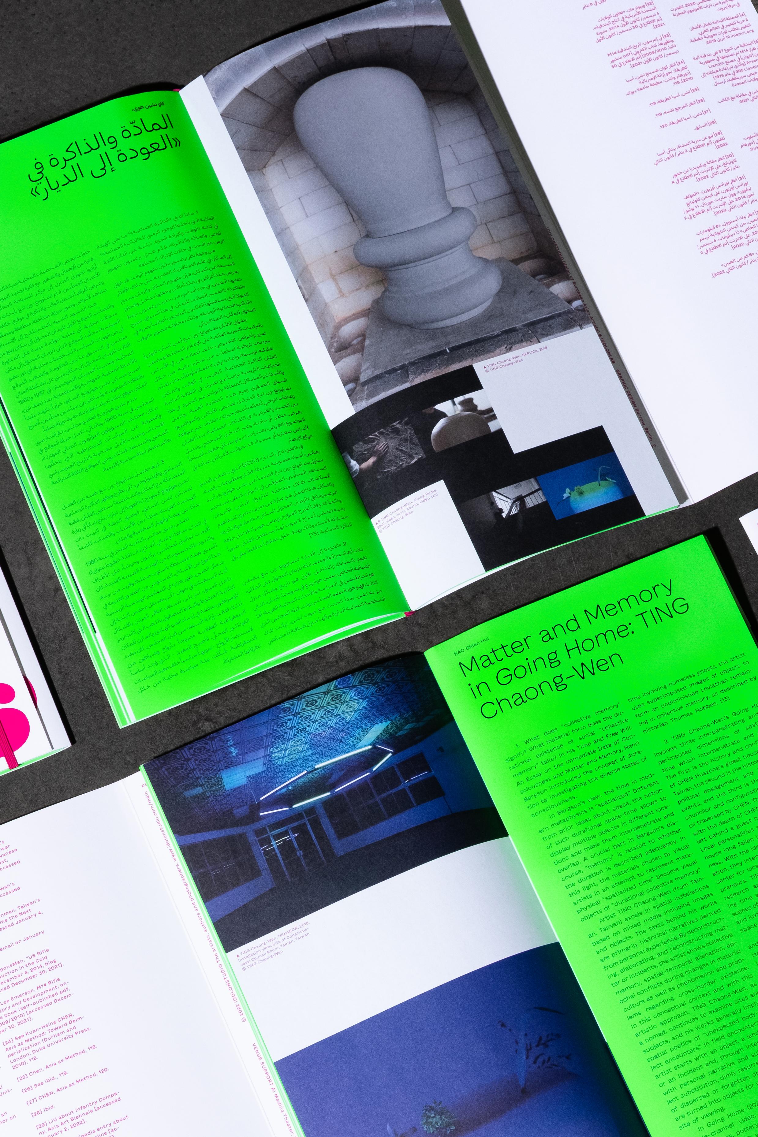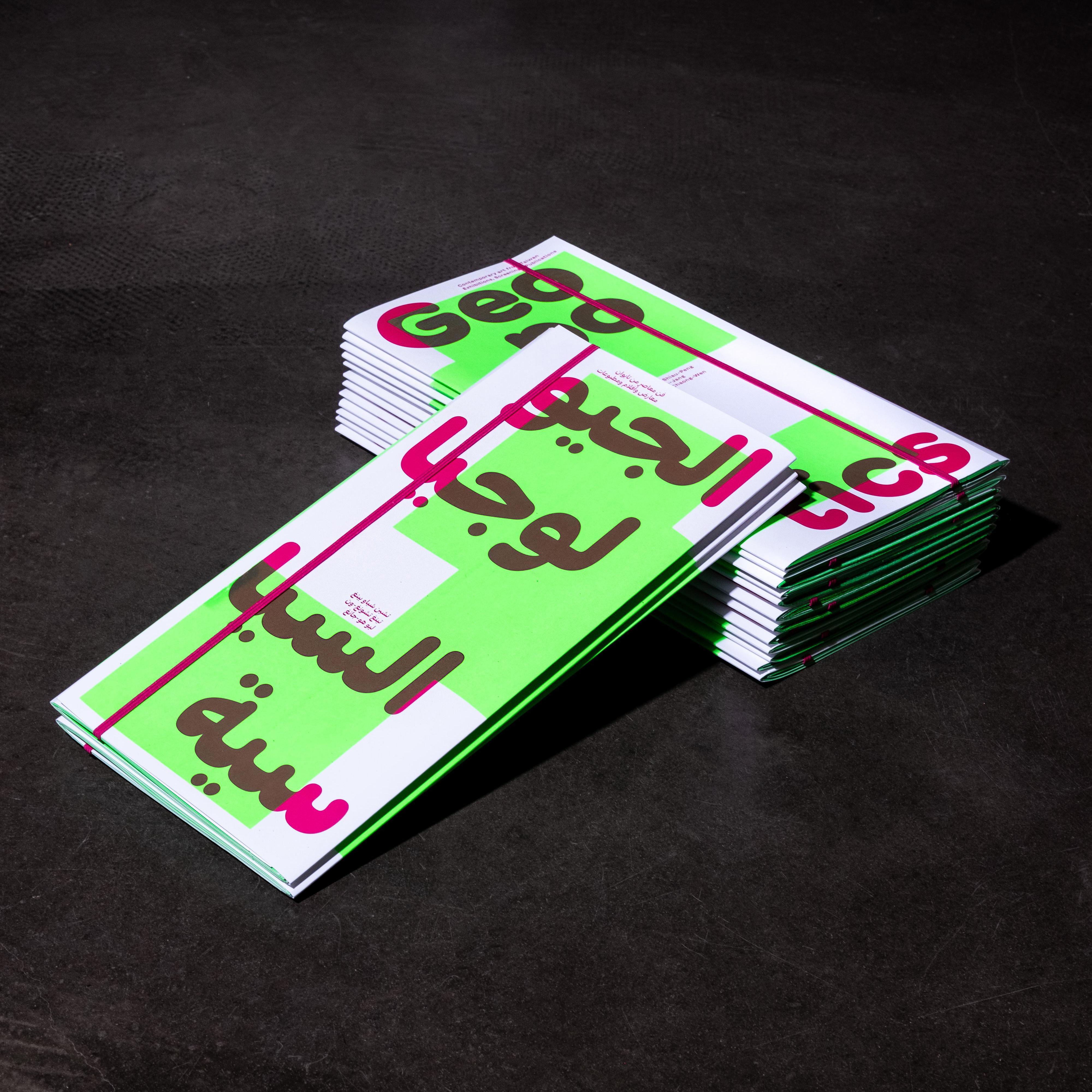 This bilingual publication features texts in Arabic and English, printed on one type of paper with distinct color schemes for each language. A magenta elastic band allows the book to be read from both sides, with two covers reflecting its dual-language format. The green silkscreen-printed cover is produced in our workshop, referencing the interior artwork.