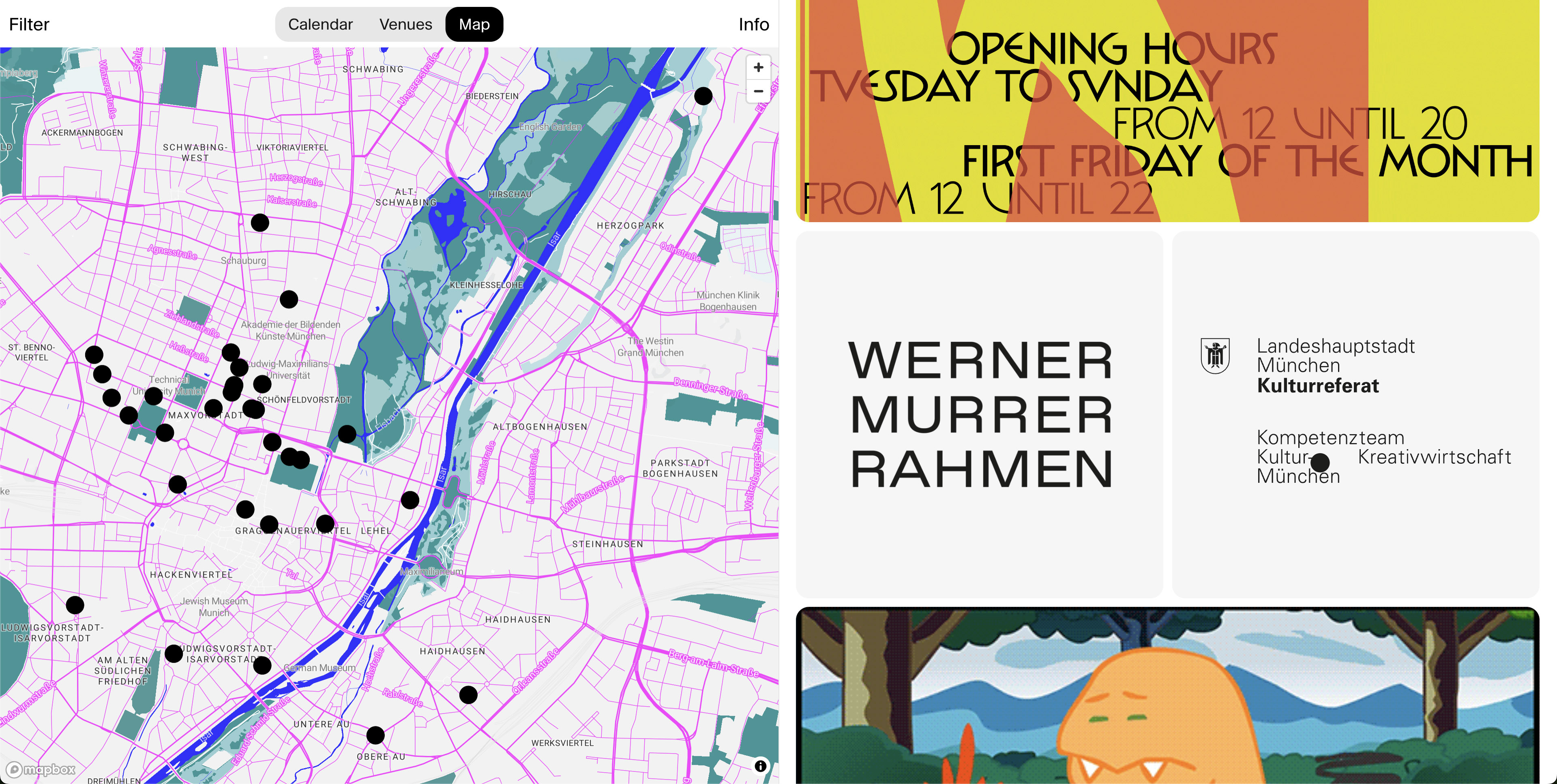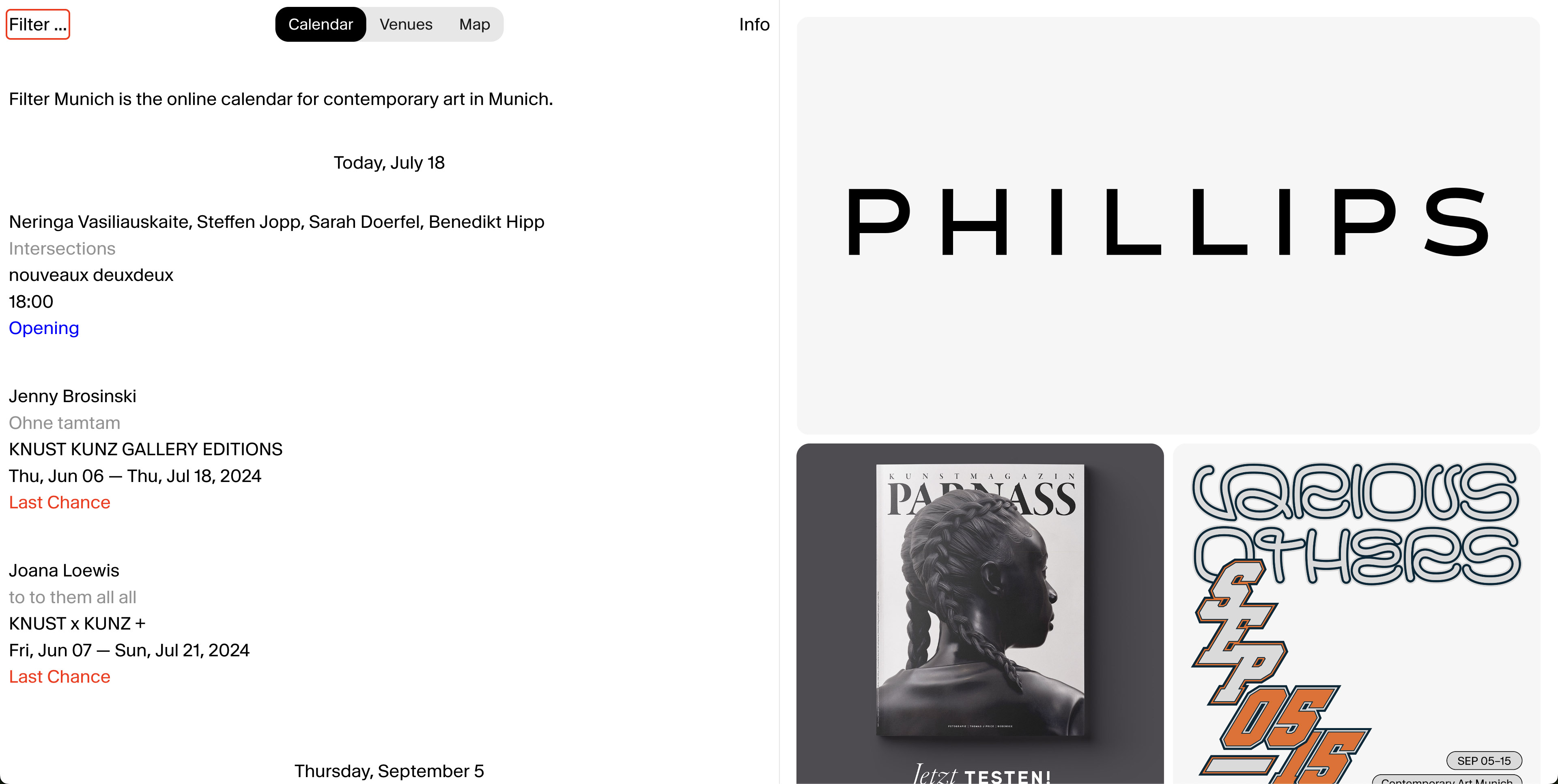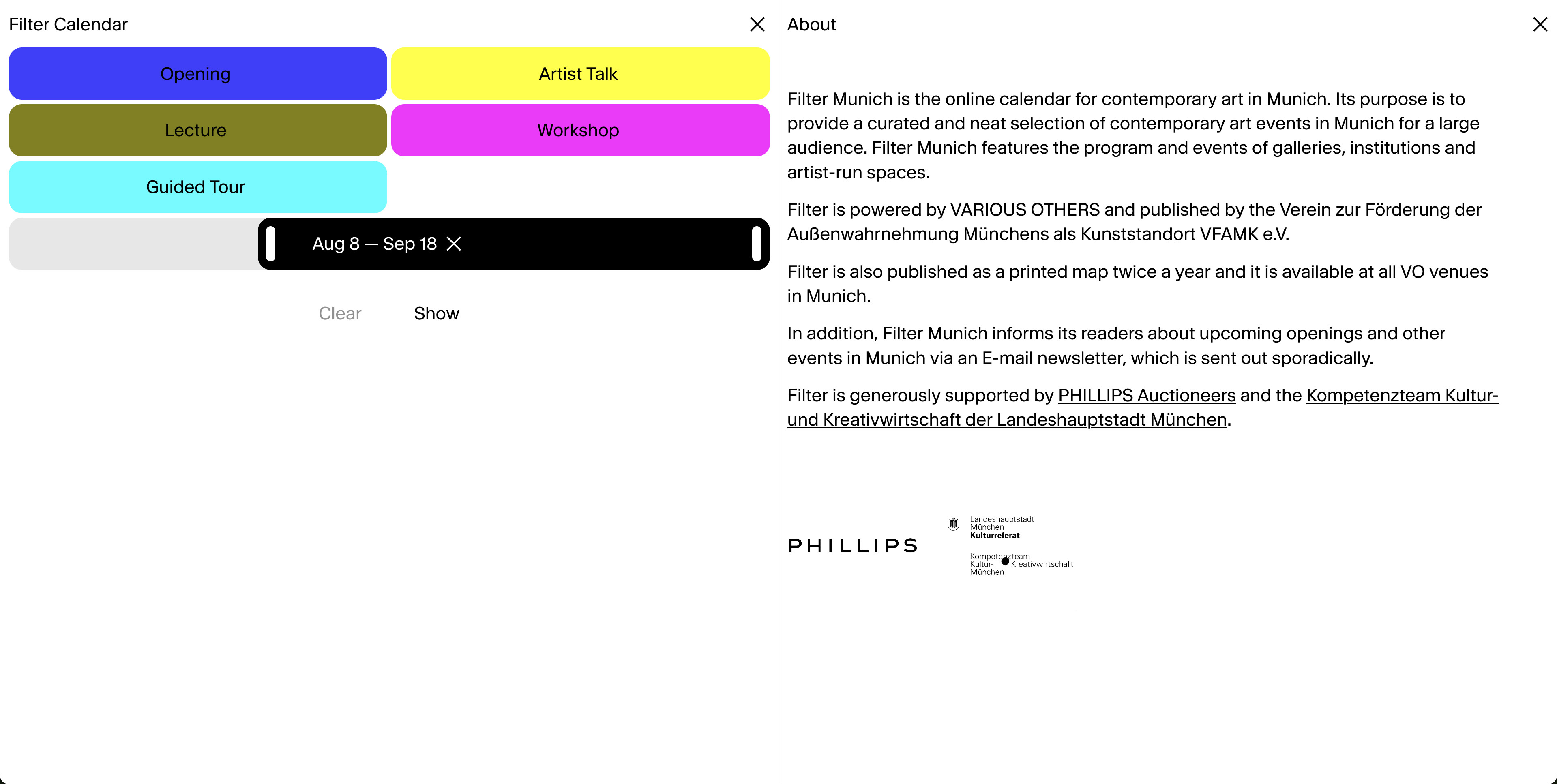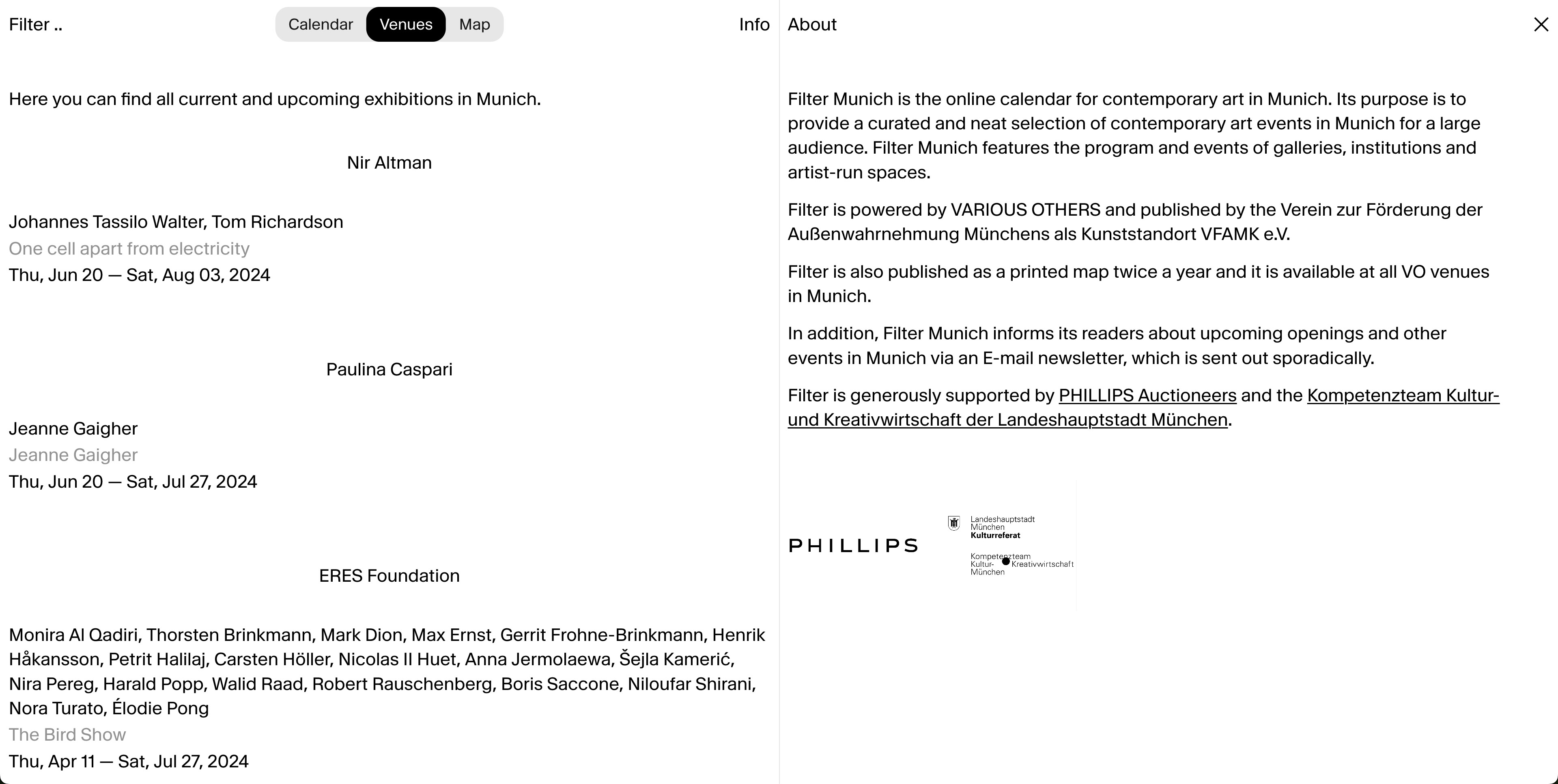 Filter Munich is the online calendar for contemporary art in Munich. Its purpose is to provide a curated and neat selection of contemporary art events in Munich for a large audience. Filter Munich features the program and events of galleries, institutions and artist-run spaces.