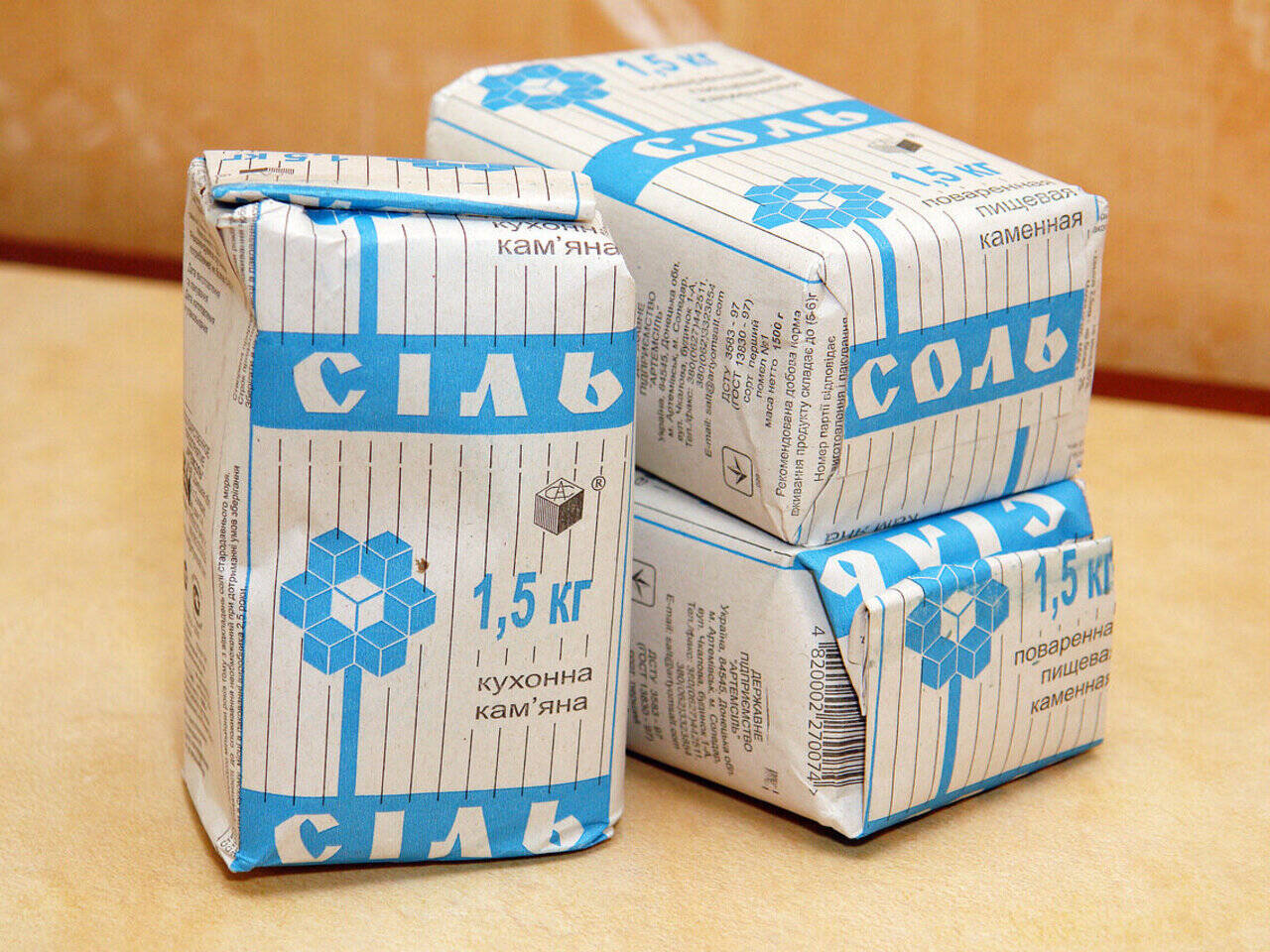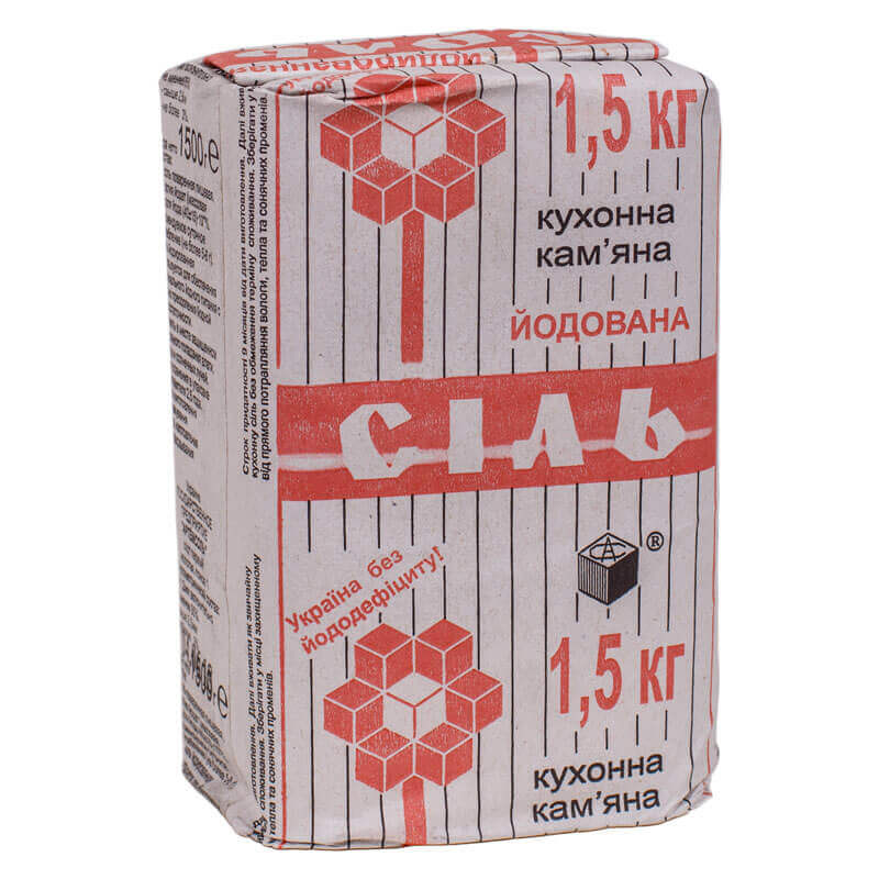 The product name (“SALT”) is shown in two languages, Ukrainian (“СІЛЬ”) and Russian (“СОЛЬ”). It uses Granit, a caps-only alphabet drawn by Pavel Kuzanyan in 1966 at Polygraphmash. The packaging design basically remained unchanged since the USSR times. The Artemsil plant logo uses Granit, too. The secondary font currently used is Arial.