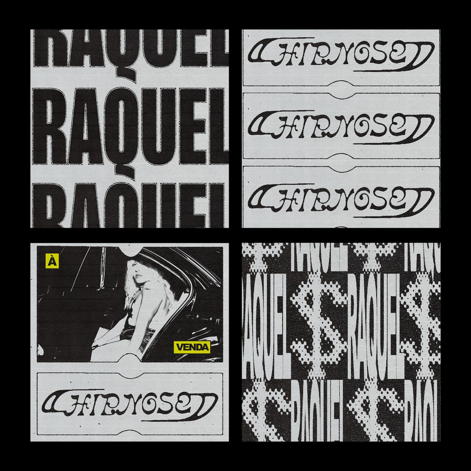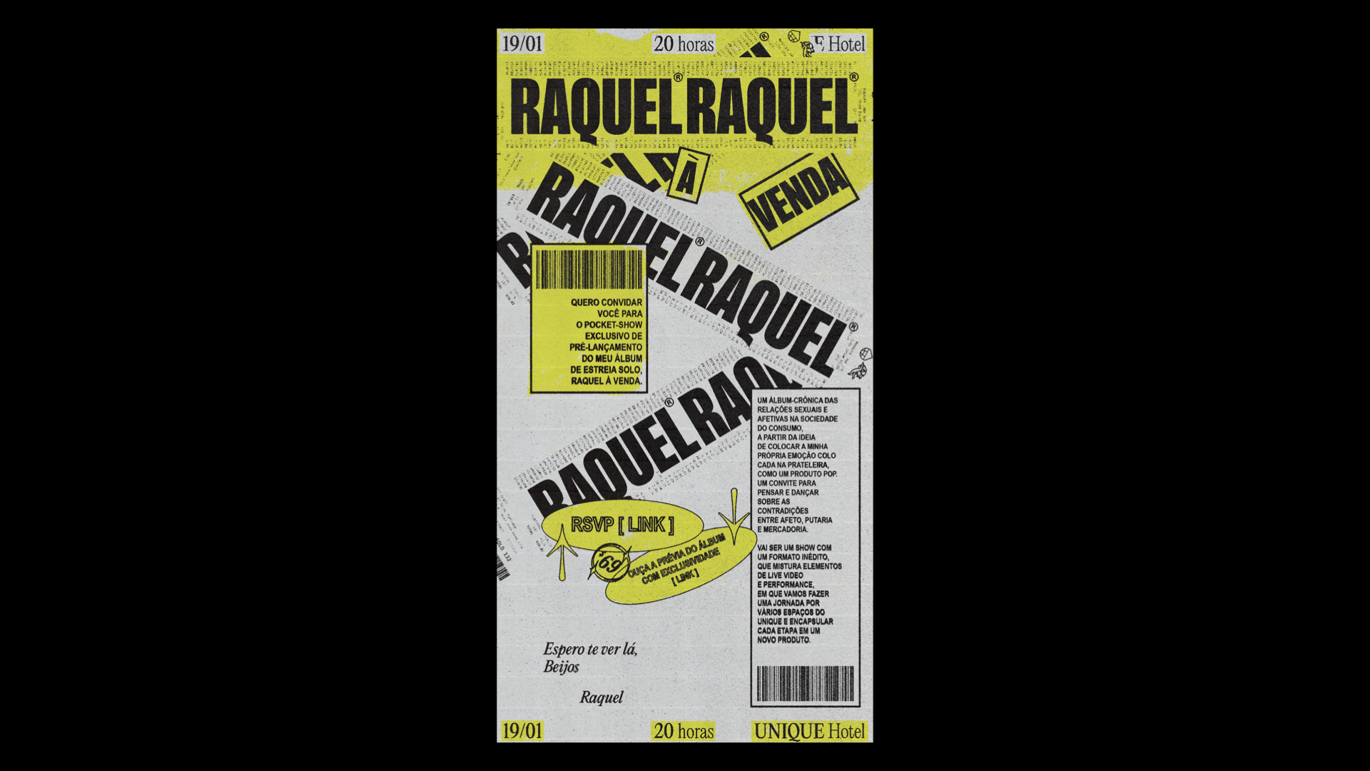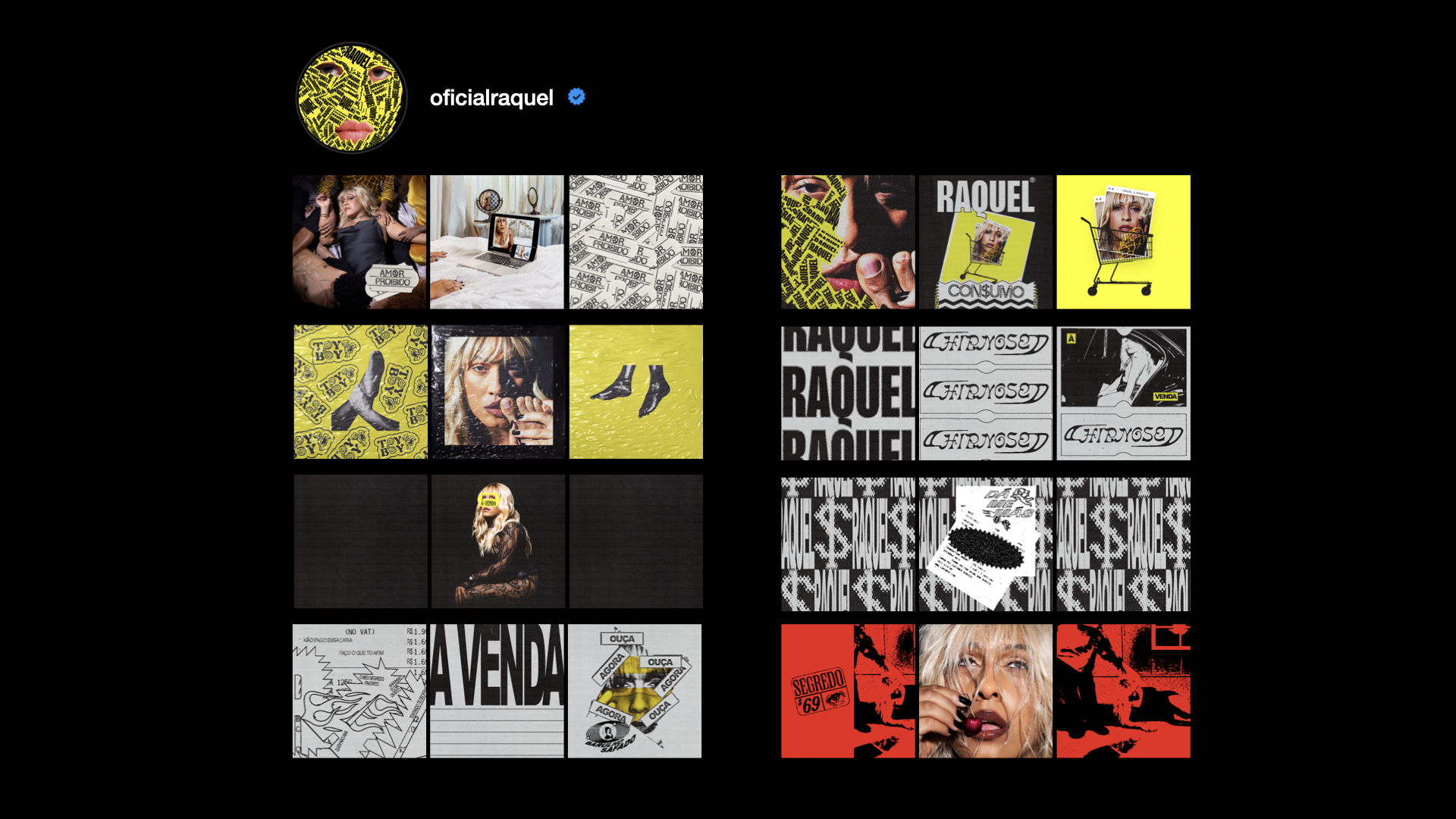 The project applications ranged from the creation of Raquel’s logo and stickers for each song, to the creation of posters, posts on social media, art direction for Raquel’s motion and “consumption” music video, digital invitations, banners, merchandising, album cover, website and more.