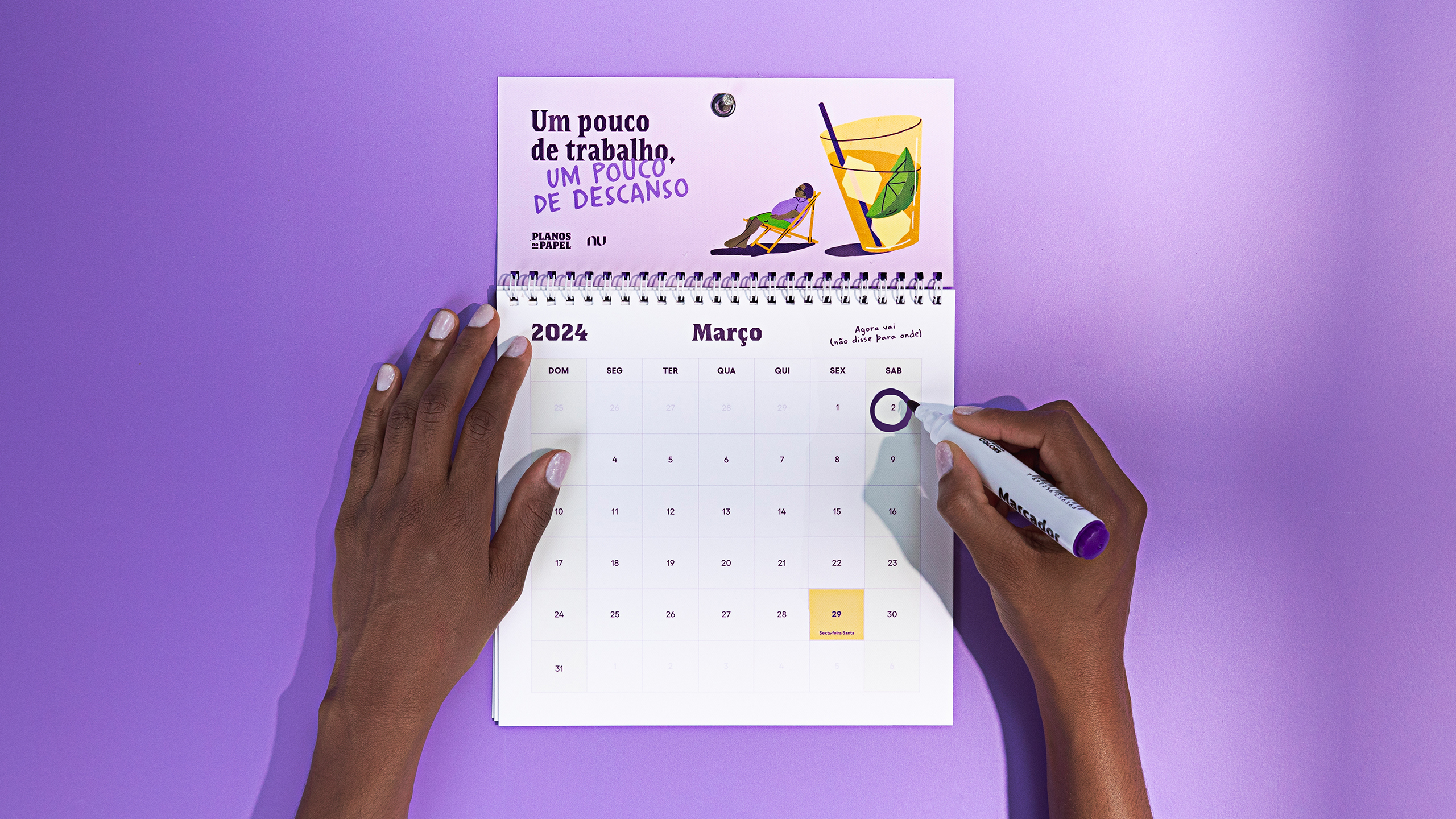 During a brand activation, Nubank brought Leslie David Baker to Brazil to star in an advertising film. In the story line, he moves to the country for retirement but ends up diving into entrepreneurship. That’s how the “Planos no Papel” stationery came to life, later materializing into a pop-up store. Influenced by the character’s life, including jazz and bossa nova, the visual identity took shape. The event’s giveaways featured illustrations highlighting the balance between relaxation and work.