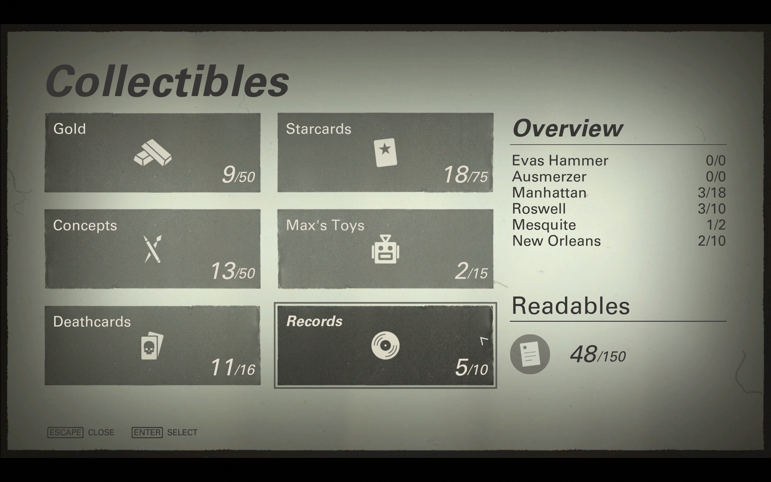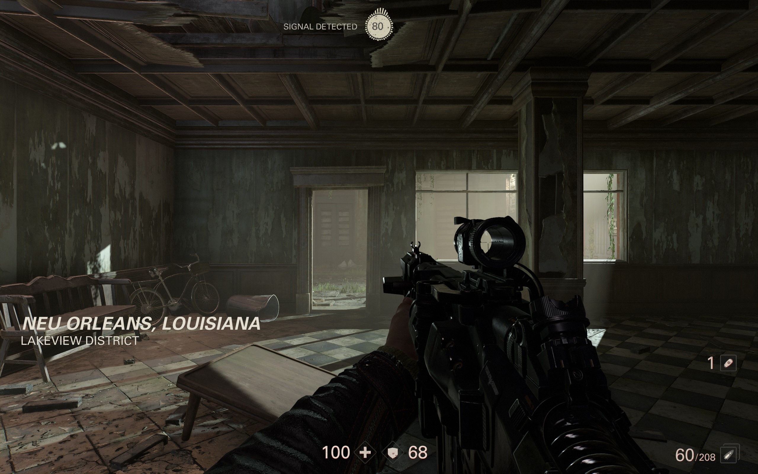 Wolfenstein 2’s user interface follows mostly the same footsteps as its previous entries’, evoking the feeling of its time period yet remaining sleek and clean. The menus take on the appearance of a dirty slide projector, whereas in-game elements such as tutorials are instead presented in a minimal look. There is a heavy usage of muted colors such as greens and oranges, with brighter colors reserved for vital information.
