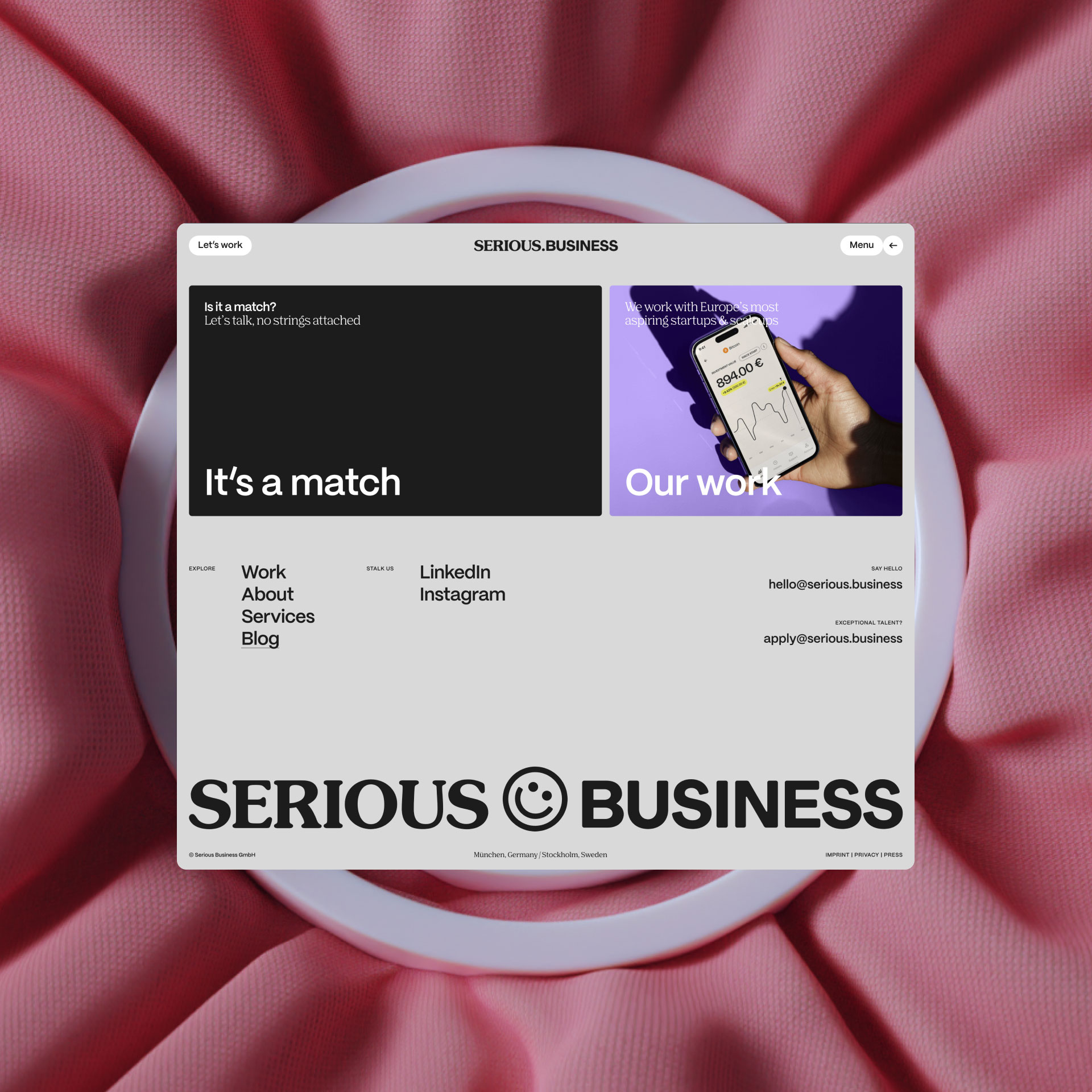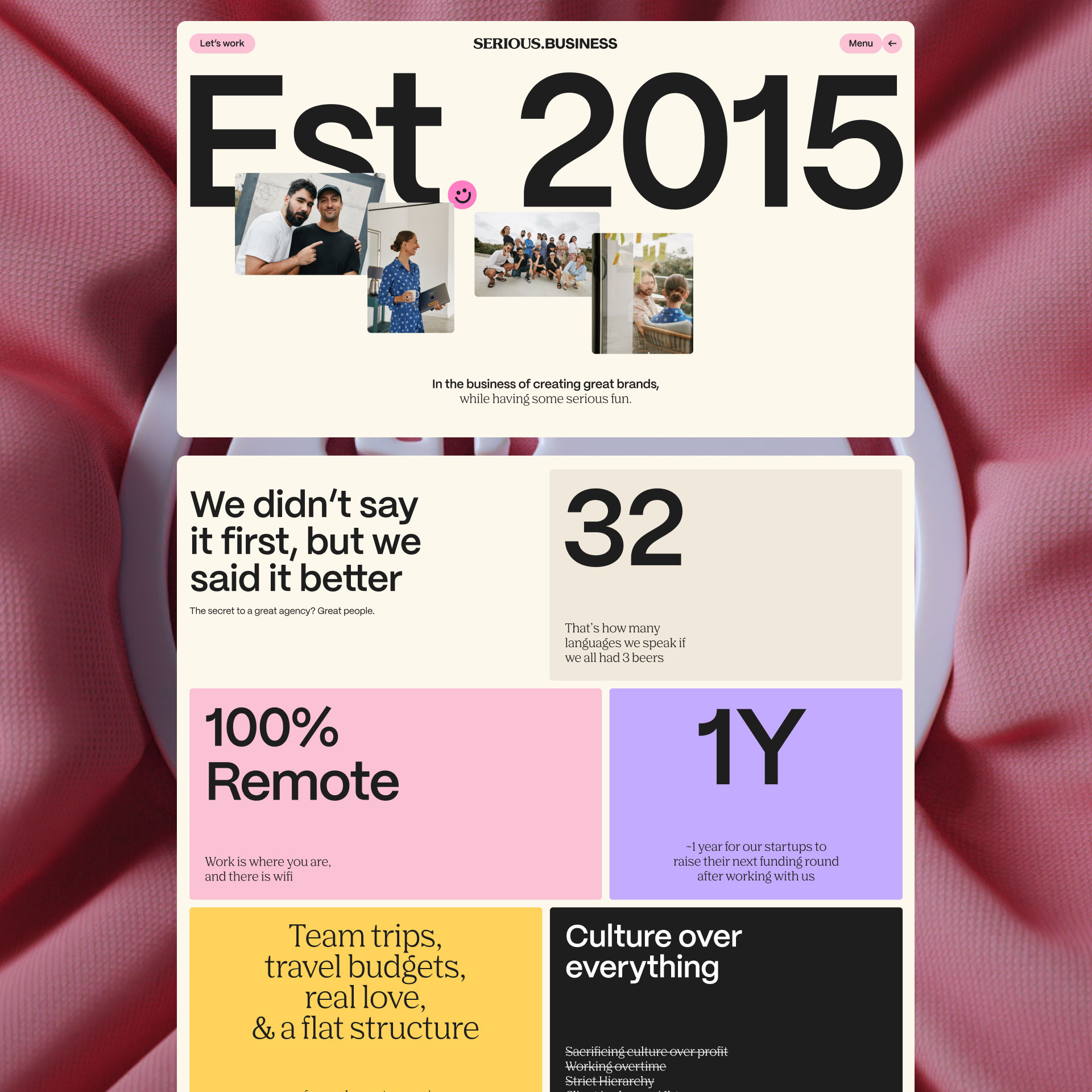 We are SERIOUS.BUSINESS, a global branding and design agency founded in 2015. We are renowned for our bold creativity and focus on human connection. The recent rebrand, reflecting our transition from a traditional office setup to a global, fully remote team, introduces a unique brand identity. This new identity embodies our playful yet professional approach to branding and underscores the belief that branding should be the most enjoyable aspect of running a company.