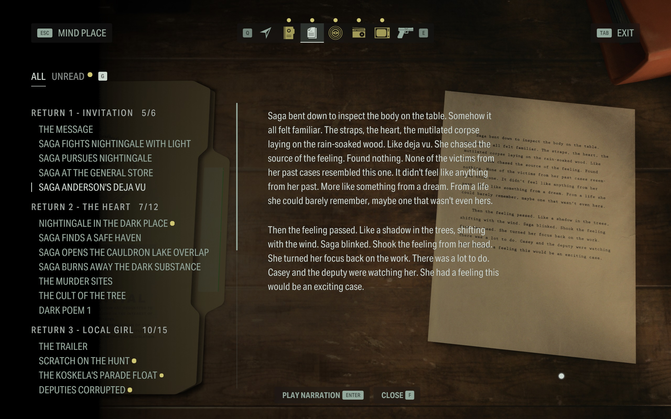 Alan Wake might’ve been gone for 13 years, but he will mostly feel at home when he sees the typography which seems to reuse the first game’s stylings as a basis. The Alan Wake 2 logo is set in Compacta, a condensed bold typeface. Most of the game’s user interface is set in Aktiv Grotesk Condensed Regular, with Bold being used more sparingly. Compacta is reused for the title card in beginning of every chapter.