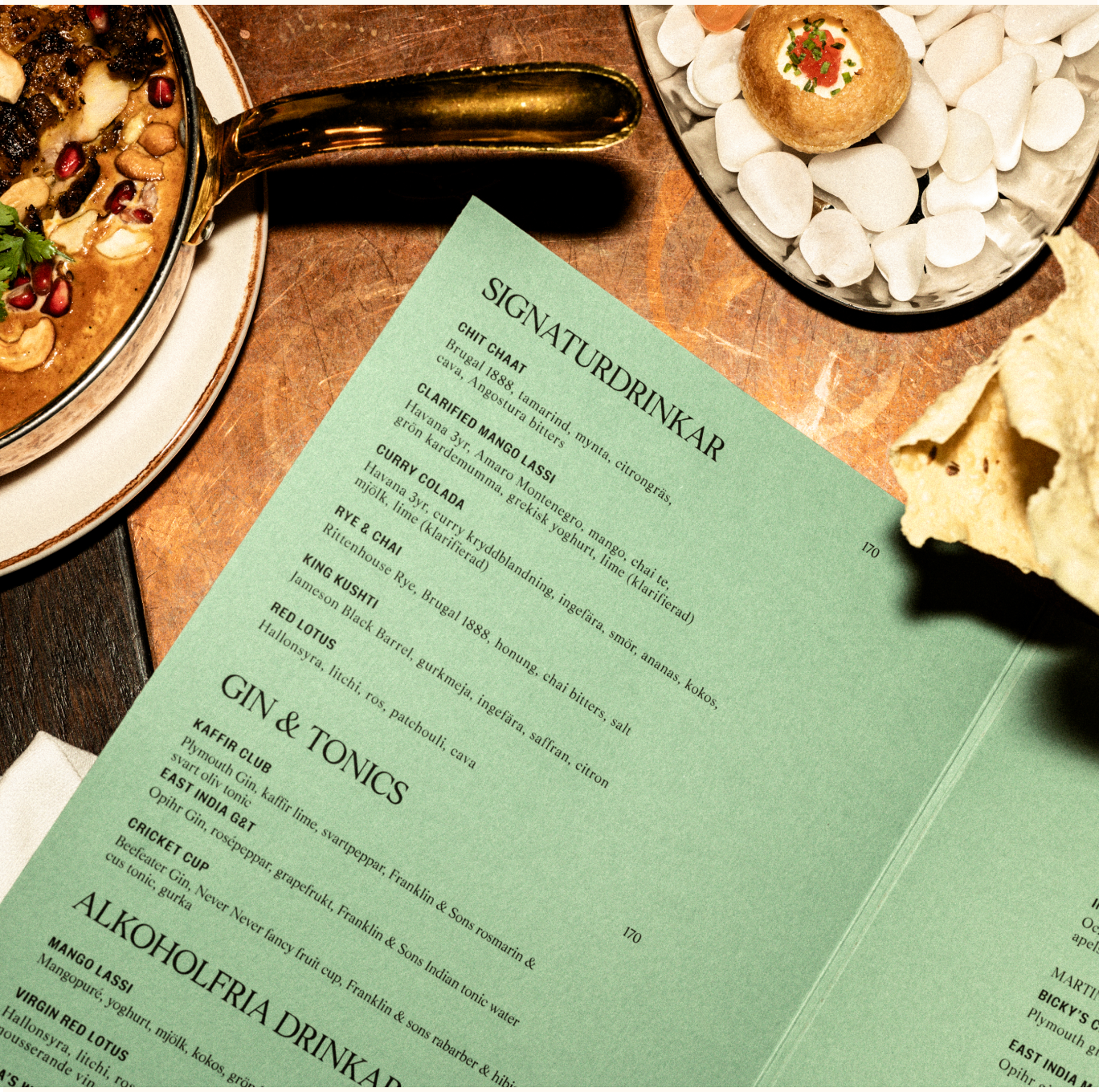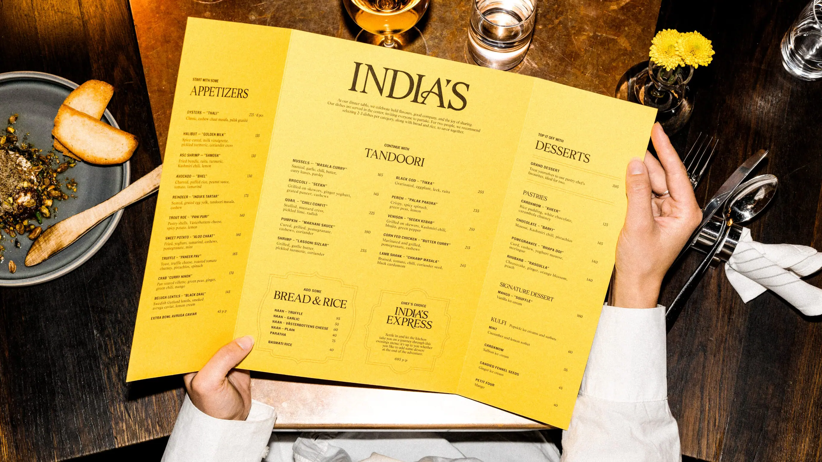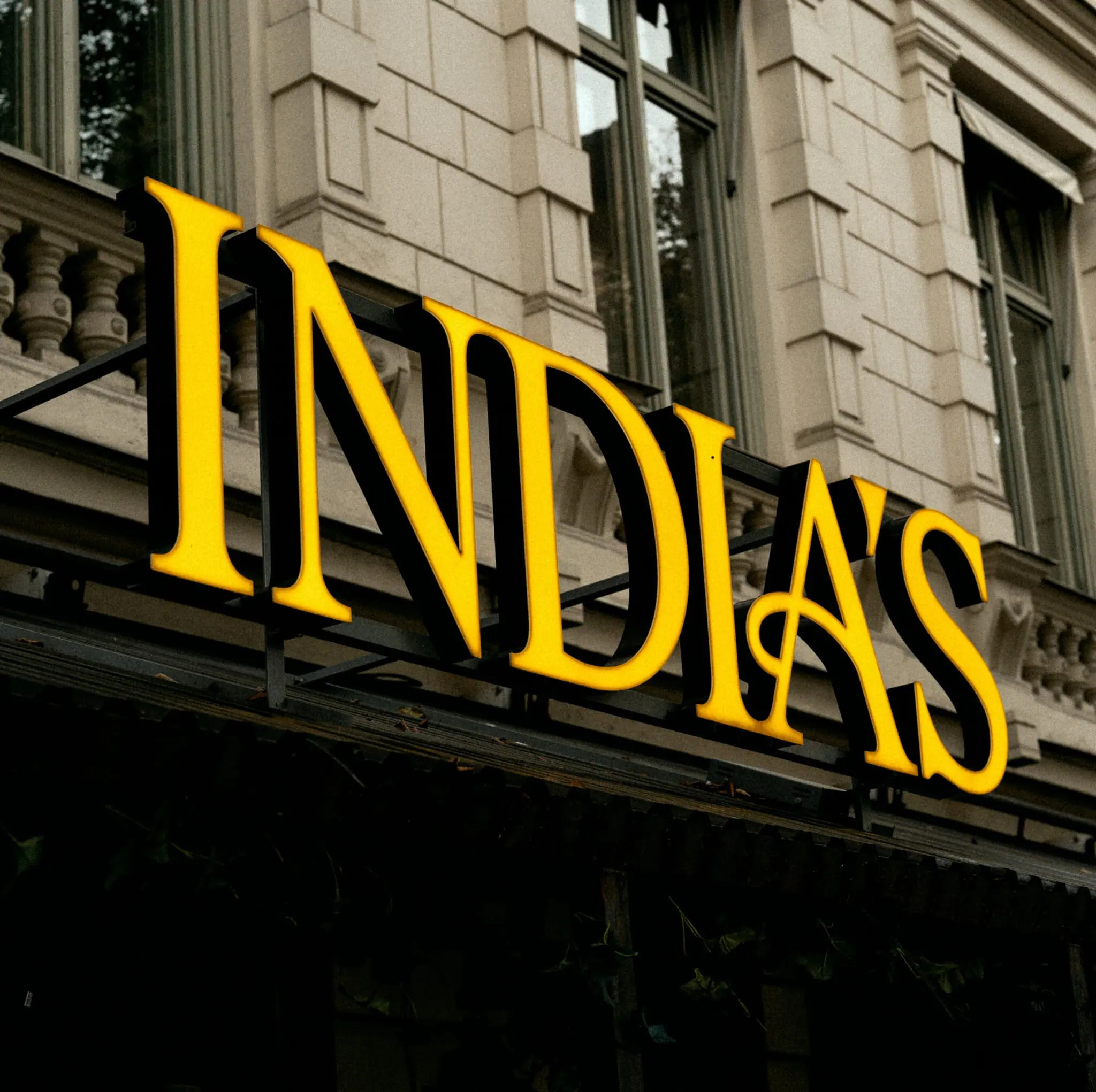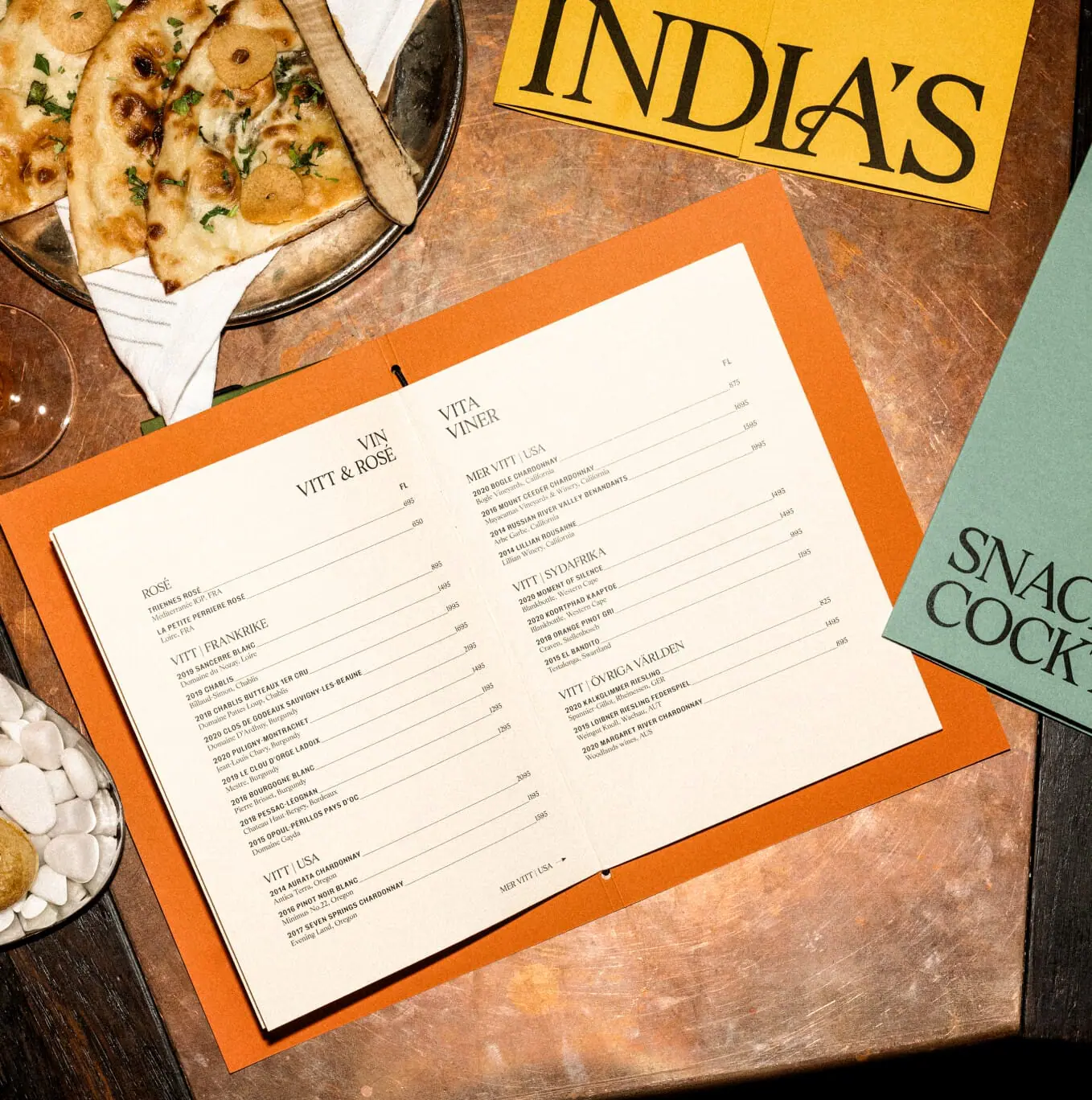 India’s is a restaurant created by chef Jonas Svensson, named after the daughter of the late entrepreneur Bicky Chakraborty, who was a close friend of Jonas. The restaurant serves traditional Indian cuisine with modern, innovative influences, bringing warmth, vibrant colors, and rich aromas of incense and spices into every dish. We developed the visual identity, including signage, menus, website and a hand-painted mural.