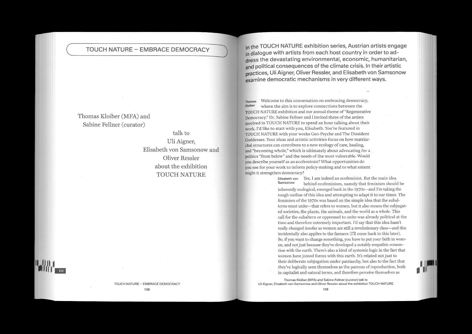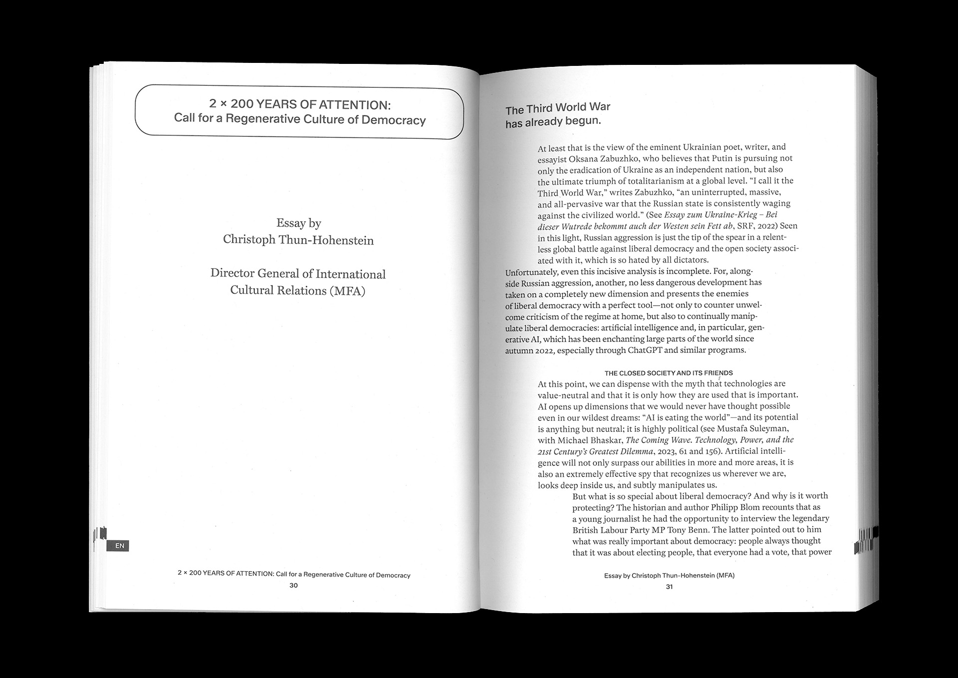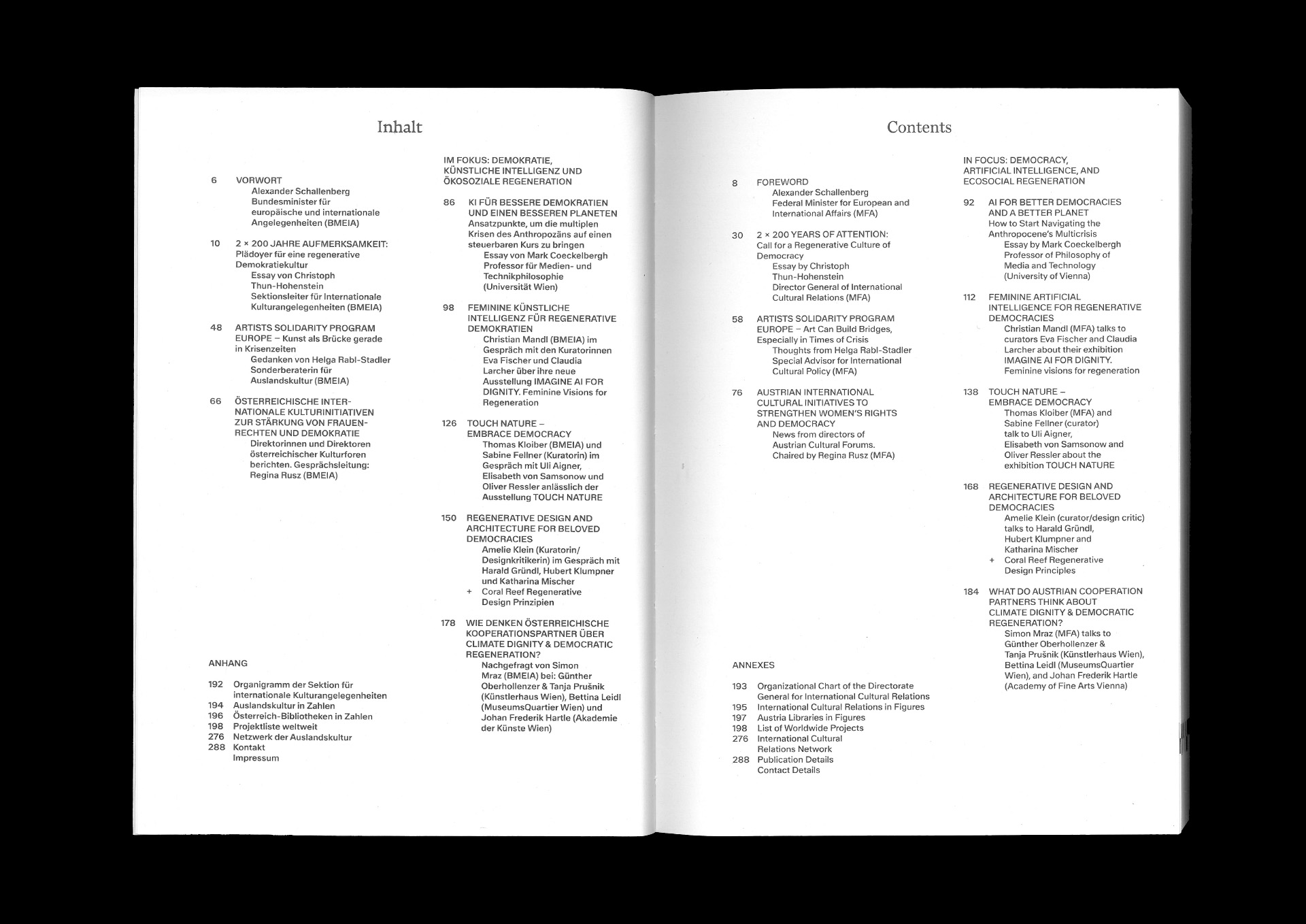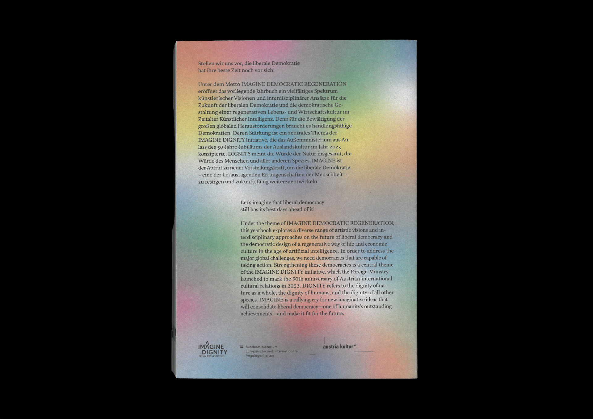 Under the theme of “Imagine Democratic Regeneration”, this yearbook explores a diverse range of artistic visions and interdisciplinary approaches on the future of liberal democracy and the democratic design of a regenerative way of life and economic culture in the age of artificial intelligence. It was published by the Federal Ministry for European and International Affairs – Directorate General for International Cultural Relations, Vienna 2024. The bilingual publication (German and English) is available for download from the Ministry’s website.