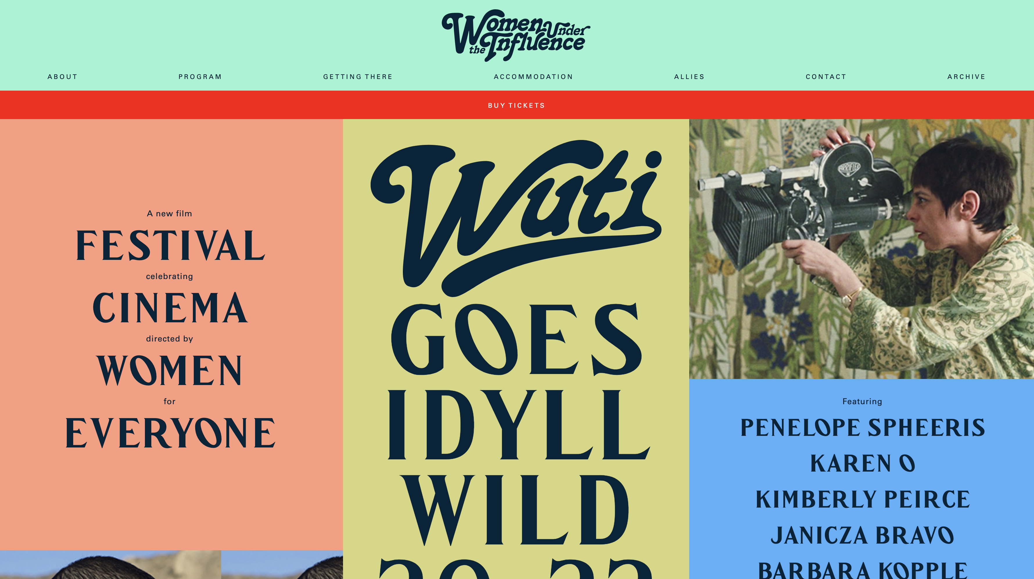 Wuti goes IdyllWILD was a film festival organized in 2019. It piqued our interest not only for its collection of female directors, but also its identity designed by the brilliant Claire Huss. The website combines an early version of Cabina Etc (then known as Rockledge WUTI) with Univers. The WUTI logo is loosely based on the Letraset classic Tango.