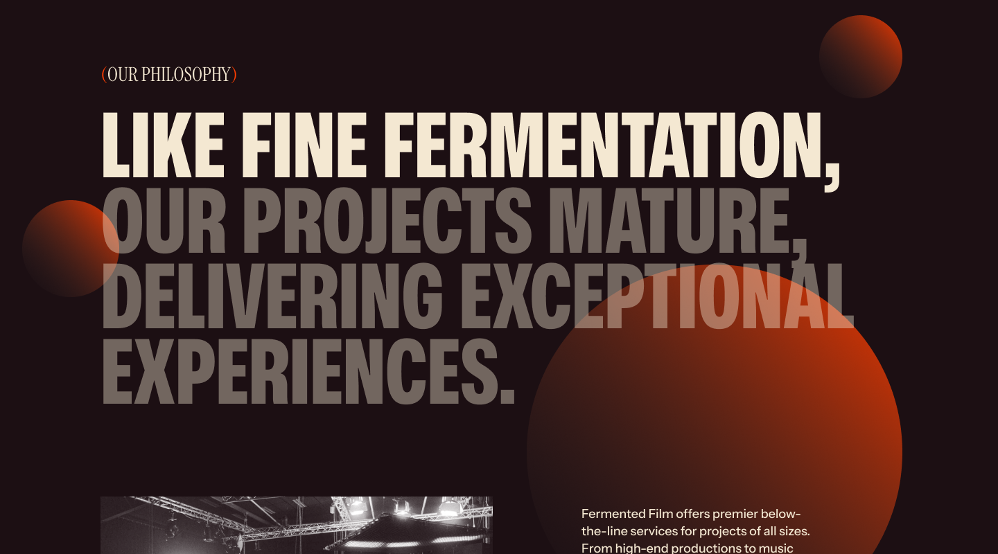 Fermented Film offers premier below-the-line services for projects of all sizes. From high-end productions to music videos, documentaries, and stage builds, we excel in coordinating locations and managing set construction.
