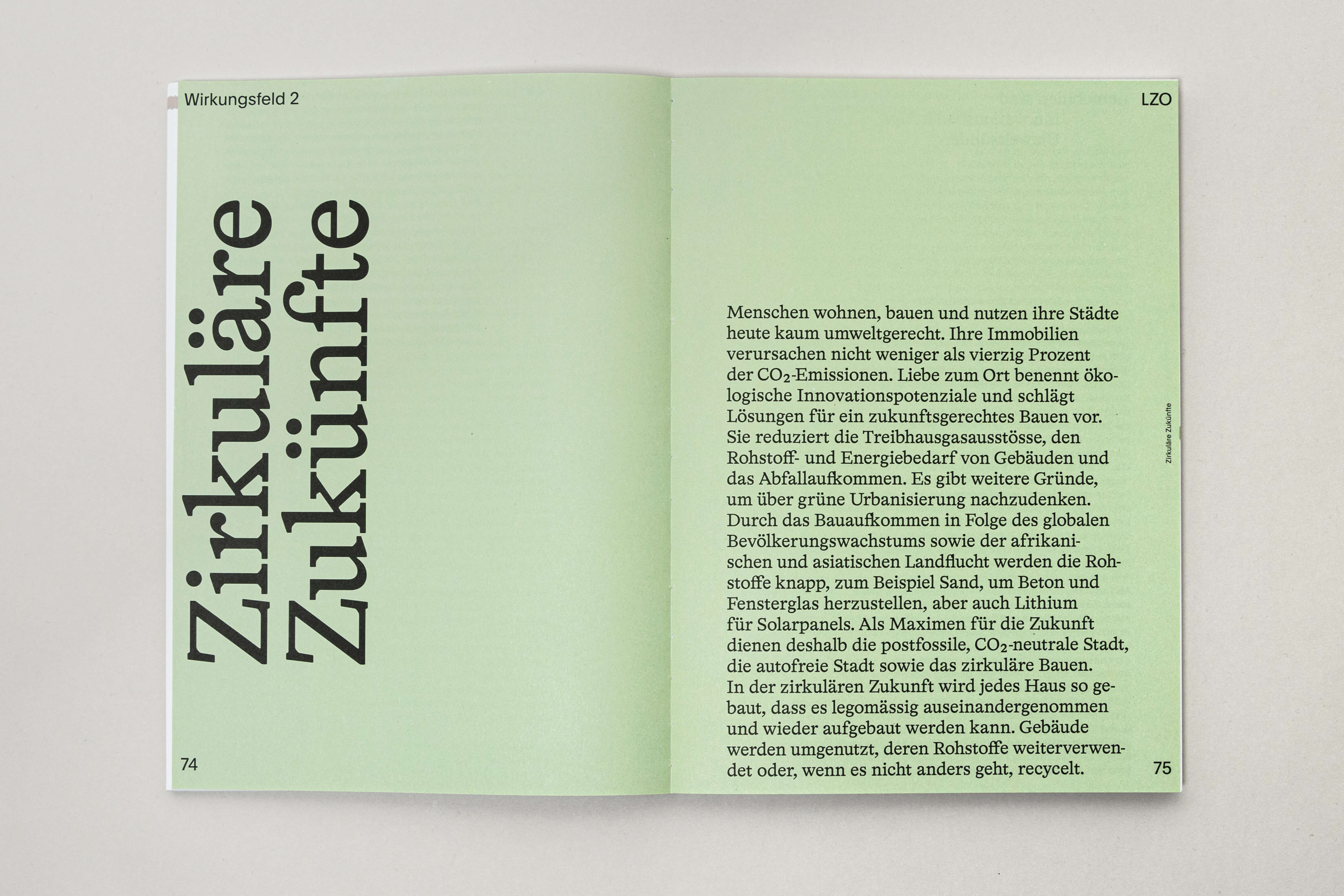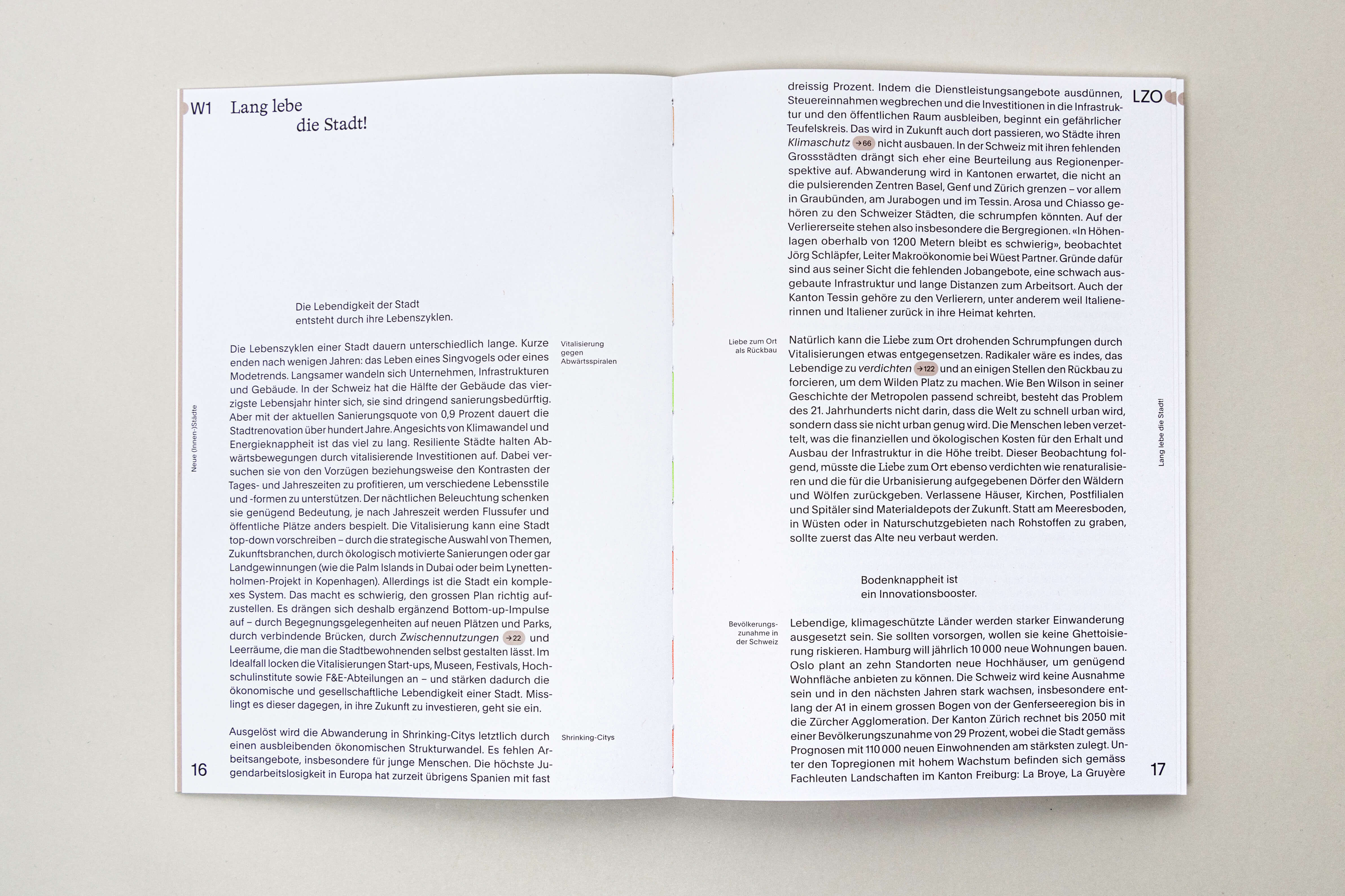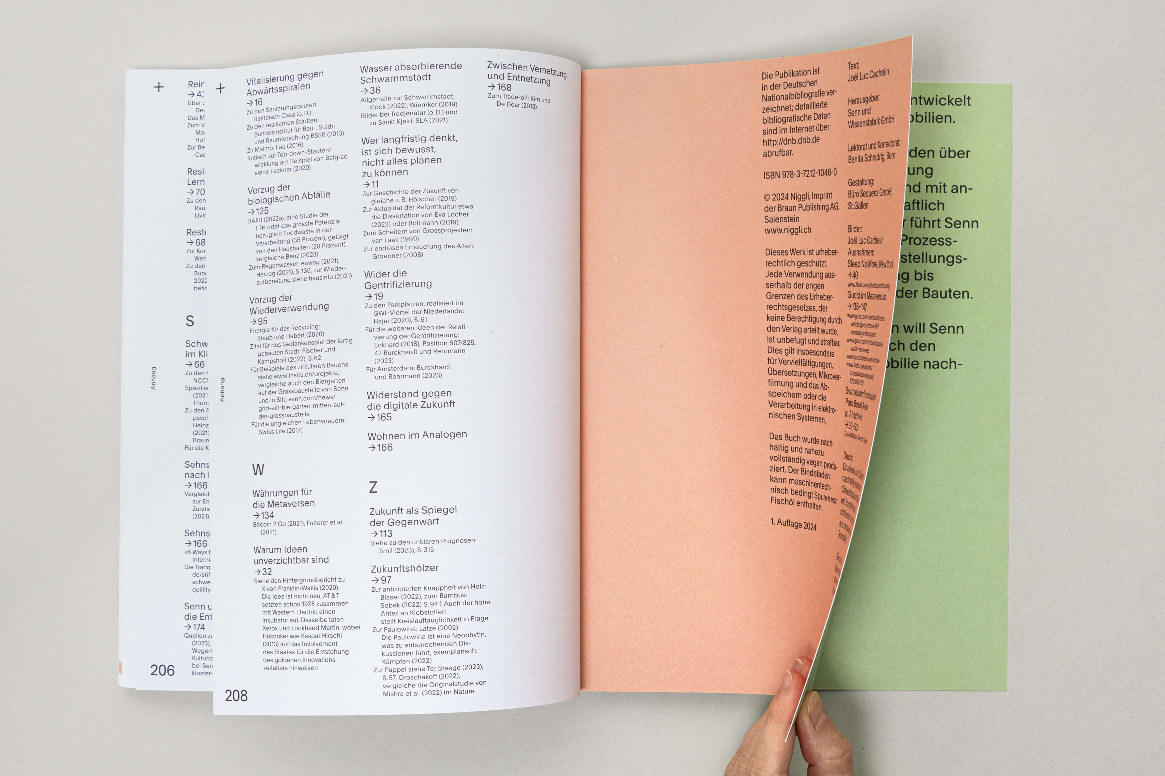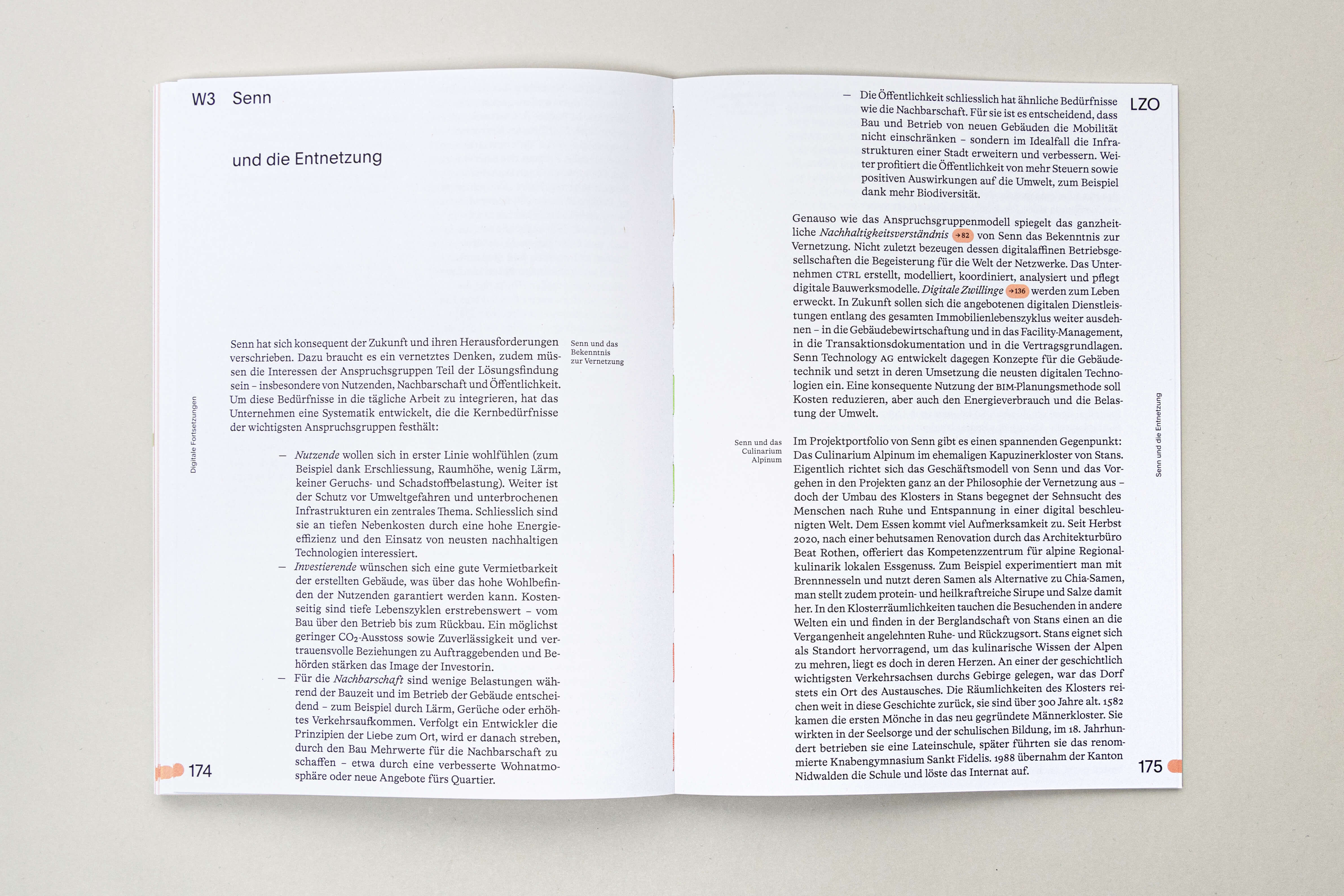 In the publication Liebe zum Ort – Zukunftsgerechte Städte, futurologist Joël Luc Cachelin collects the most important challenges for the future that cities will be confronted with in the years to come. The book, commissioned by Senn, was published in German by the Swiss publisher Niggli (204 pages, 19×26.5 cm, softcover with thread stitching, ISBN 978–3–7212–1046–0), printed by Druckerei Lutz AG and designed by Büro Sequenz, St. Gallen. It was typeset in Plain (Optimo) and HAL Timezone (HAL Typefaces).