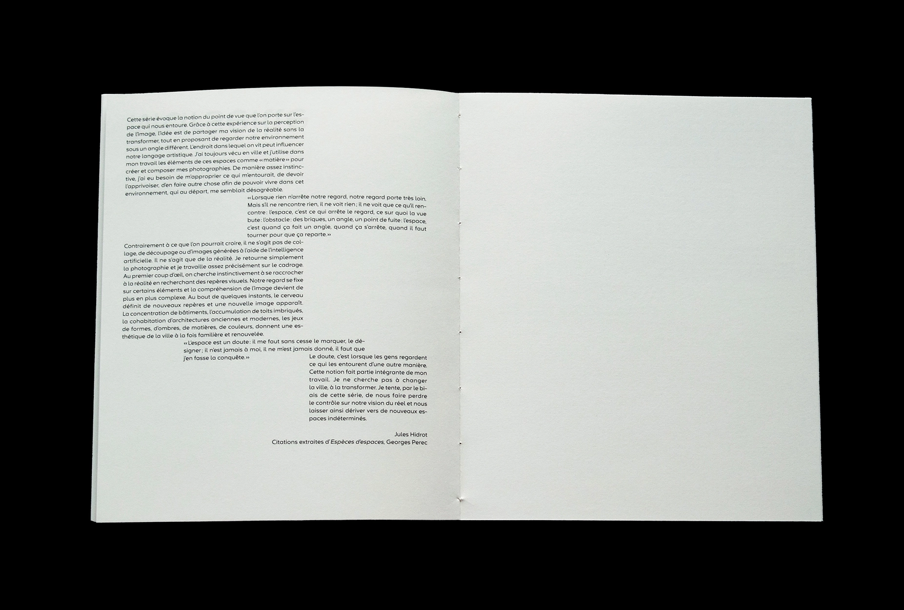 The graphic design and layout of L’espace est un doute were handled by Sarah Fattouh, who translated Hidrot’s universe into a clean yet impactful design. The Neue Tarasque typeface by Blaze Type reinforces the sense of fragmentation and doubt present in the photographs, subtly adding a typographic dimension to the overall work. The printing was done by Tomoe, while the binding was expertly executed by Cléo Lebrun, giving the book a refined finish.