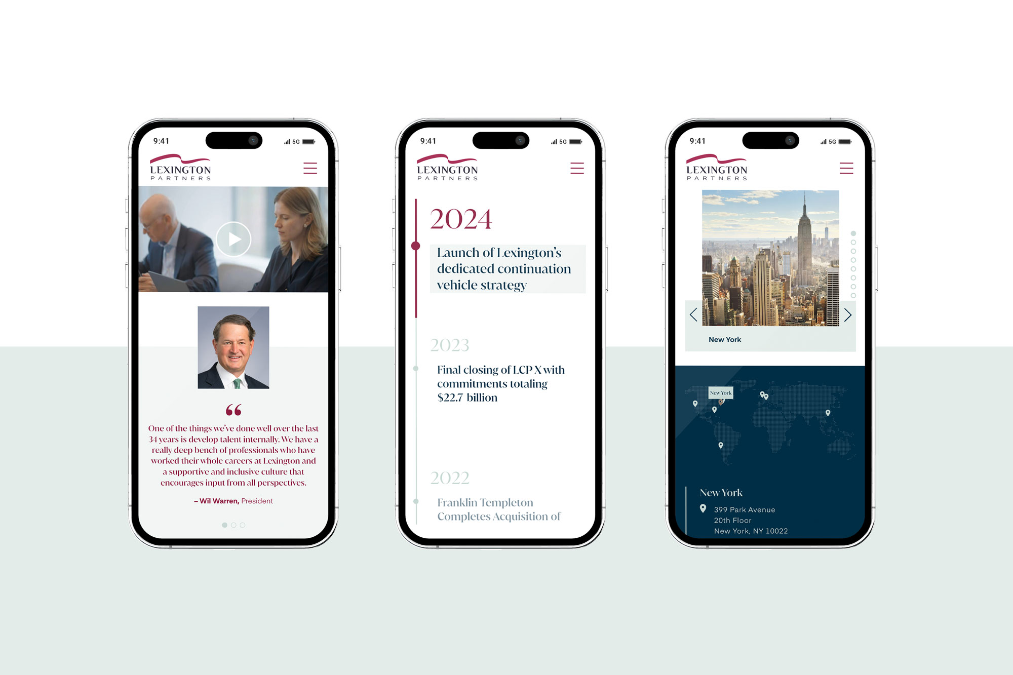 Lexington Partners sought to rejuvenate its brand to reflect its legacy of consistency and quality while positioning itself for a dynamic future. The rebrand, anchored in the mantra “The extraordinary power of stability,” bridges Lexington’s history with its forward-looking vision. Leibowitz retained core elements like the iconic maroon and wave motif, while introducing contemporary typography, imagery, and color to create a visual identity that feels both timeless and modern. Bespoke photography and a refreshed logo optimized for diverse applications further reinforce Lexington’s sophistication and reliability. This cohesive visual language, paired with strategic messaging, solidifies Lexington’s reputation as a leader in the industry, uniting its team and clients under a bold yet familiar brand presence.