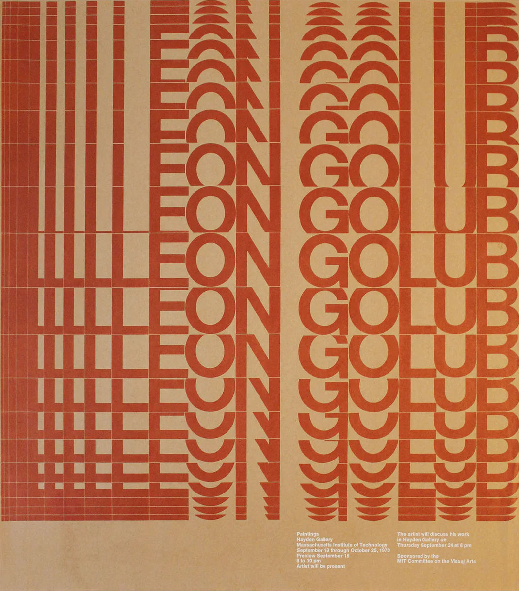 She designed the poster (see last image) for this exhibition of which she said: “Golub used strong, sweeping, horizontal brushstrokes. I wanted the type to respond to his technique and the colors to his sober subject matter.”